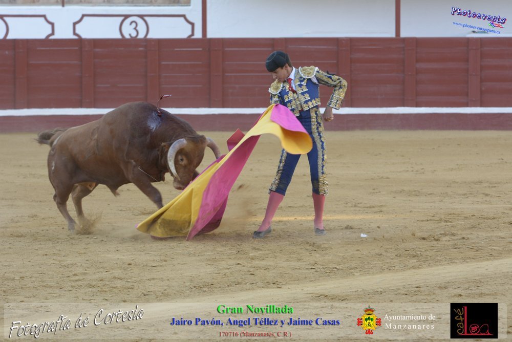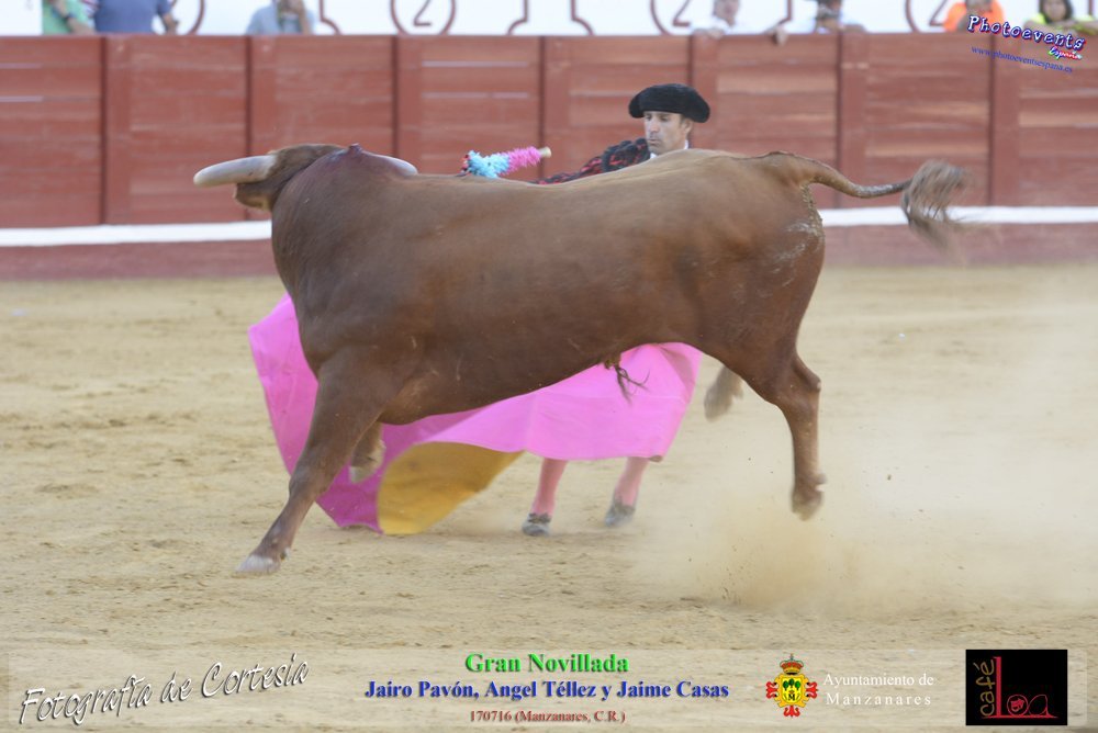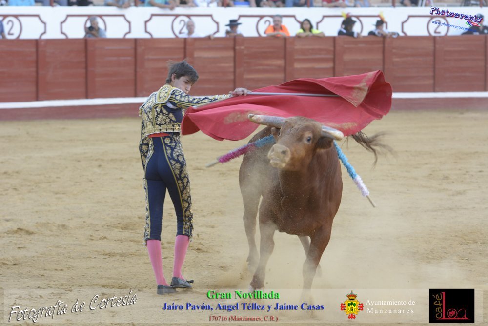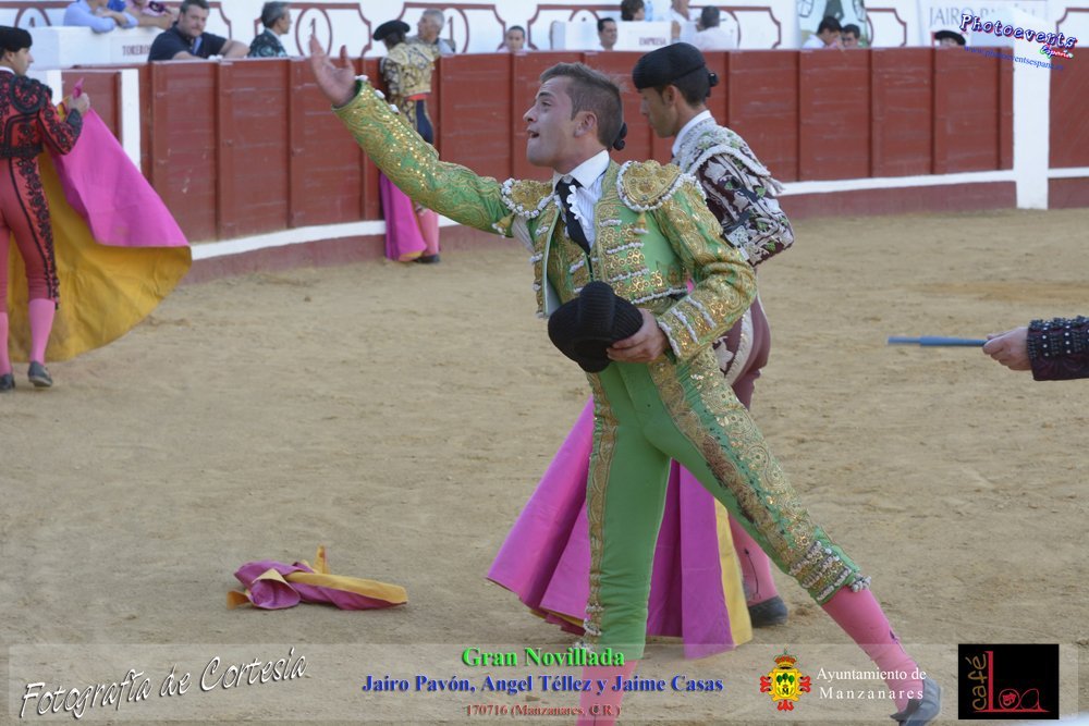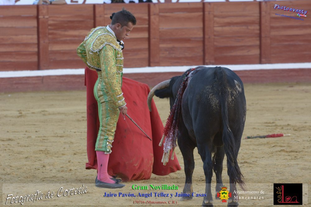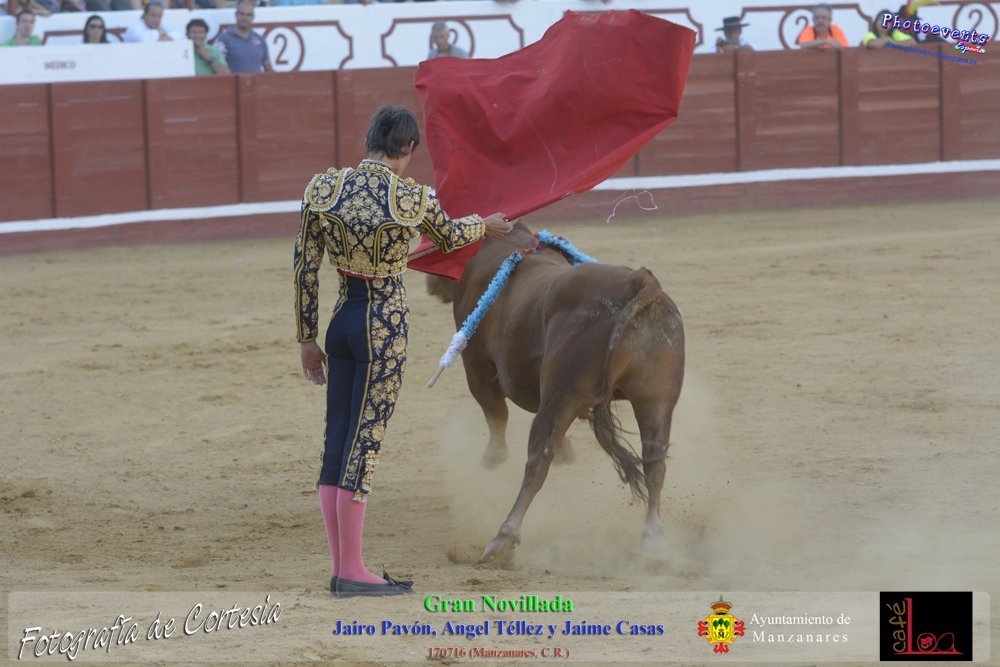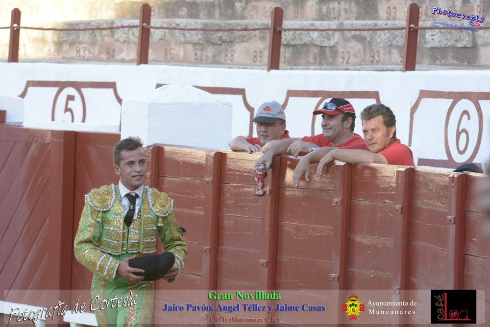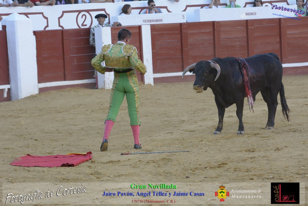 Fotografías realizadas durante la novillada que tuvo lugar en la plaza de Toros de Manzanares , con motivo de la Feria y Fiestas, para los novilleros Jairo Pavón , Ángel Tellez y Jaime Casas. Lidiando 6 novillos de las ganaderías Fernando Peña y el Jaral de la Mira. El evento tuvo lugar el pasado día 170716 en la localidad de Manzanares, Ciudad Real