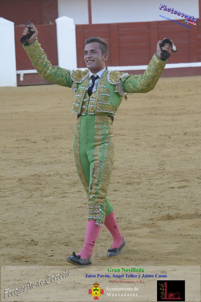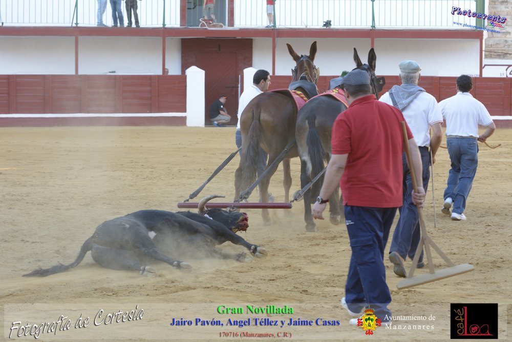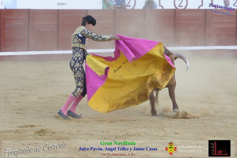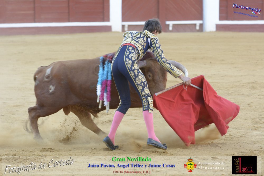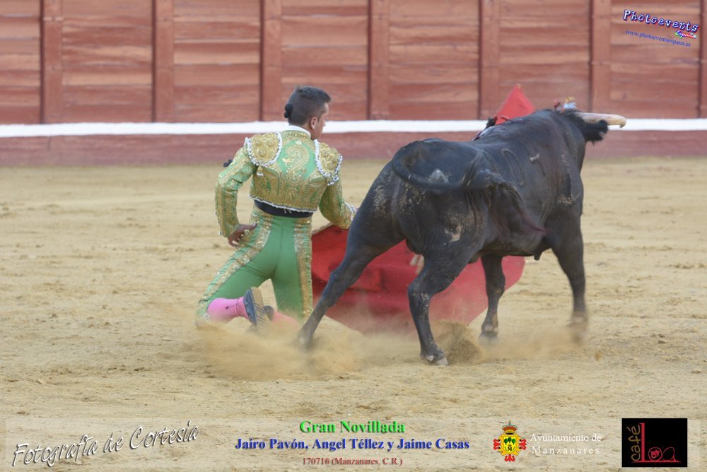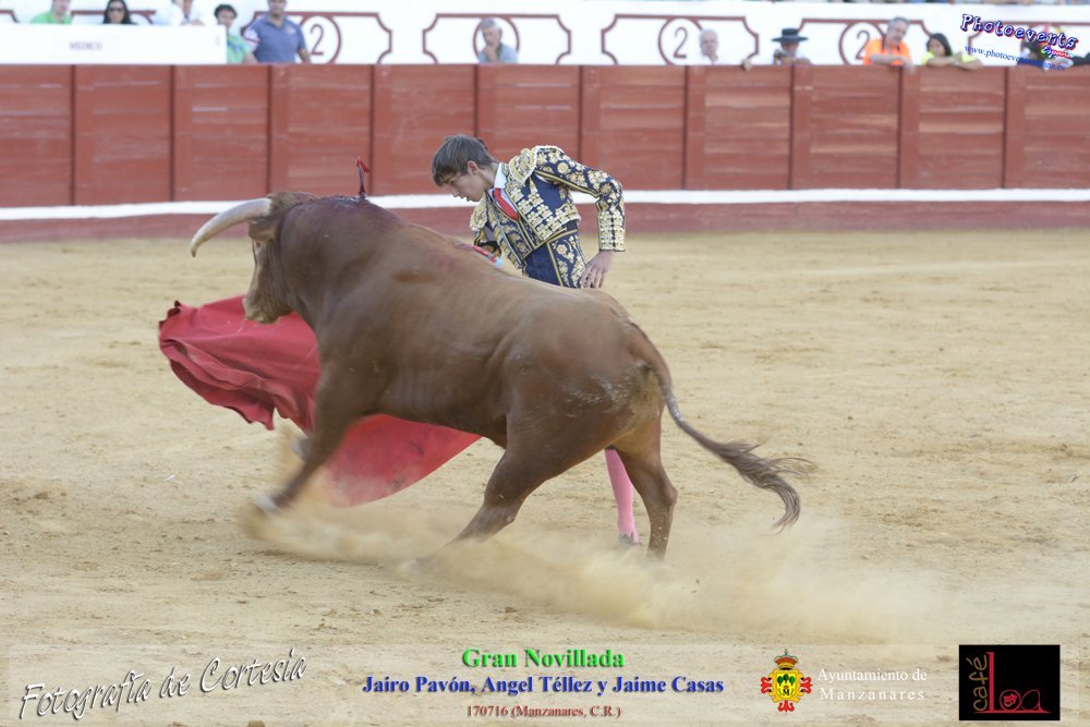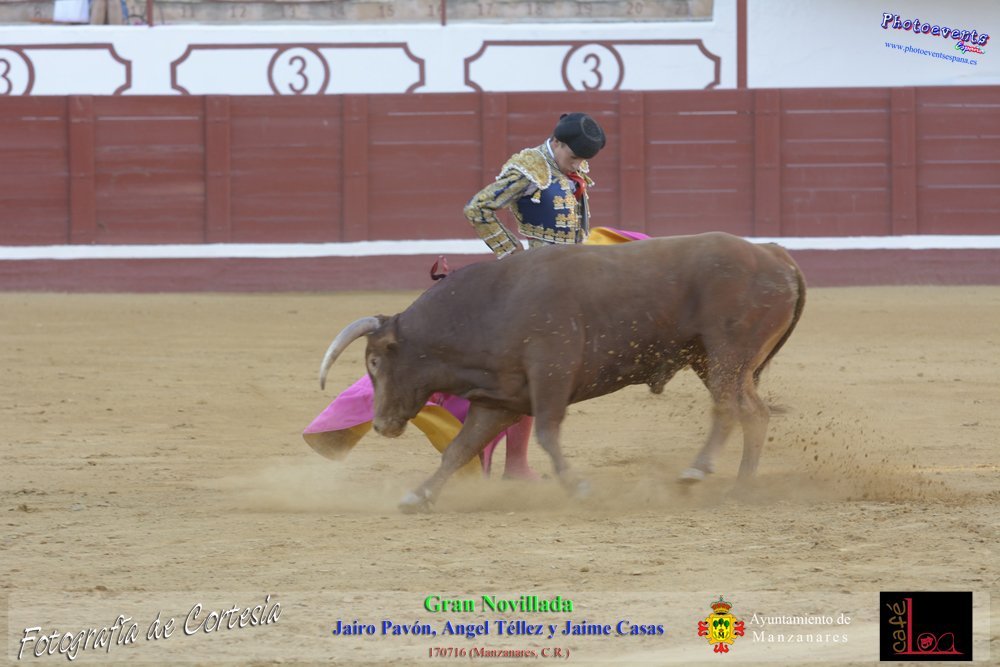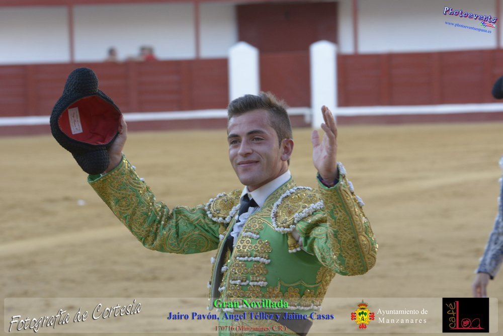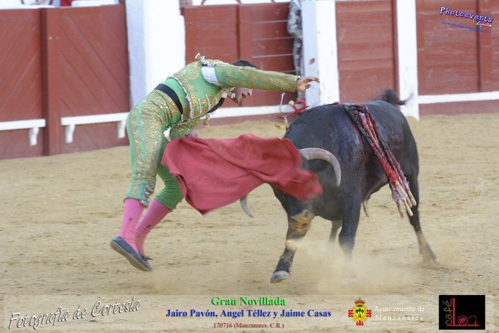 Fotografías realizadas durante la novillada que tuvo lugar en la plaza de Toros de Manzanares , con motivo de la Feria y Fiestas, para los novilleros Jairo Pavón , Ángel Tellez y Jaime Casas. Lidiando 6 novillos de las ganaderías Fernando Peña y el Jaral de la Mira. El evento tuvo lugar el pasado día 170716 en la localidad de Manzanares, Ciudad Real