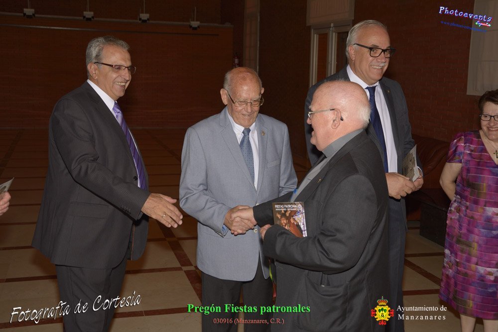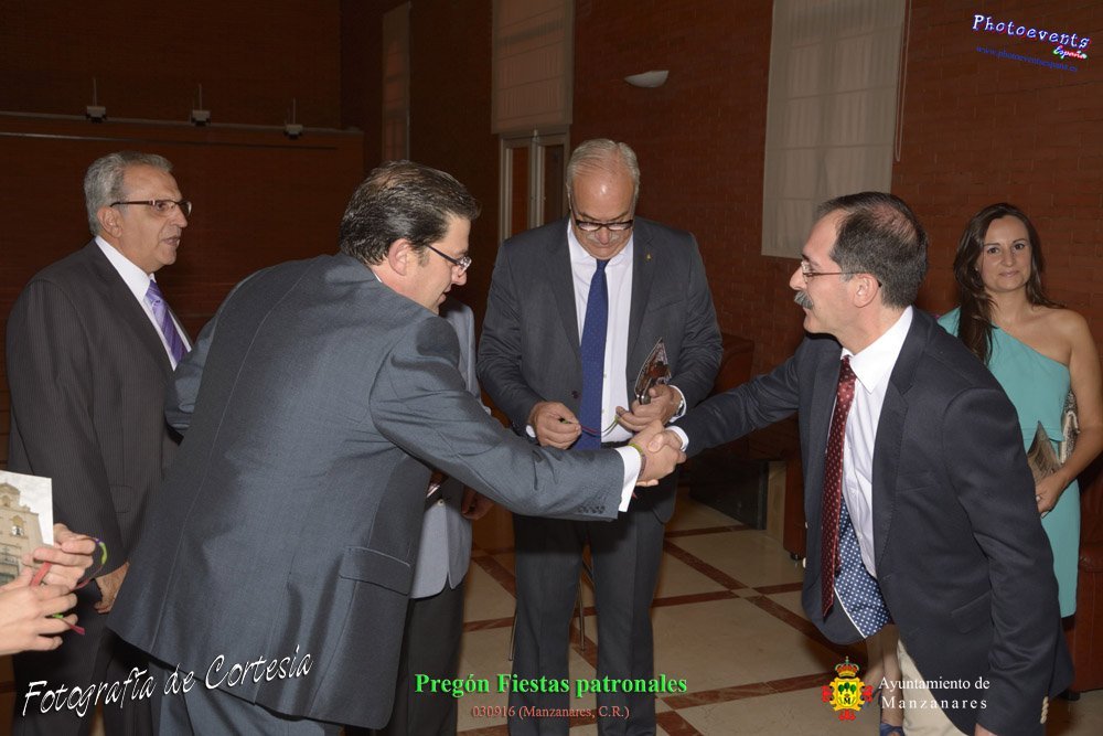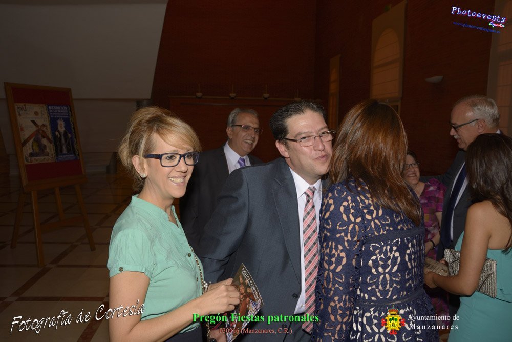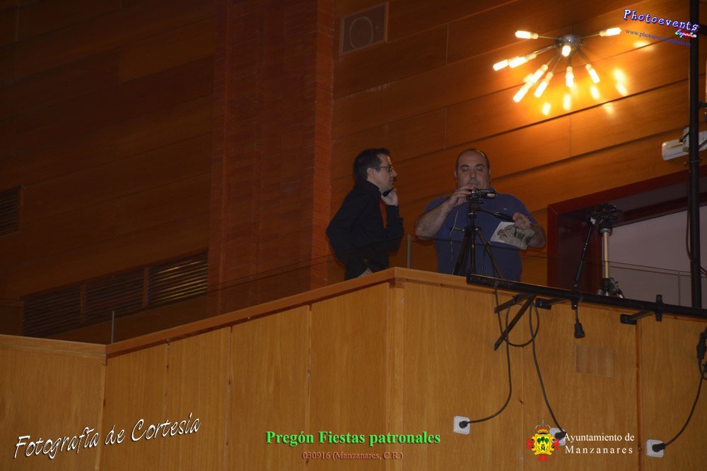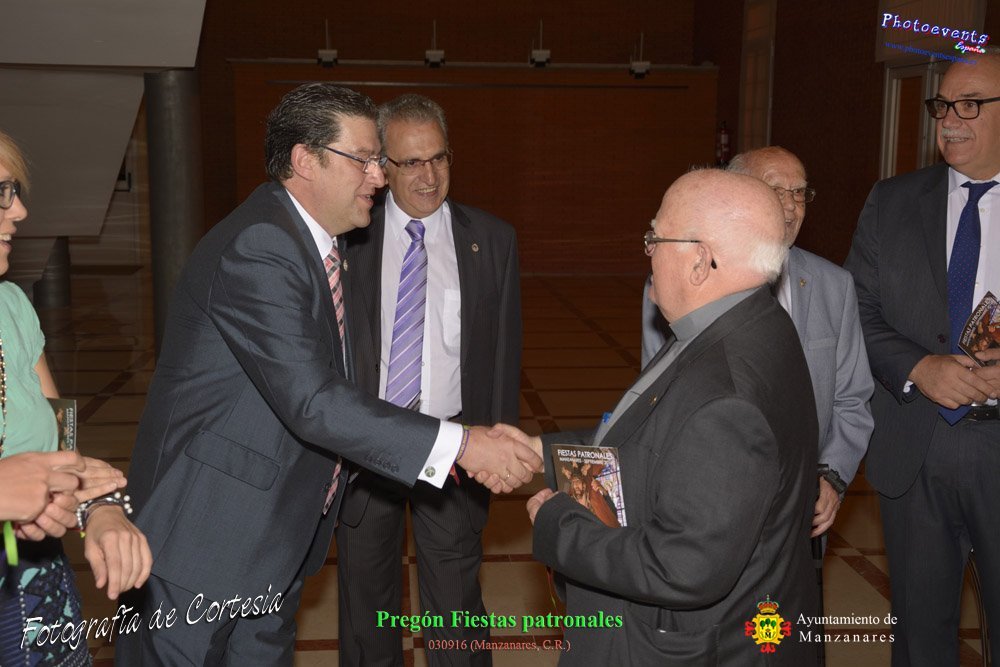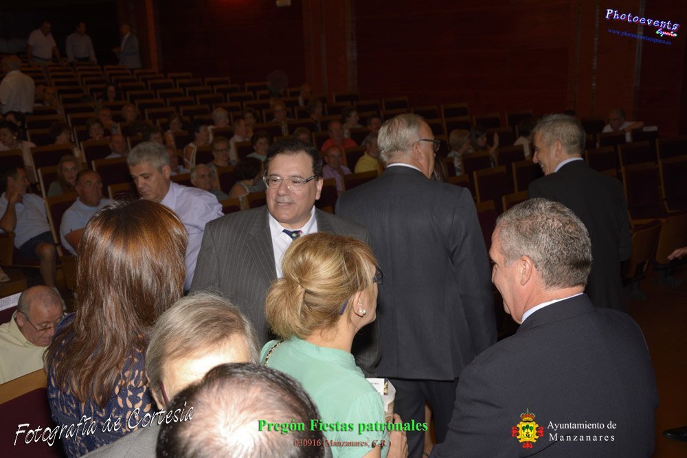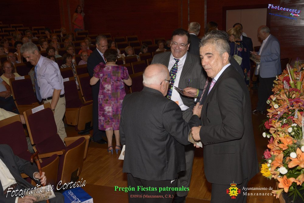 Fotografías realizadas durante el pregón de las fiestas patronales 2016, en honor a Nuestro Padre Jesús del Perdón, siendo el encargado este año D. Julián Gomez-Cambronero Pacheco (Hijo Predilecto de Manzanares), que recogió el testigo de la mano del pregonero del pasado año 2015 D. Jerónimo Calero Calero. El acto contó con la presencia de distintos miembros de la corporación municipal y provincial, asi como miembros de la Hermandad Ntro. Padre Jesús del Perdón. El acto tuvo lugar el día 030916 en el Gran Teatro de la localidad de Manzanare, Ciudad Real .