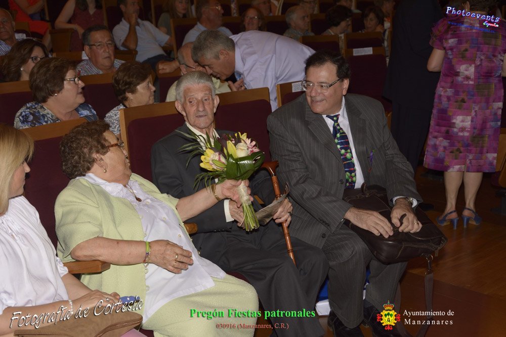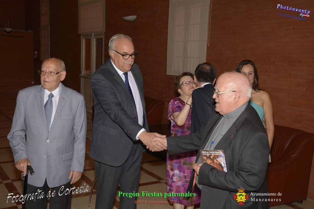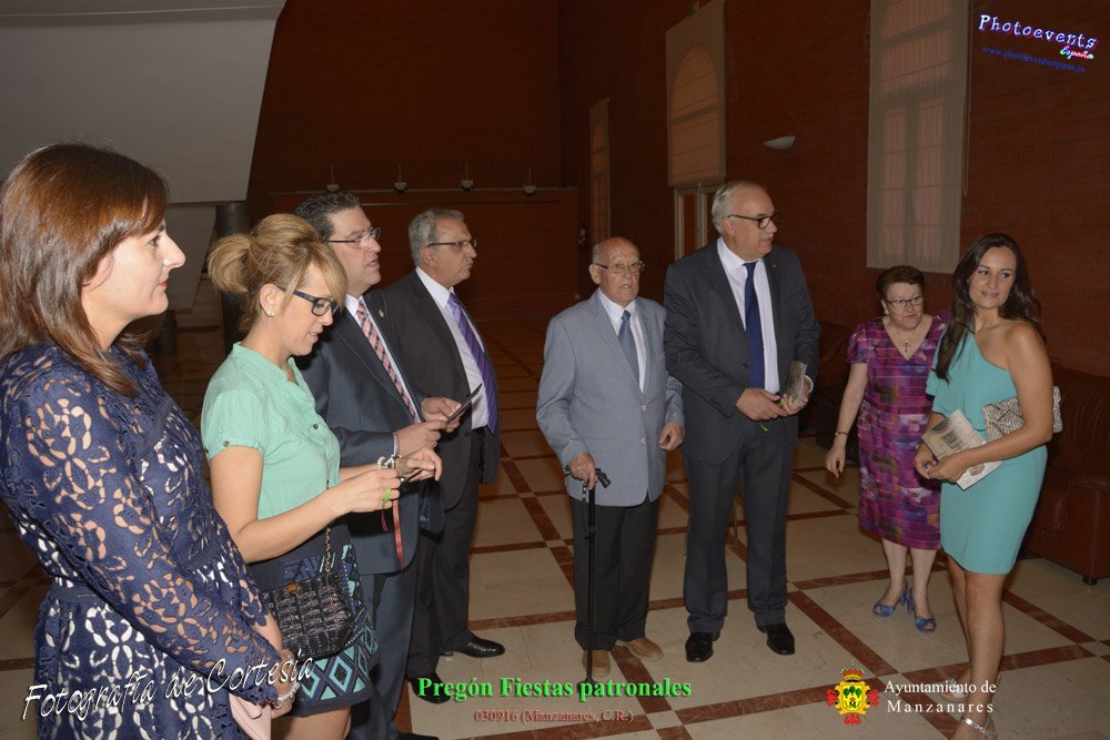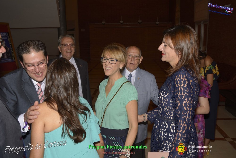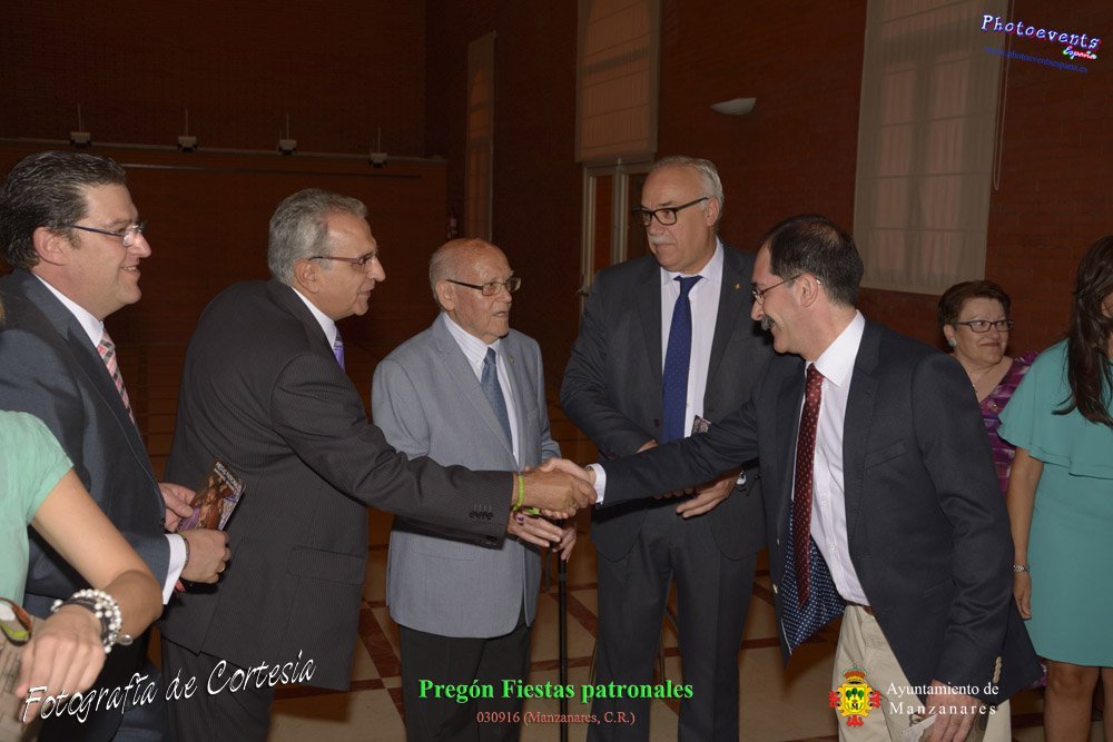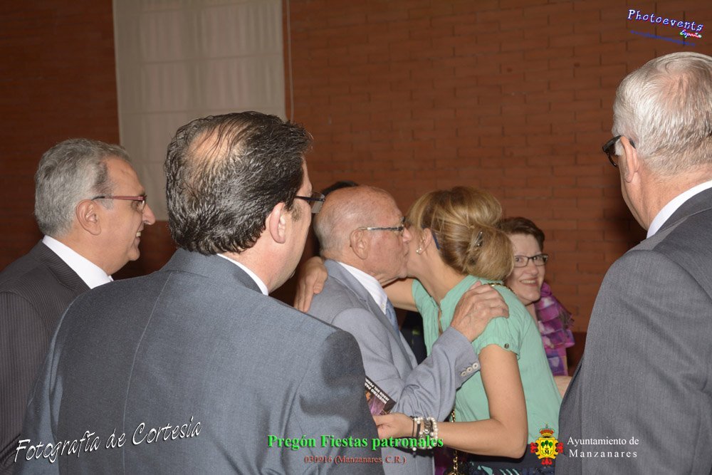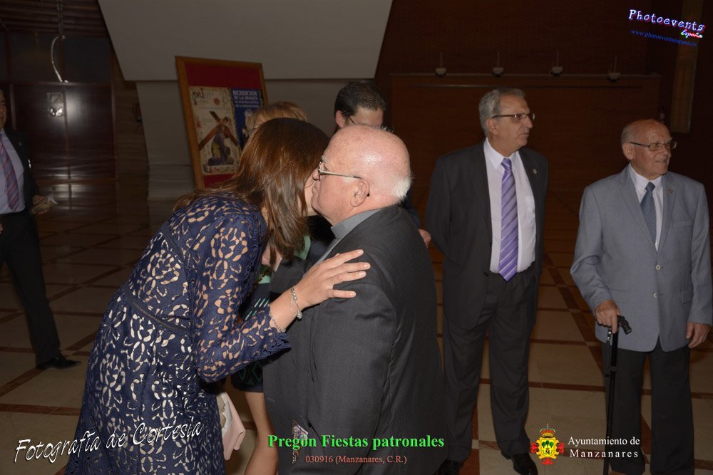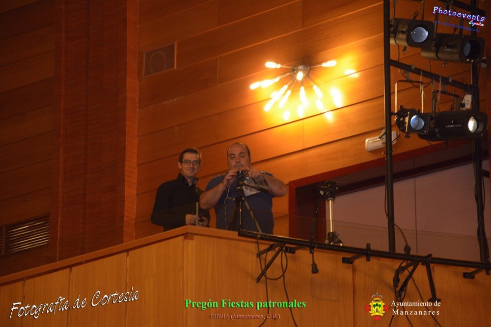 Fotografías realizadas durante el pregón de las fiestas patronales 2016, en honor a Nuestro Padre Jesús del Perdón, siendo el encargado este año D. Julián Gomez-Cambronero Pacheco (Hijo Predilecto de Manzanares), que recogió el testigo de la mano del pregonero del pasado año 2015 D. Jerónimo Calero Calero. El acto contó con la presencia de distintos miembros de la corporación municipal y provincial, asi como miembros de la Hermandad Ntro. Padre Jesús del Perdón. El acto tuvo lugar el día 030916 en el Gran Teatro de la localidad de Manzanare, Ciudad Real .