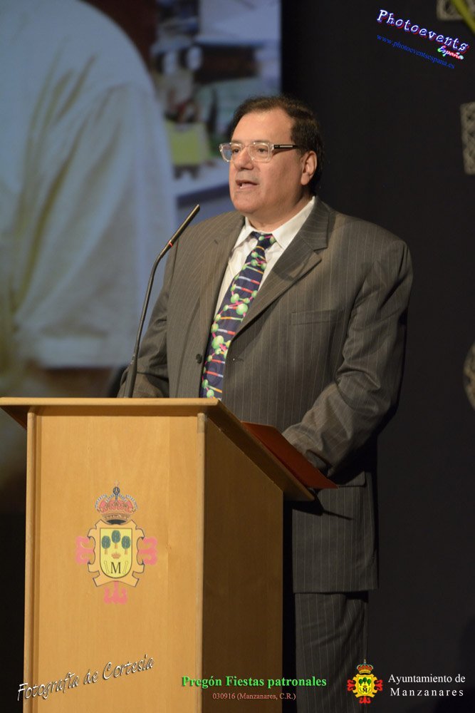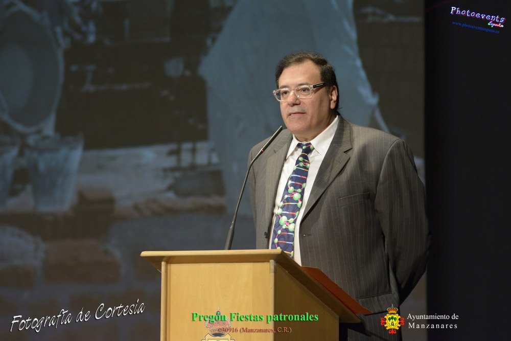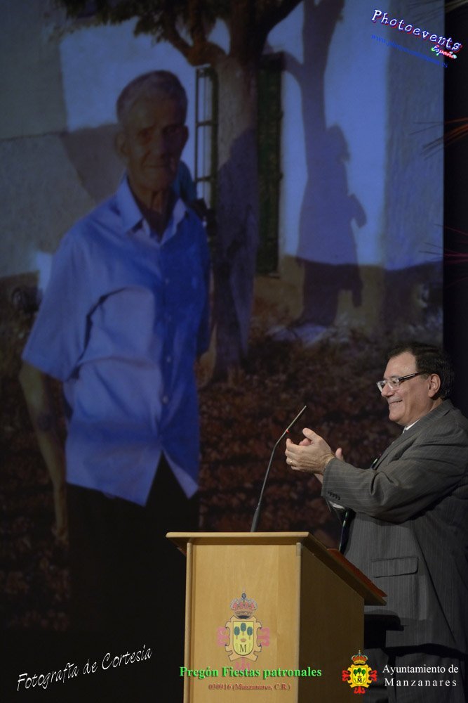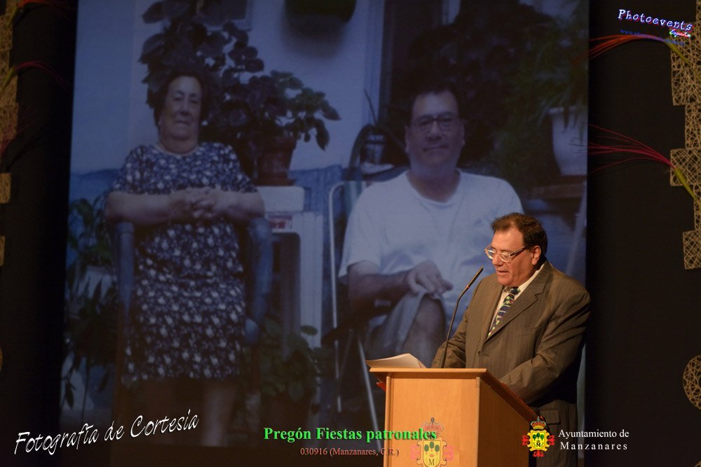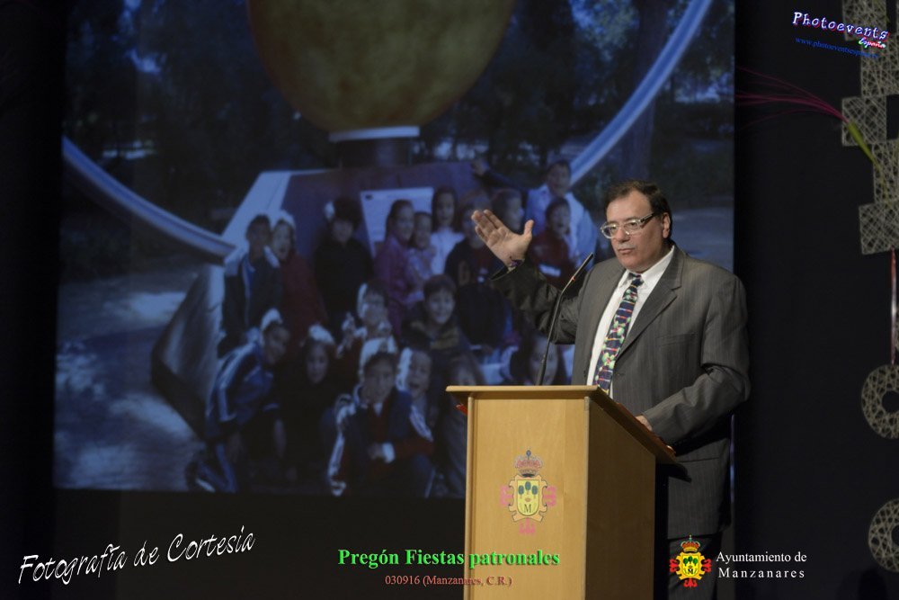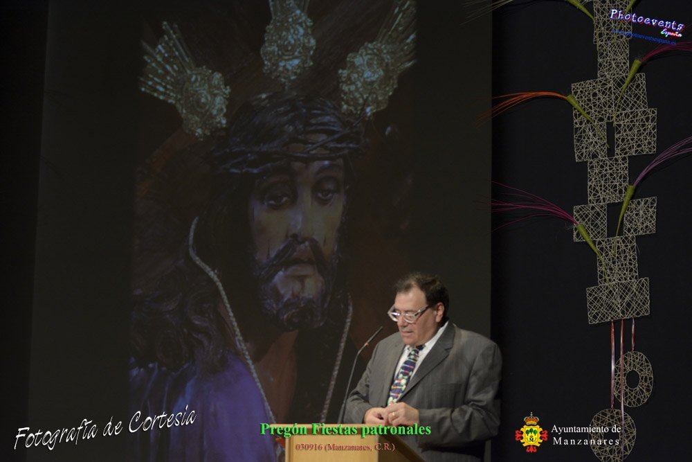 Fotografías realizadas durante el pregón de las fiestas patronales 2016, en honor a Nuestro Padre Jesús del Perdón, siendo el encargado este año D. Julián Gomez-Cambronero Pacheco (Hijo Predilecto de Manzanares), que recogió el testigo de la mano del pregonero del pasado año 2015 D. Jerónimo Calero Calero. El acto contó con la presencia de distintos miembros de la corporación municipal y provincial, asi como miembros de la Hermandad Ntro. Padre Jesús del Perdón. El acto tuvo lugar el día 030916 en el Gran Teatro de la localidad de Manzanare, Ciudad Real .