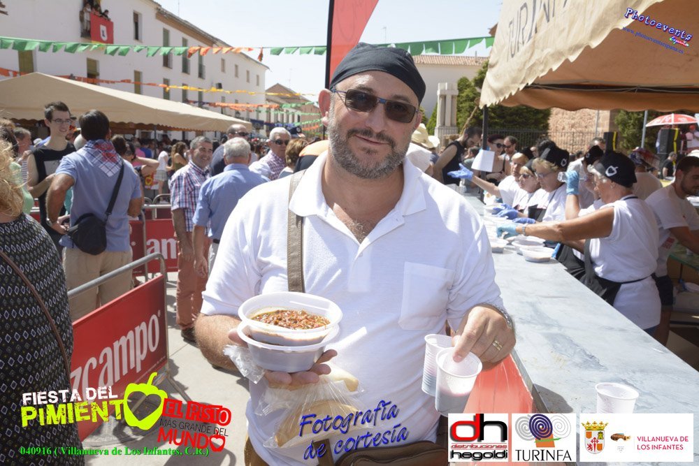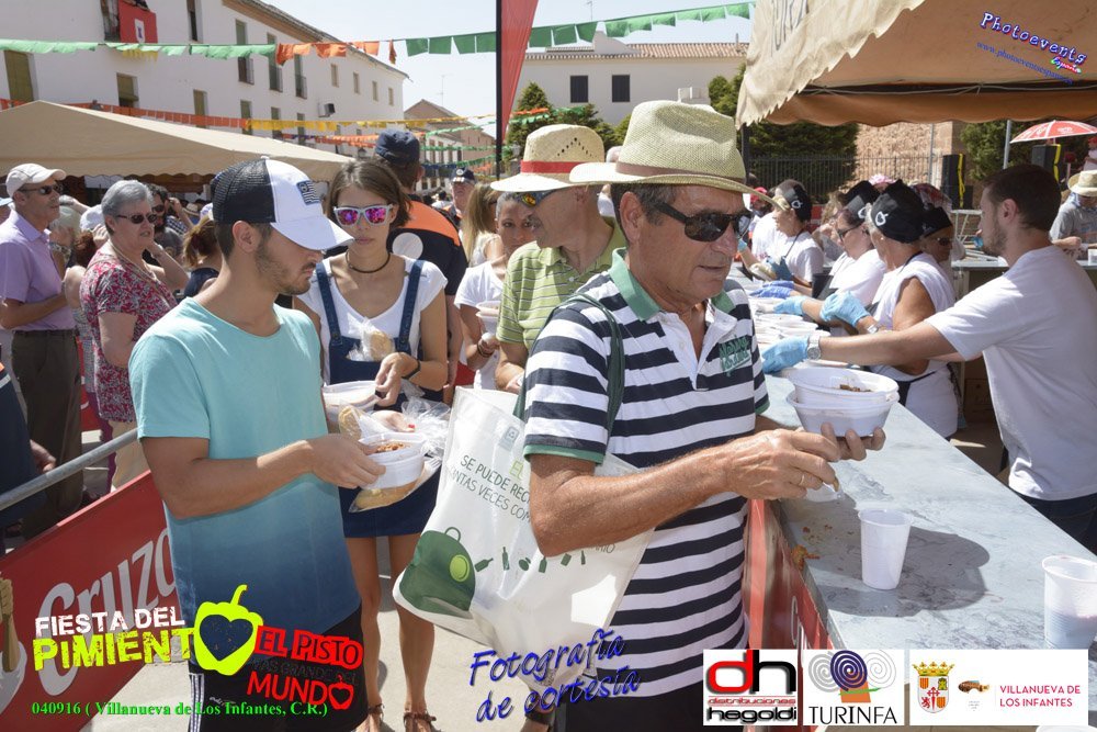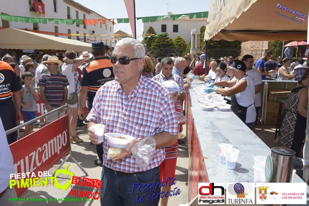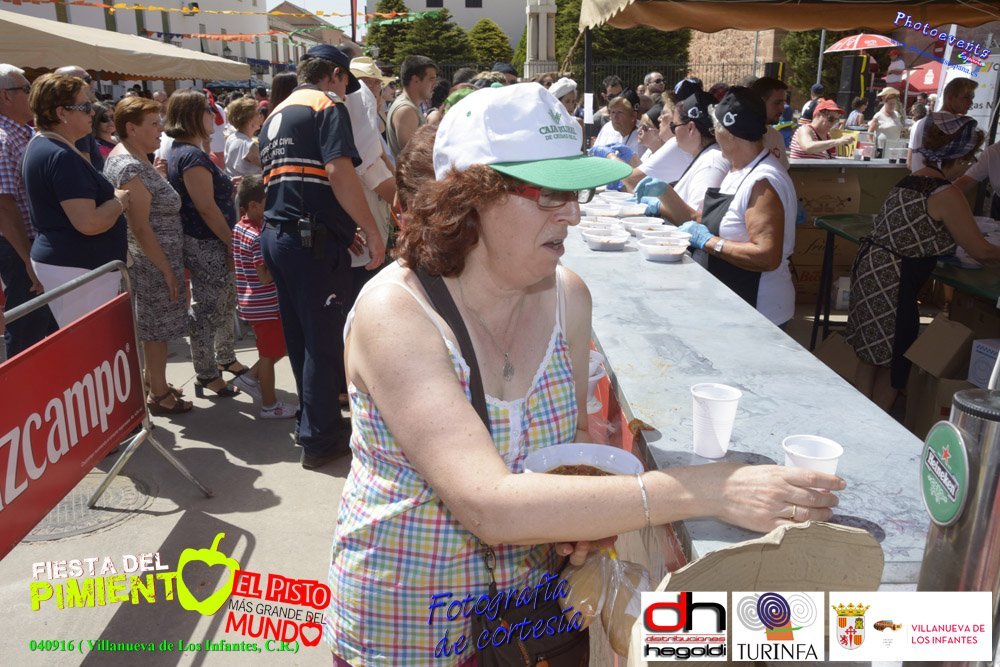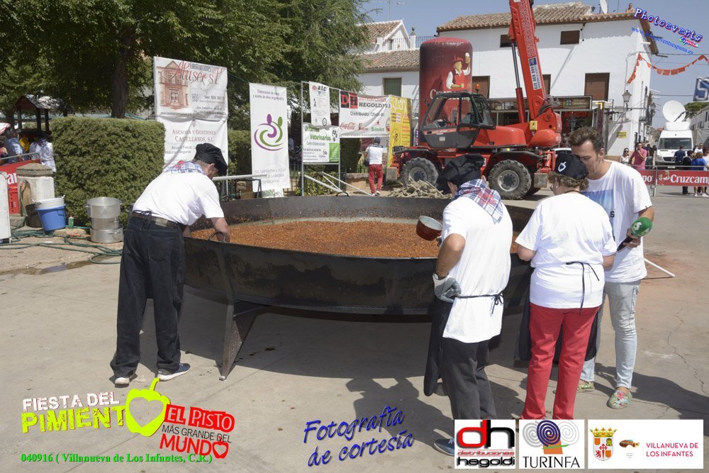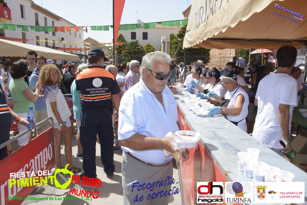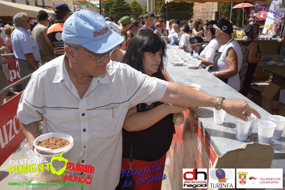 Fotografías realizadas durante el reparto a las personas (que desde primera hora llegaban a la plaza) del pisto mas grande del mundo, el cual ha sido certificado con el RECORD GUINNESS como el pisto mas grande del mundo, con un peso total de 1.254 kilos, superando de esta forma con creces los 563 kilos del popular plato francés, el "ratatouille", que ostentaba Disney. El pisto gigante se realizo el pasado día 4 de Septiembre y estaba enmarcado dentro de las fiestas del pimiento que anualmente a comienzos de Septiembre se celebra en la localidad de Vva. de los Infantes, (Ciudad Real-España).