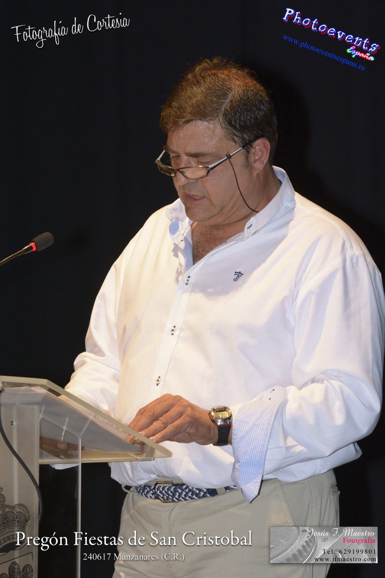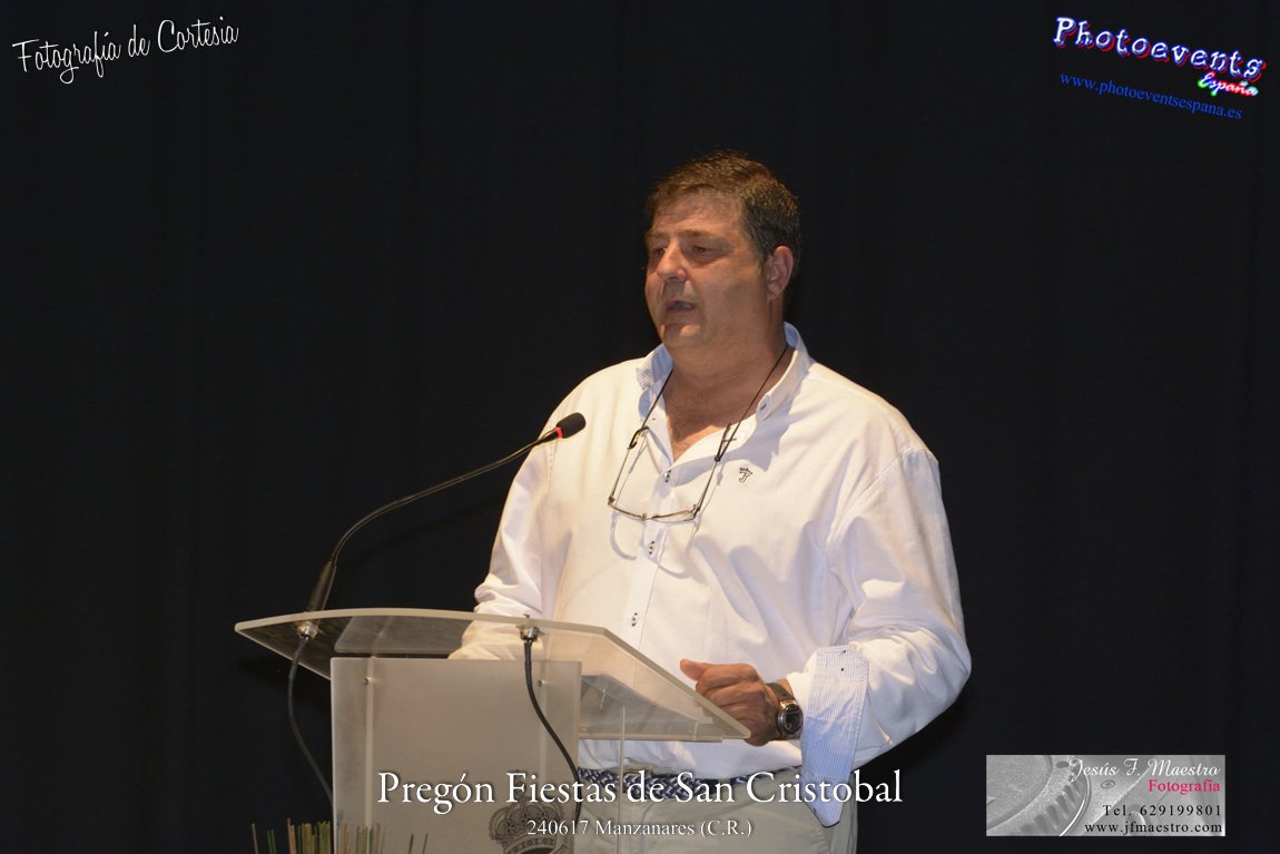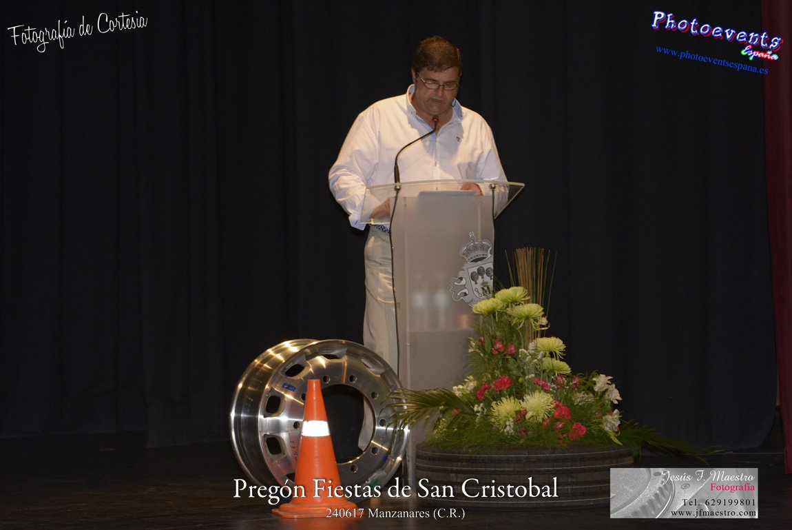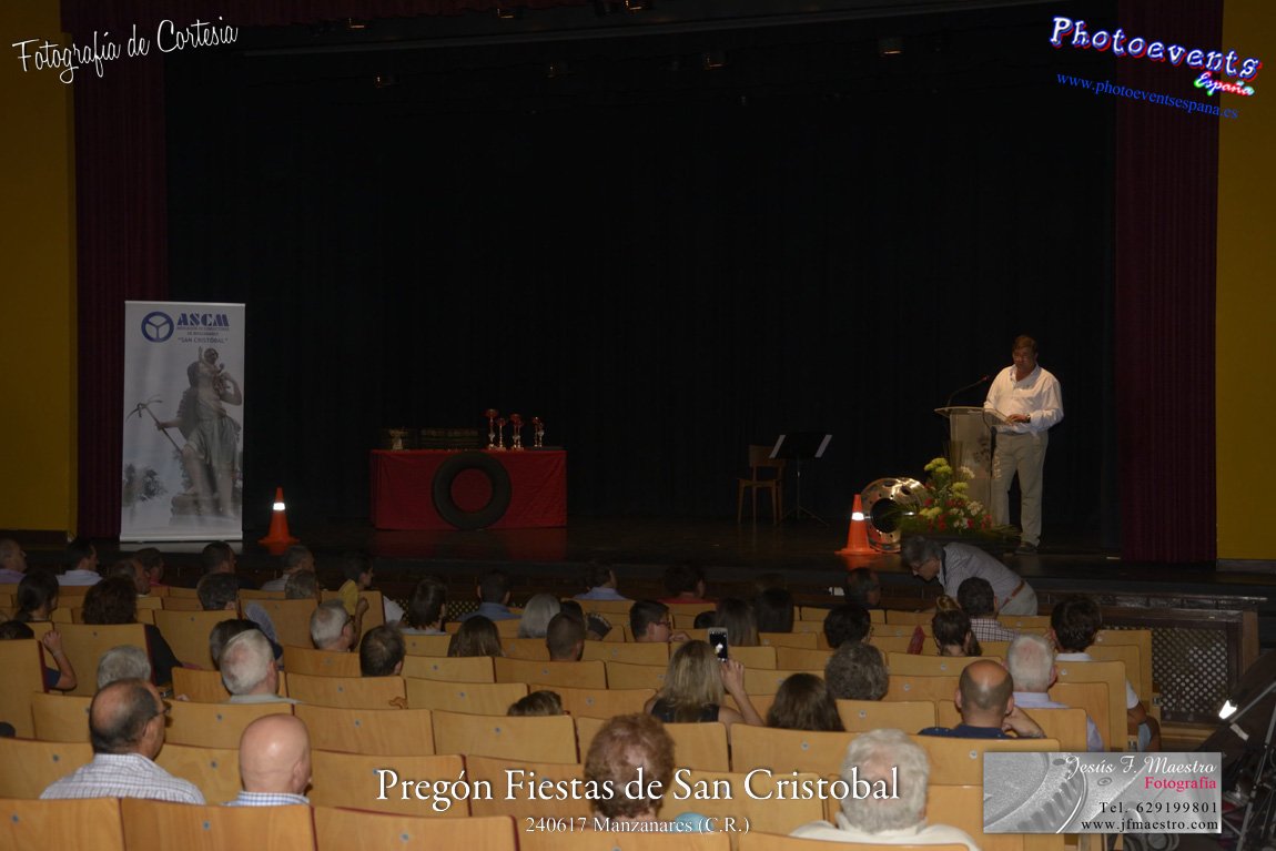 Fotografías realizadas durante el pregón de las Fiestas de San Cristóbal, que se ha realizado por primera vez en la historia de dicha asociación y que corrió a cargo de Alberto Torrijos García (Impresor de la revista de la Asociación), el cual dijo que su pregón no le podrían compartir con el de años anteriores , ya que es la primera vez que se realiza y espera que sean muchos más pregones que realice dicha asociación. El acto tenía lugar en el auditorio de la casa de cultura el pasado día 24 de Junio en la localidad de Manzanares, Ciudad Real.