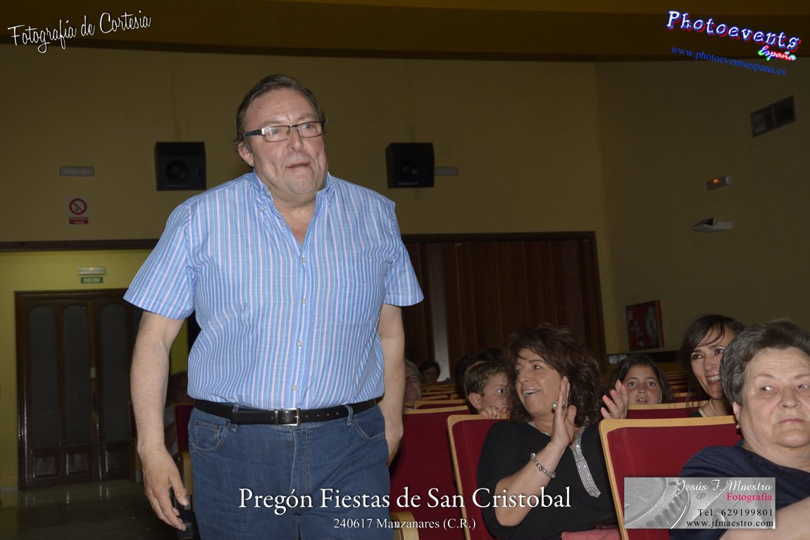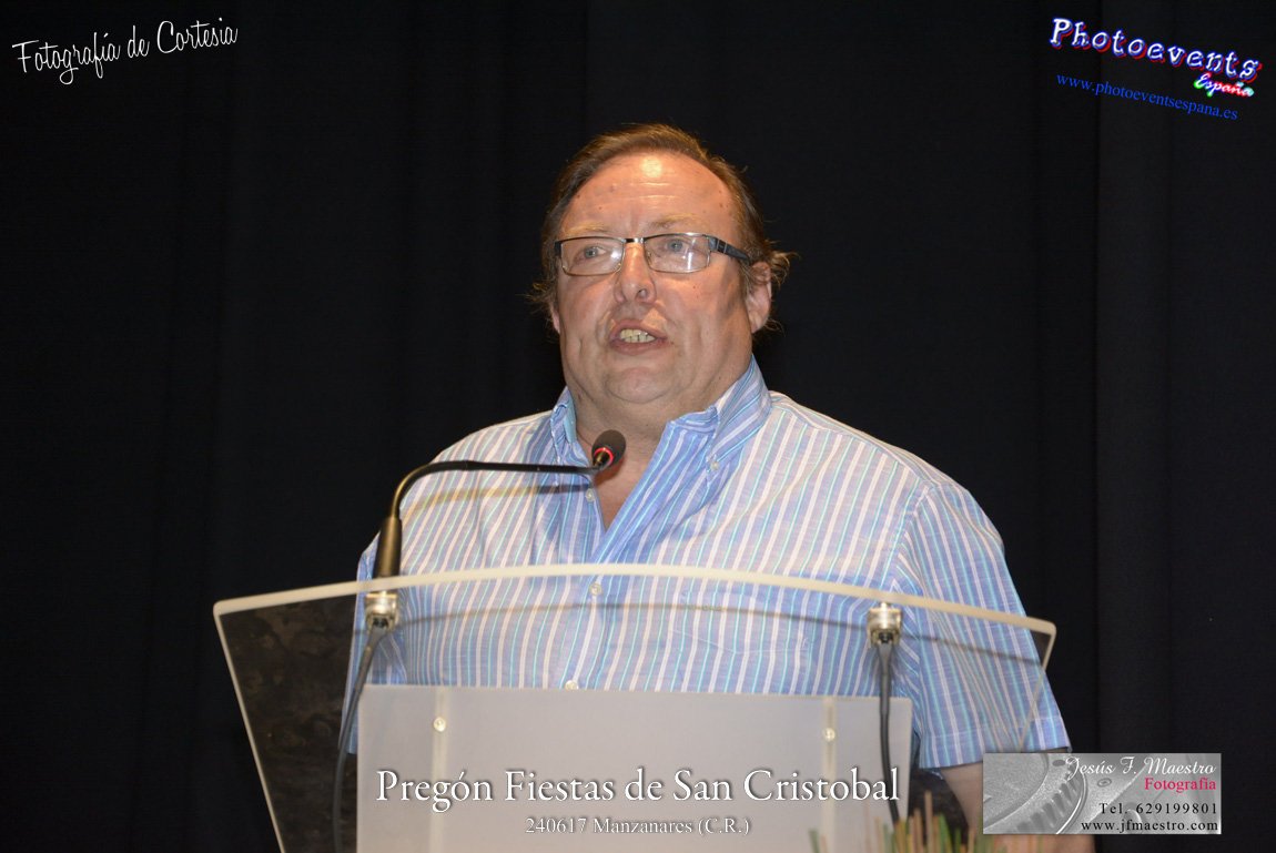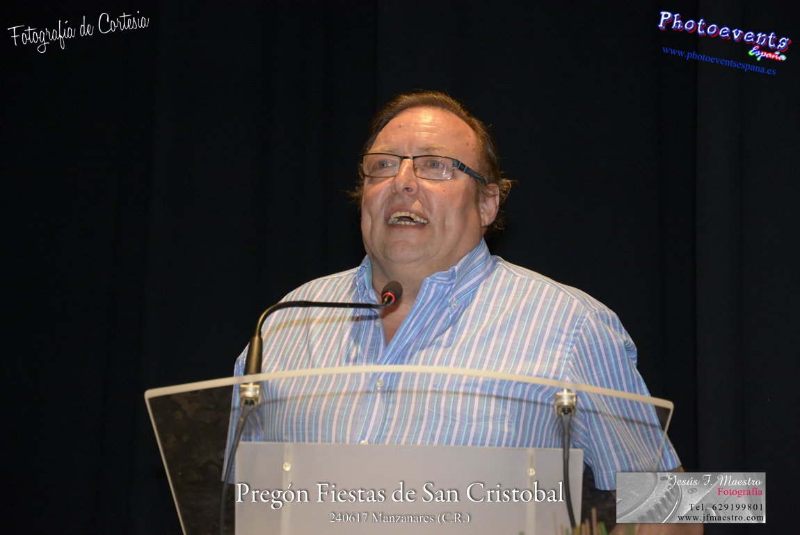 Fotografías realizadas durante el pregón de las Fiestas de San Cristóbal, que se ha realizado por primera vez en la historia de dicha asociación y que corrió a cargo de Alberto Torrijos García (Impresor de la revista de la Asociación), el cual dijo que su pregón no le podrían compartir con el de años anteriores , ya que es la primera vez que se realiza y espera que sean muchos más pregones que realice dicha asociación. El acto tenía lugar en el auditorio de la casa de cultura el pasado día 24 de Junio en la localidad de Manzanares, Ciudad Real.