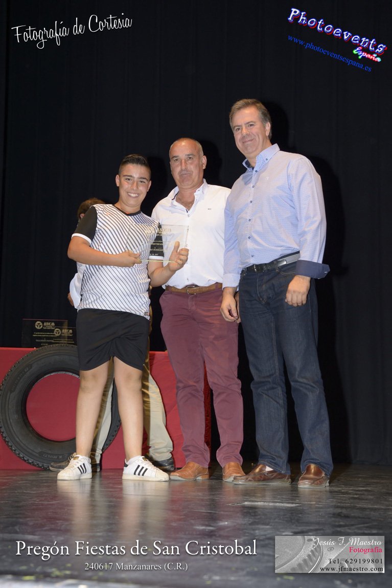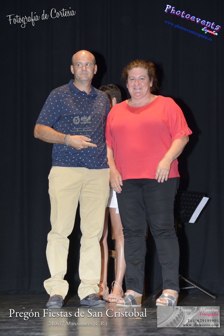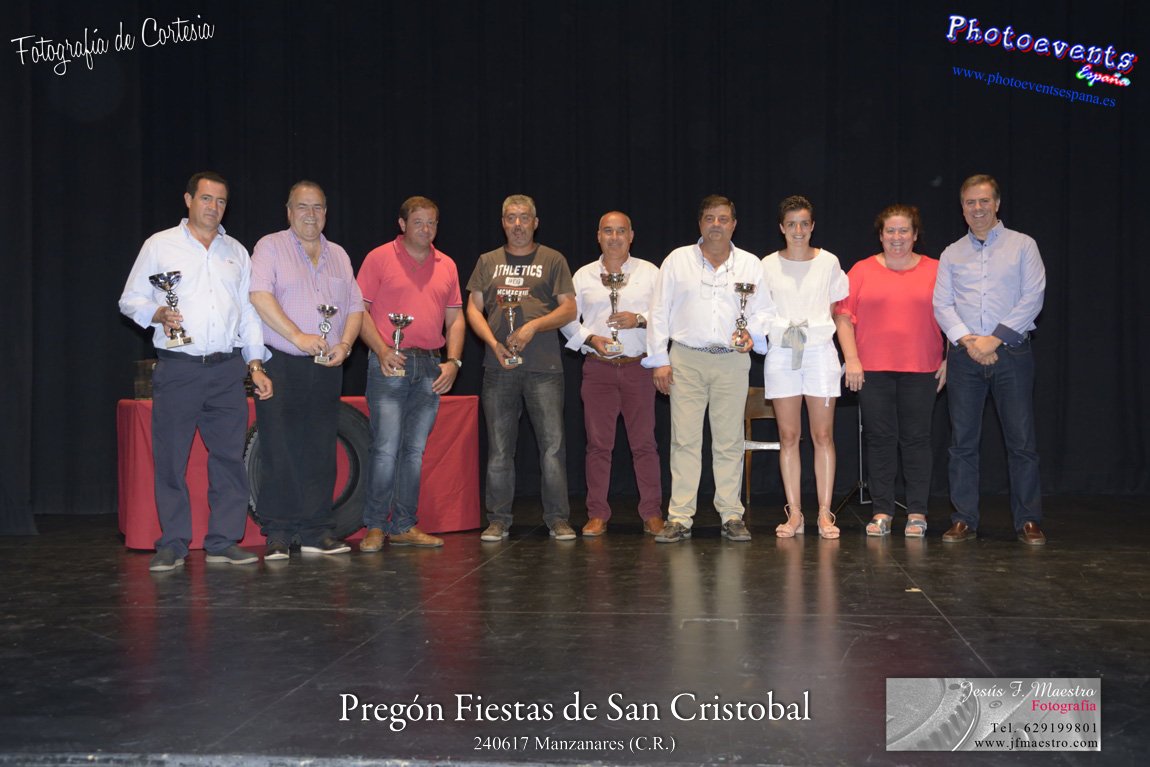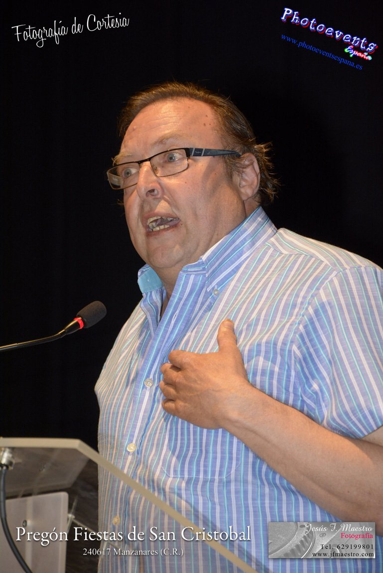 Fotografías realizadas durante el pregón de las Fiestas de San Cristóbal, que se ha realizado por primera vez en la historia de dicha asociación y que corrió a cargo de Alberto Torrijos García (Impresor de la revista de la Asociación), el cual dijo que su pregón no le podrían compartir con el de años anteriores , ya que es la primera vez que se realiza y espera que sean muchos más pregones que realice dicha asociación. El acto tenía lugar en el auditorio de la casa de cultura el pasado día 24 de Junio en la localidad de Manzanares, Ciudad Real.