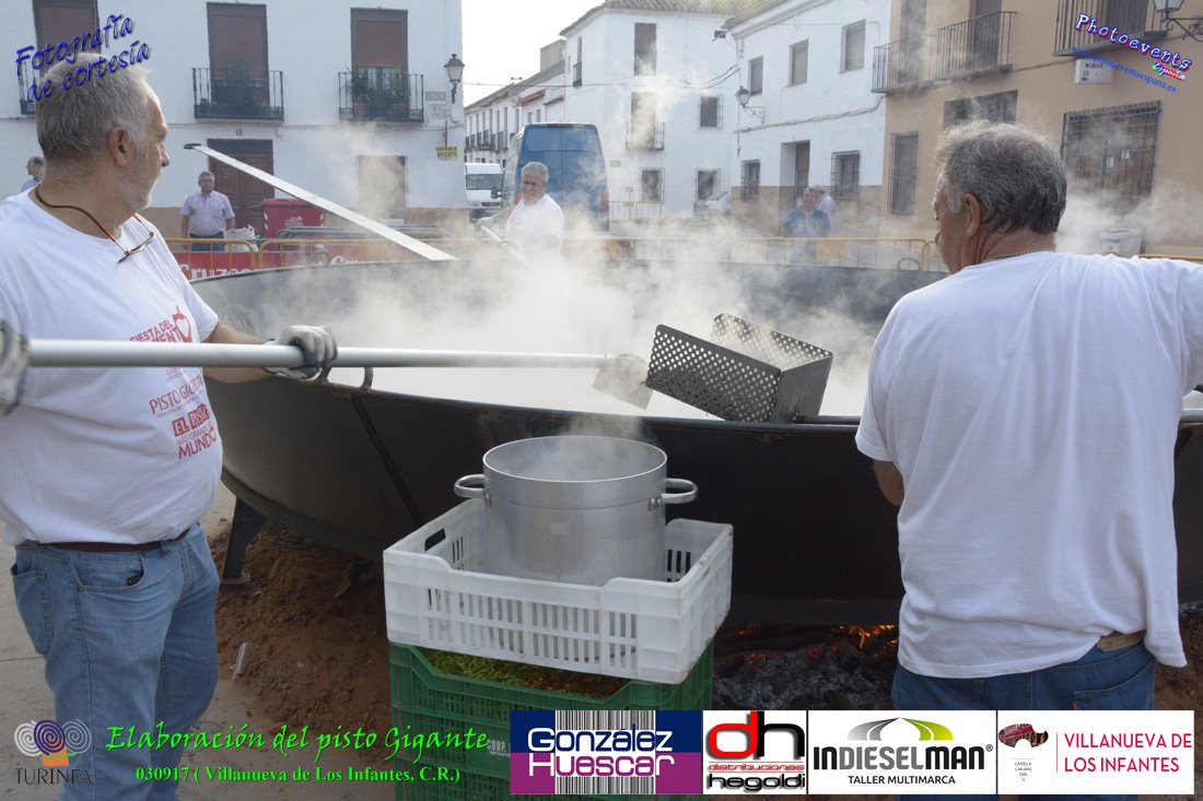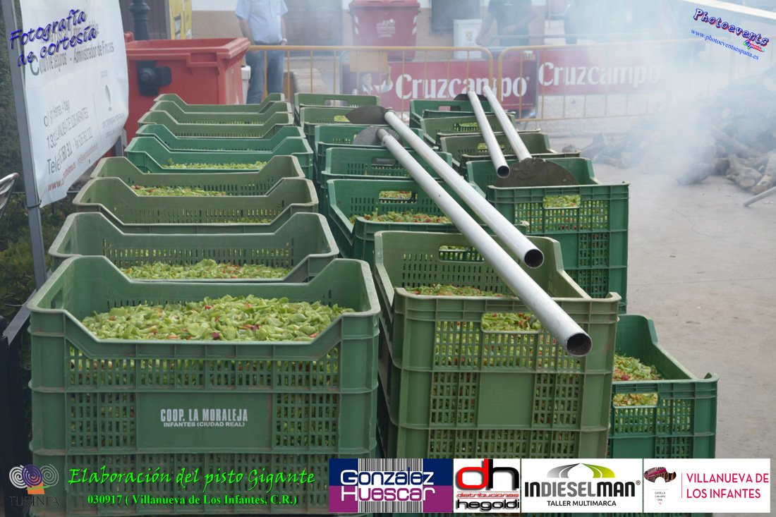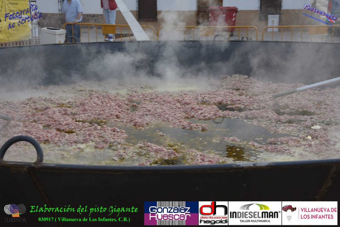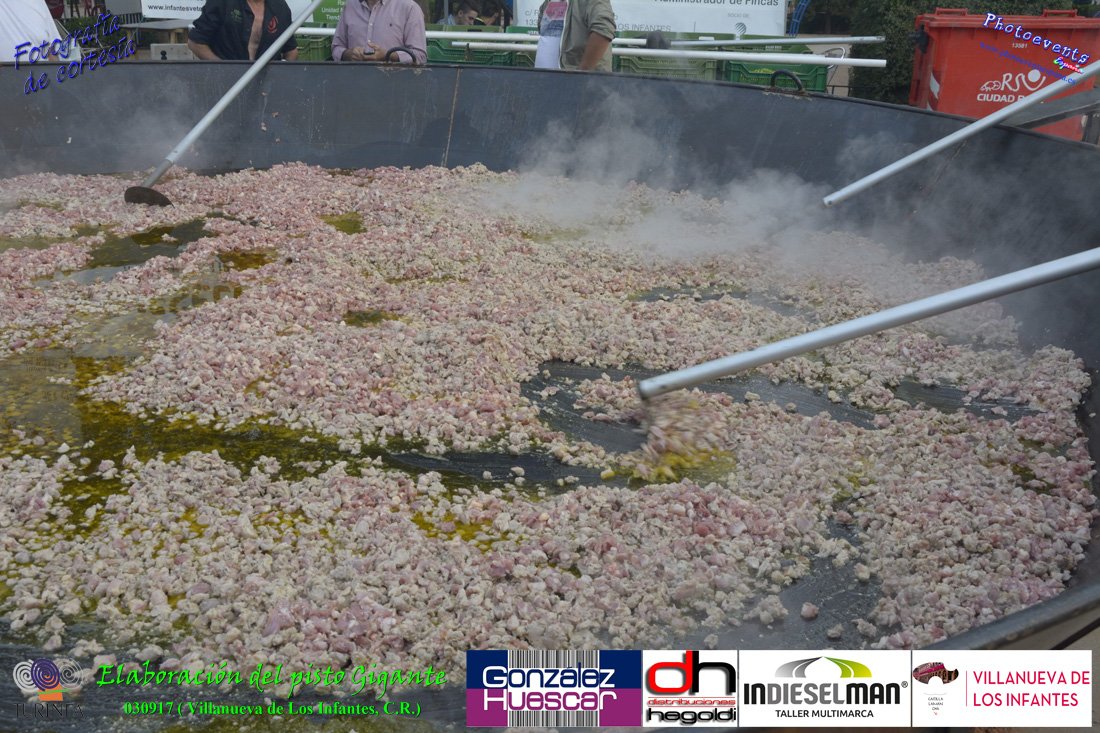 Fotografías realizadas durante la preparación del pisto mas grande del mundo, siendo este realizado con una nueva sarten de 5,20 metros (1 Metro mas que su predecesora). El pisto gigante se realizaba con 2000 kilos de pimiento (donados por El Abuelo Manolo y la Cooperativa la Moraleja), 1100 kilos de tomate, 360 kilos de carne, 150 litros de aceite (de la Cooperativa Virgen de la Antigua y Santo Tomás de Villanueva de la localidad) y 30 kilos de sal. Elavorandose tan suculento plato a fuego con leña durante más de 5 horas. El evento tenía lugar el pasado día 3 de Septiembre y estaba enmarcado dentro de las fiestas del pimiento que anualmente a comienzos de Septiembre se celebra en la localidad de Vva. de los Infantes, (Ciudad Real,España).