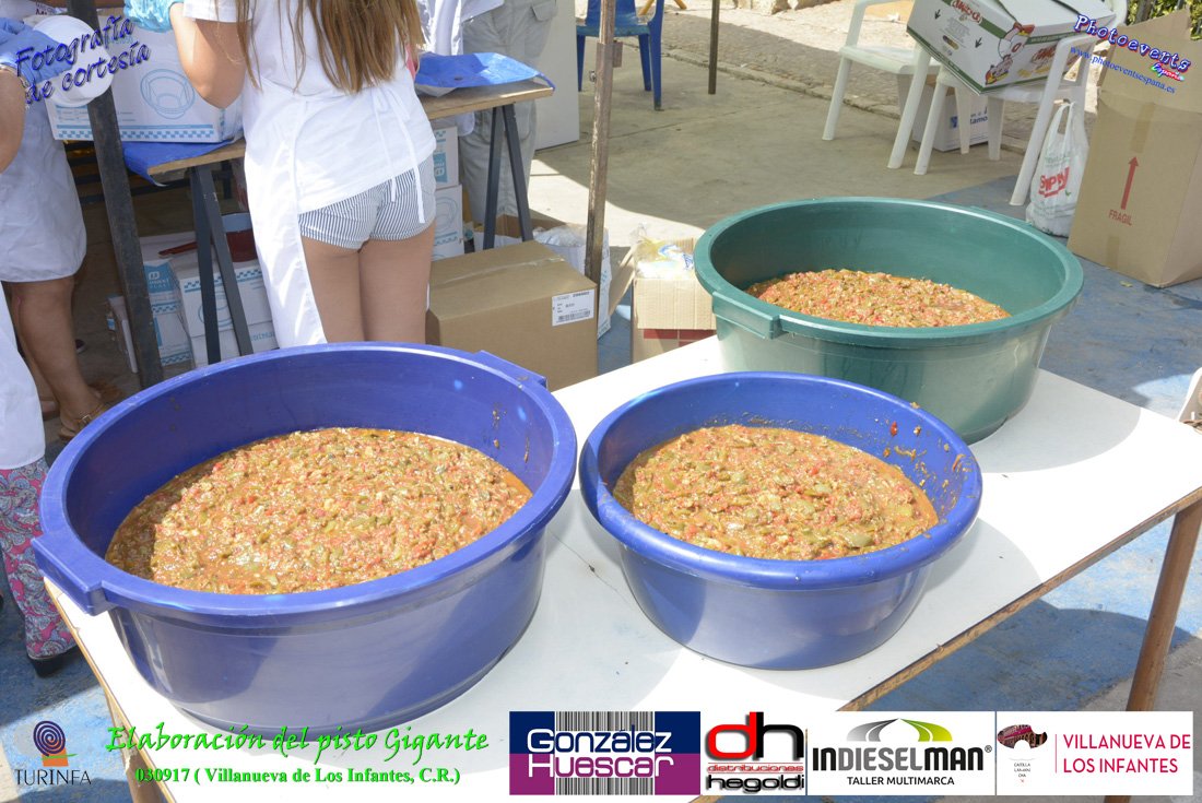 Fotografías realizadas durante la preparación del pisto mas grande del mundo, siendo este realizado con una nueva sarten de 5,20 metros (1 Metro mas que su predecesora). El pisto gigante se realizaba con 2000 kilos de pimiento (donados por El Abuelo Manolo y la Cooperativa la Moraleja), 1100 kilos de tomate, 360 kilos de carne, 150 litros de aceite (de la Cooperativa Virgen de la Antigua y Santo Tomás de Villanueva de la localidad) y 30 kilos de sal. Elavorandose tan suculento plato a fuego con leña durante más de 5 horas. El evento tenía lugar el pasado día 3 de Septiembre y estaba enmarcado dentro de las fiestas del pimiento que anualmente a comienzos de Septiembre se celebra en la localidad de Vva. de los Infantes, (Ciudad Real,España).