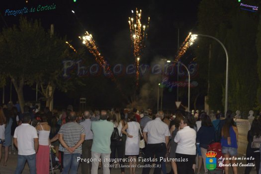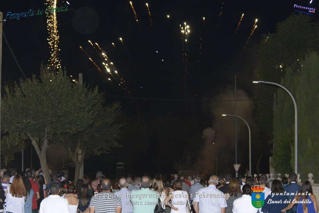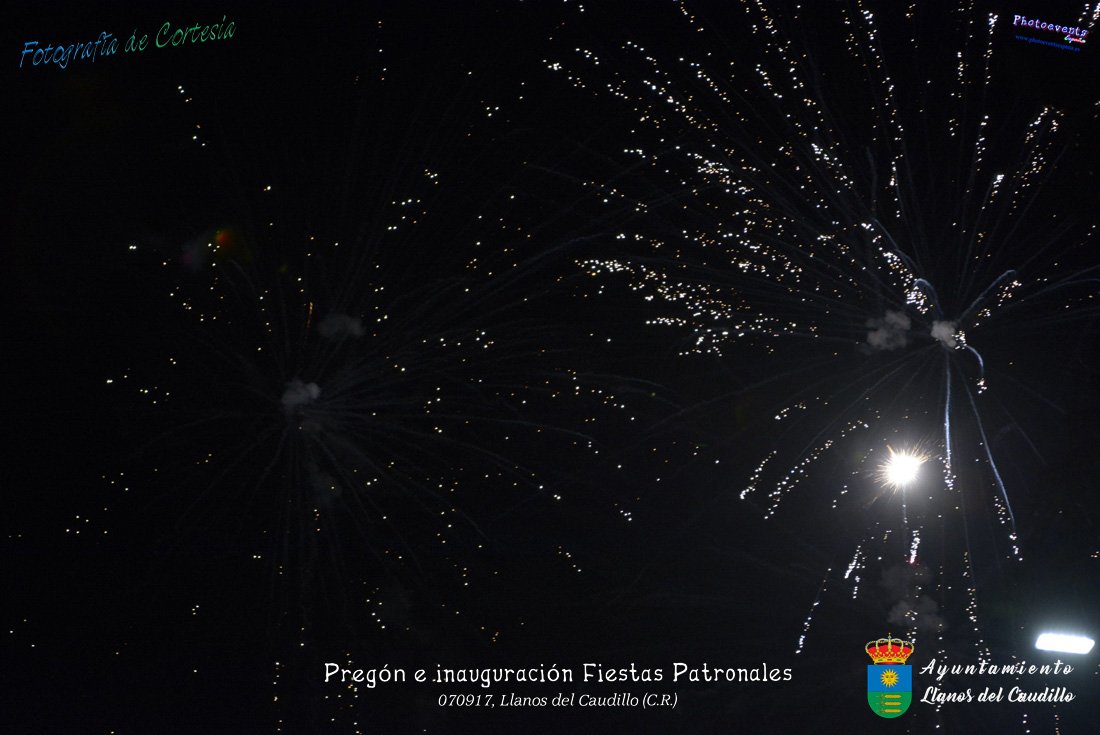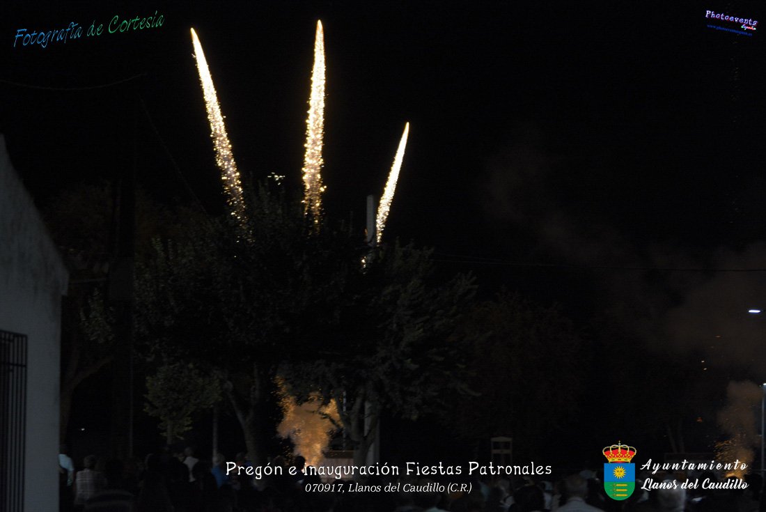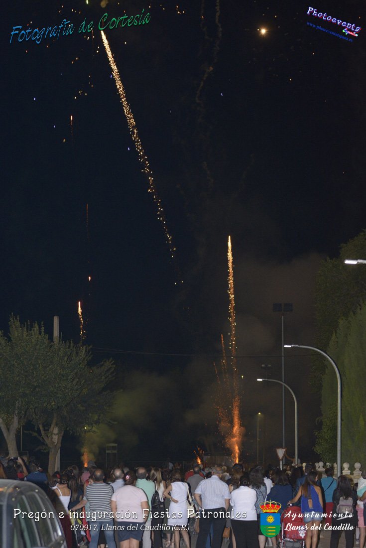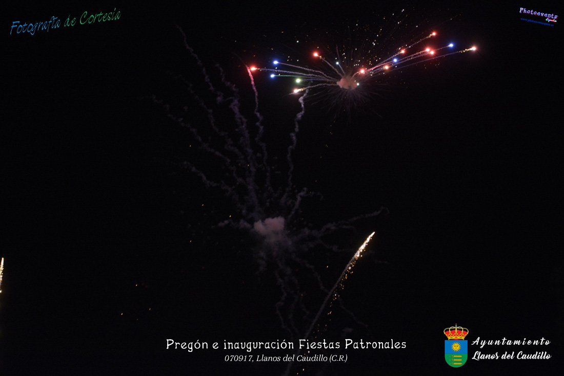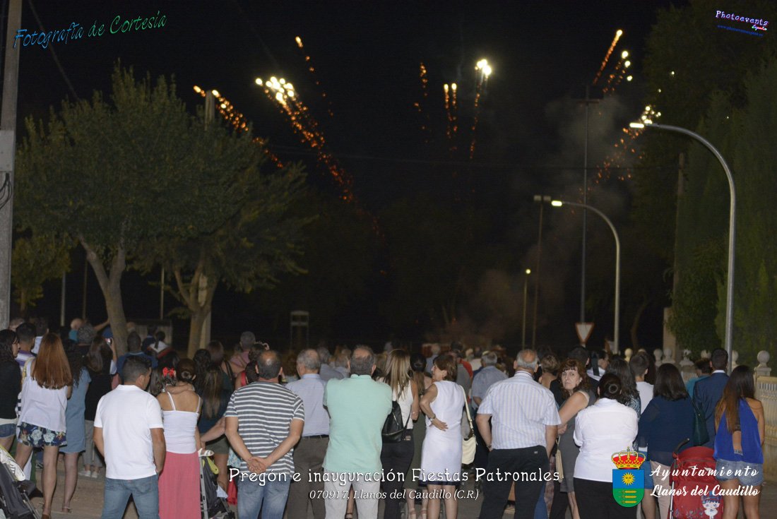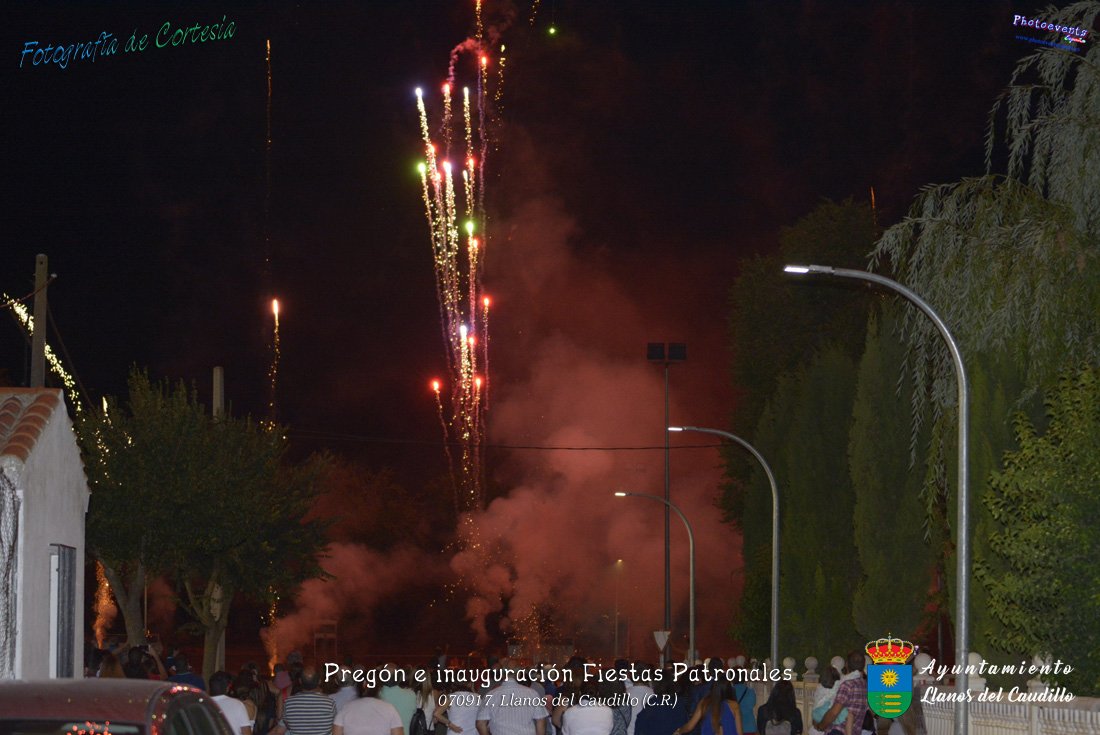 Fotografías realizadas durante el recibimiento de la Reina y damas de honor y entrega de premios a los niños de la Ludoteca de verano, para dar paso posteriormente al pregón de las fiestas a cargo de Vicente Morales Olmedo, terminando el acto con las palabras de Andres Arroyo (Alcalde de Llanos del Caudillo) , que una vez terminado el saludo a los presentes daban comienzo una traca de fuegos artificiales , que tuvo lugar el pasado día 070917 con motivo del inicio de las fiestas patronales de Llanos del Caudillo, Ciudad Real.
