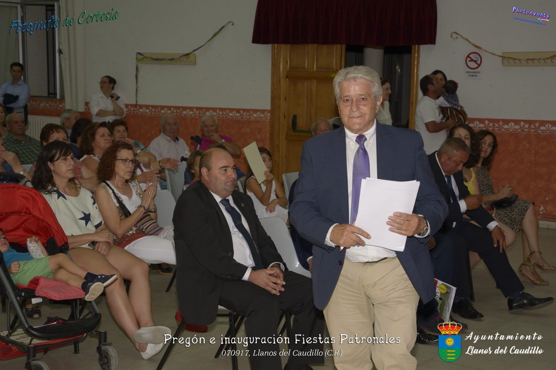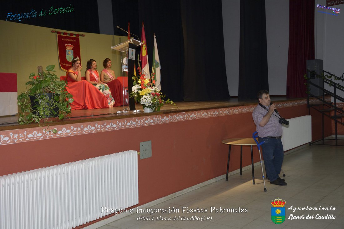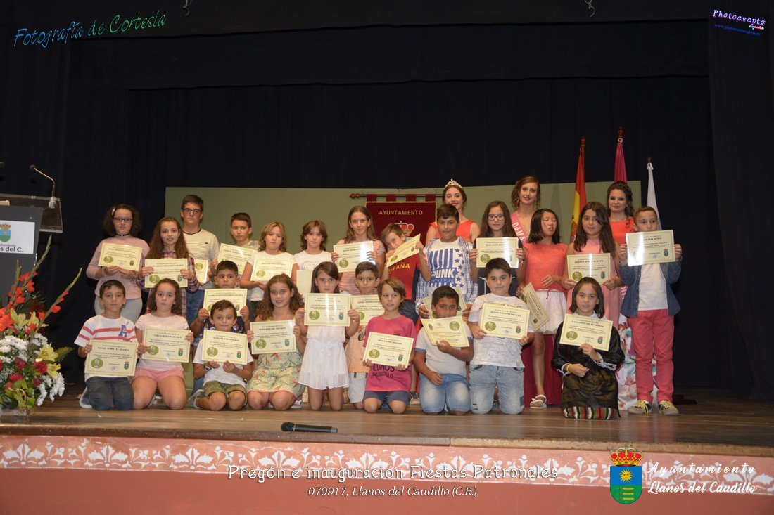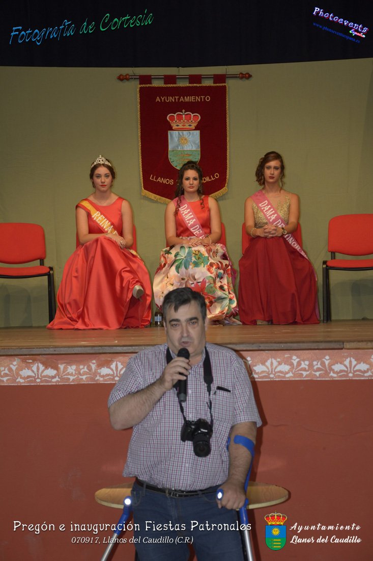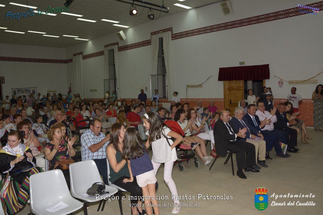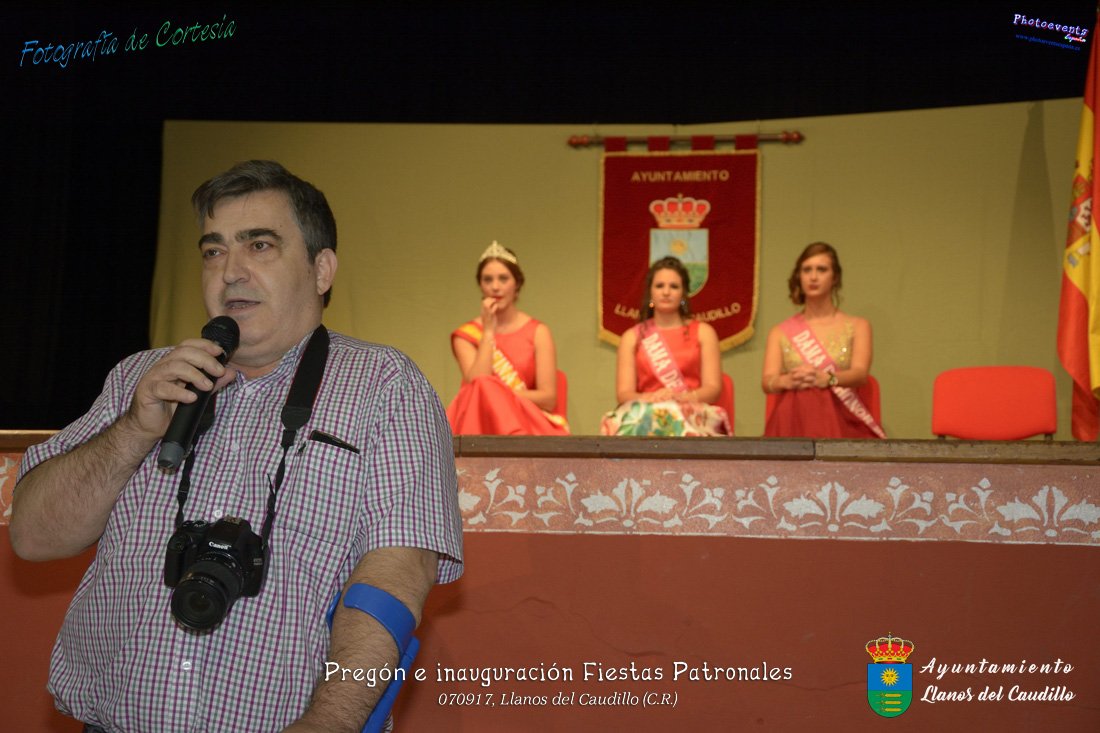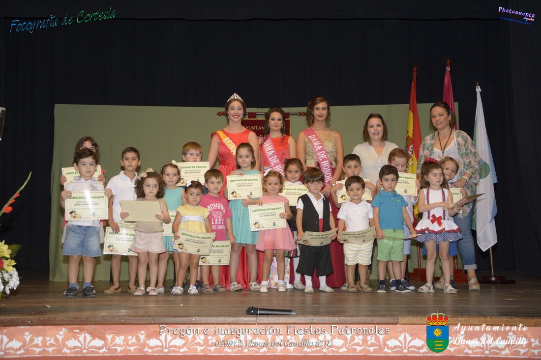 Fotografías realizadas durante el recibimiento de la Reina y damas de honor y entrega de premios a los niños de la Ludoteca de verano, para dar paso posteriormente al pregón de las fiestas a cargo de Vicente Morales Olmedo, terminando el acto con las palabras de Andres Arroyo (Alcalde de Llanos del Caudillo) , que una vez terminado el saludo a los presentes daban comienzo una traca de fuegos artificiales , que tuvo lugar el pasado día 070917 con motivo del inicio de las fiestas patronales de Llanos del Caudillo, Ciudad Real.