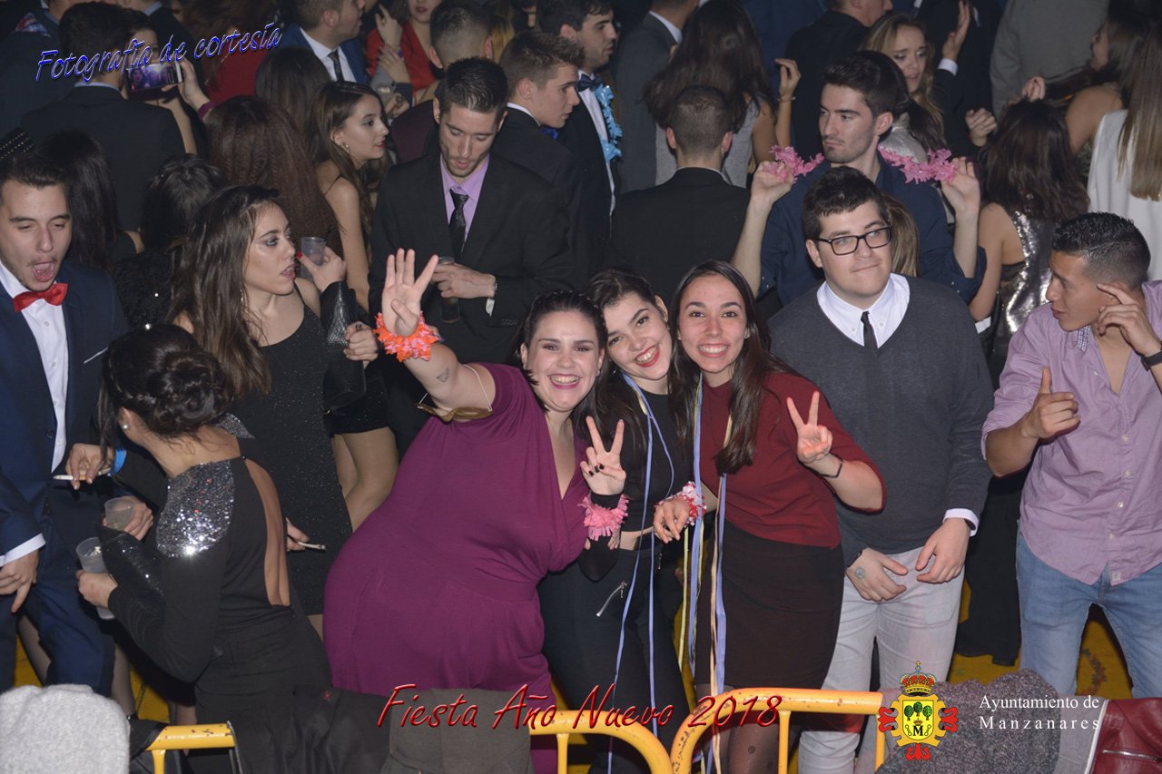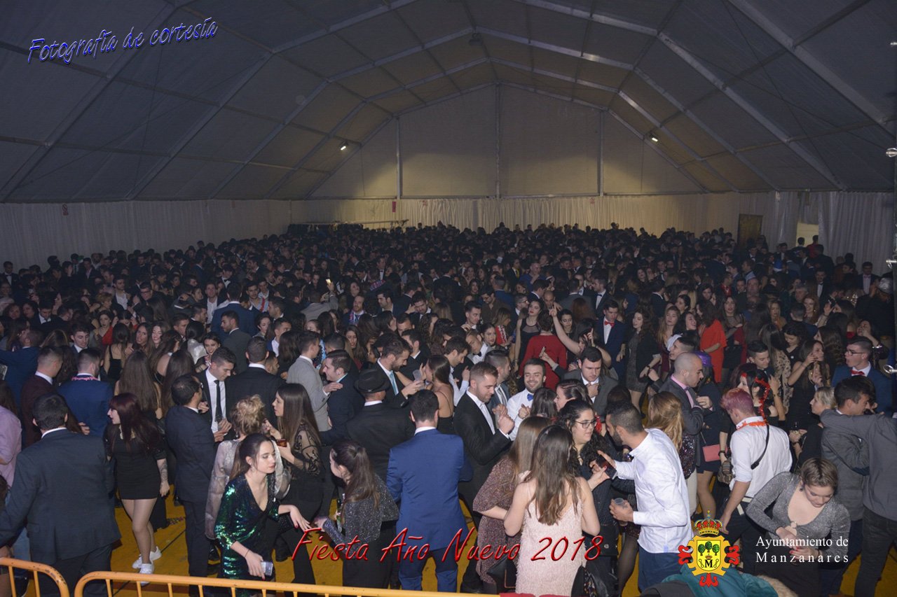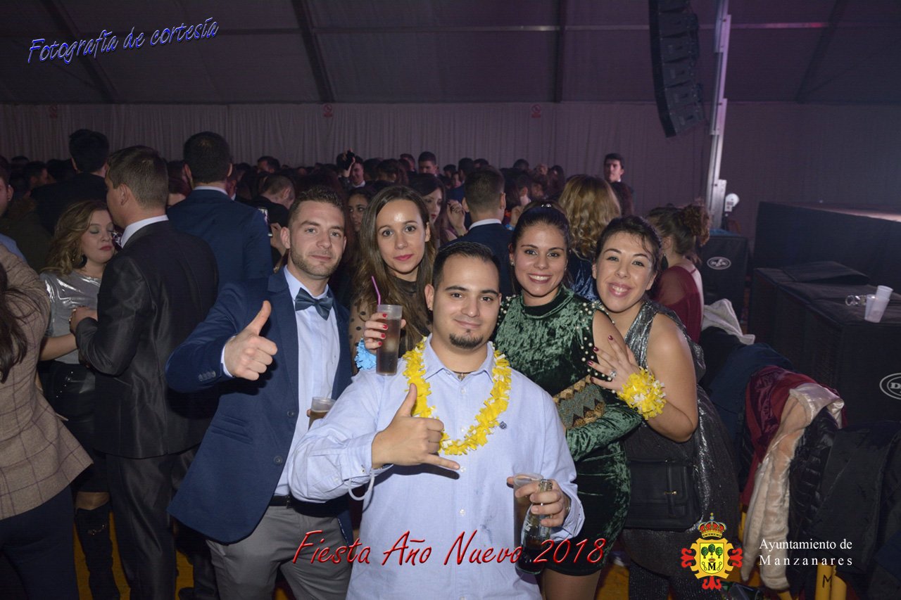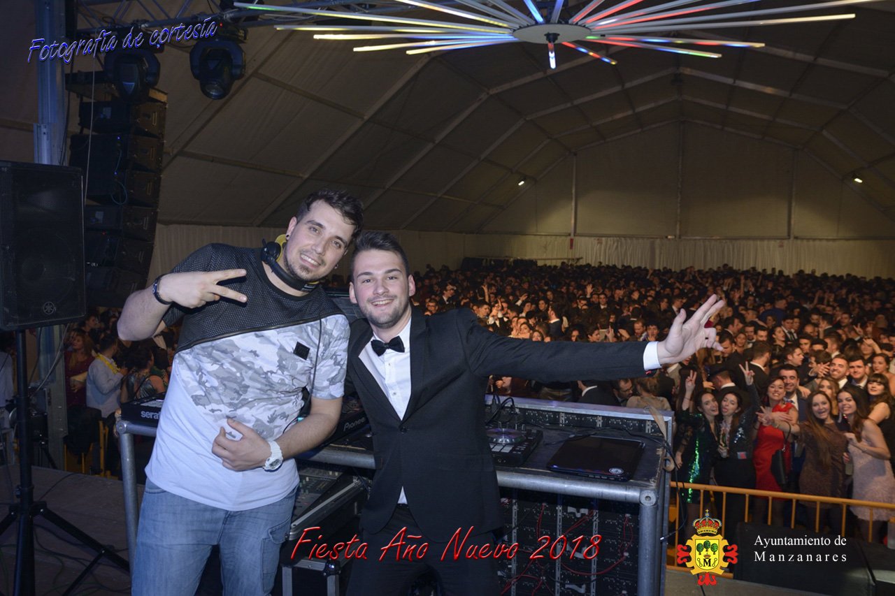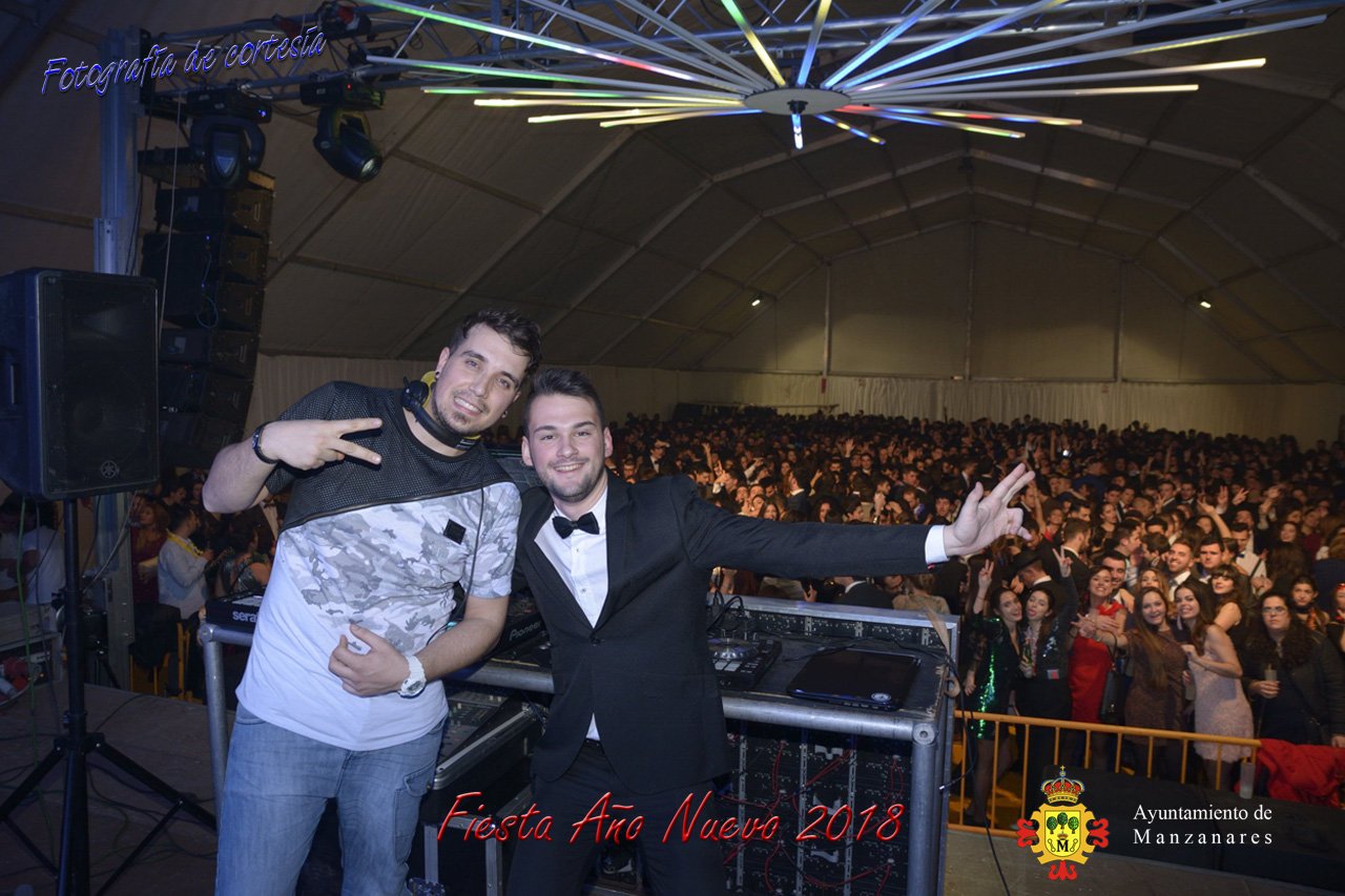 Fotografías durante la fiesta cotillón realizada al inaugurar el nuevo año 2018 bailando a ritmo de discomovil con CON DJ DART Y DJ JUANMA SOUND, en la Pérgola durante la madrugada del 1 de Enero, con motivo de las fiestas Navideñas 2017 de la localidad de Manzanares, Ciudad Real.