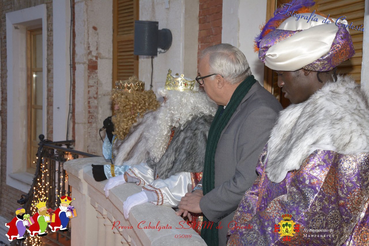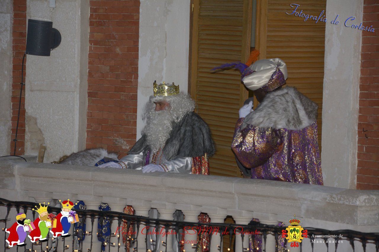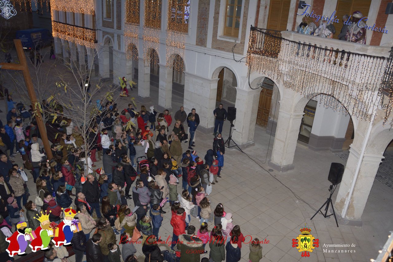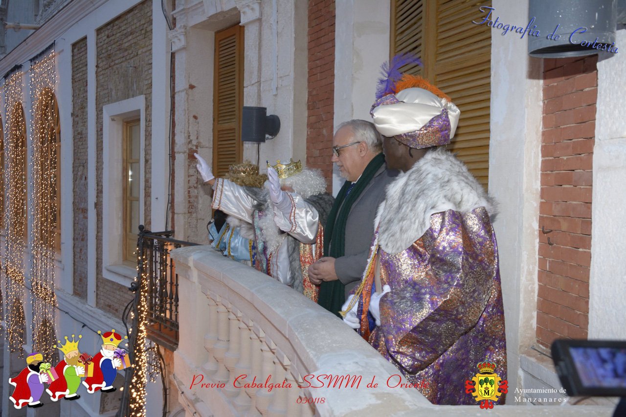 Fotografías realizadas durante la recepción de SSMM de Oriente Melchor , Gaspar y Baltasar a las puertas del Ayuntamiento , saludando a todas los niños y mayores que habia en ese momento, repartiendo caramelos, chuches variadas e incluso balones de goma. El evento tenía lugar el dia 050118 previo a la Cabalgata de Reyes.. Estos actos han sido realizados con motivo de las Fiestas Navideñas 2017 en la localidad de Manzanares, Ciudad Real.
