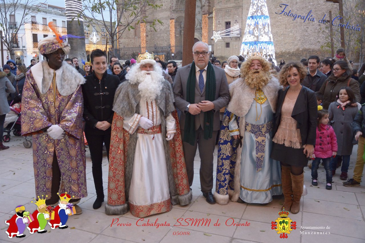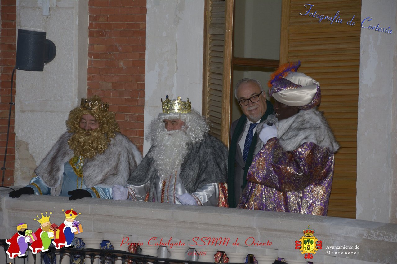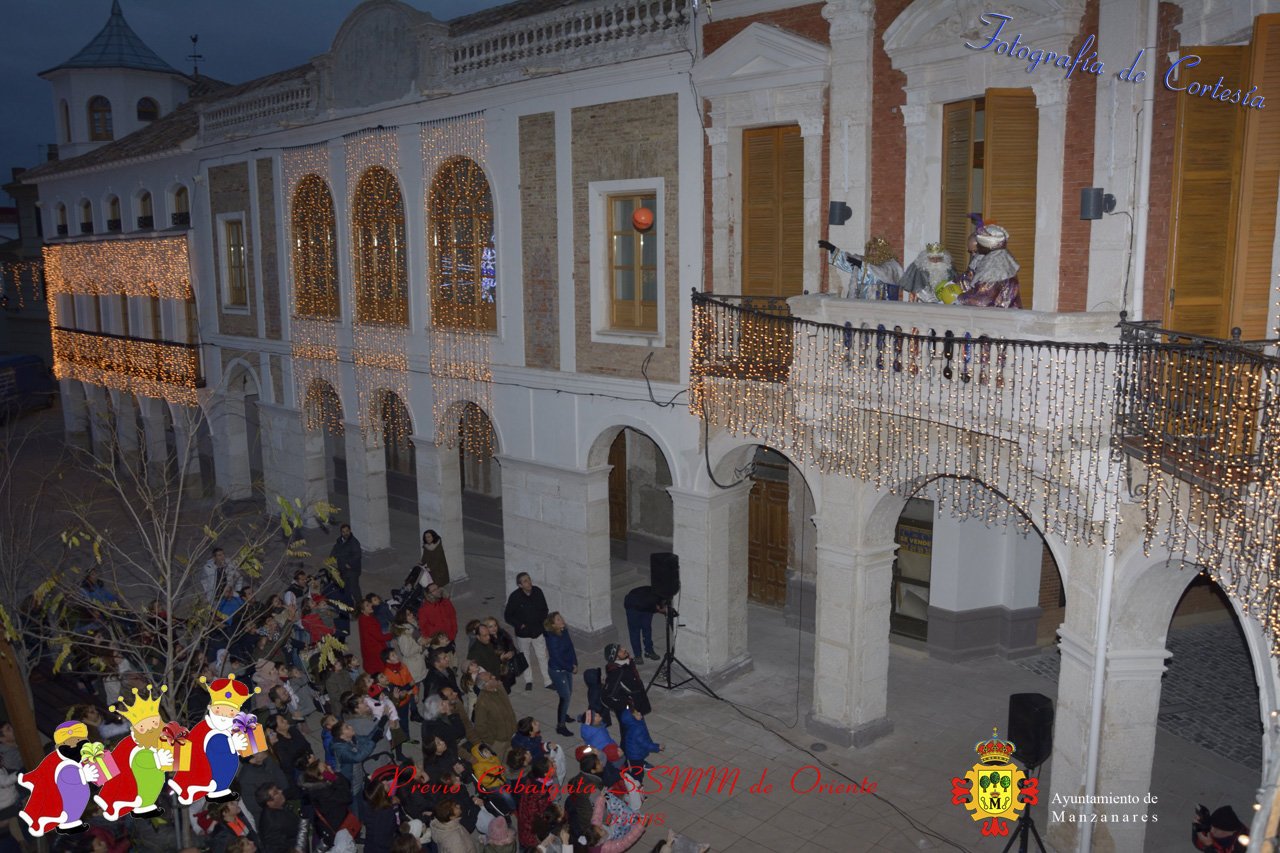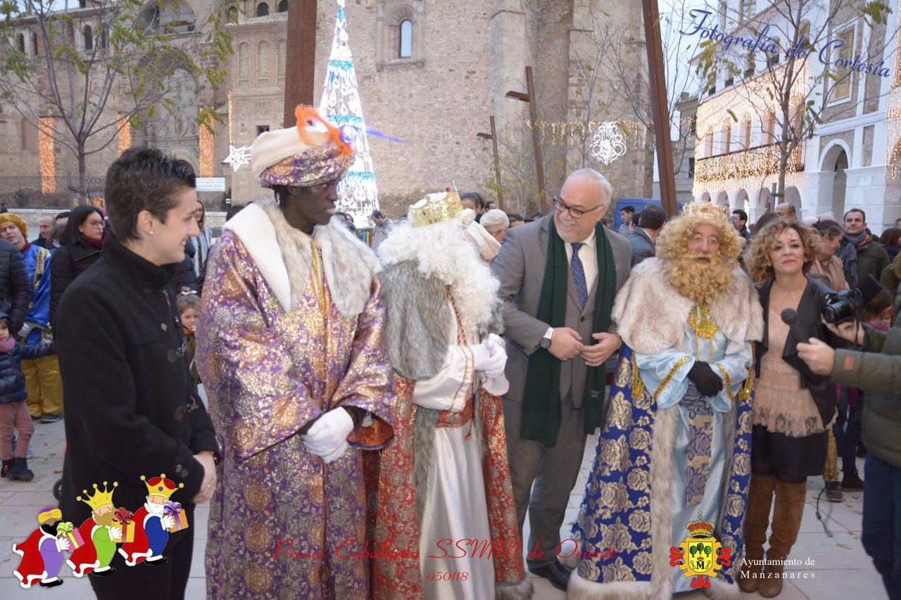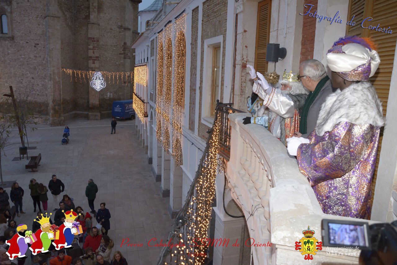 Fotografías realizadas durante la recepción de SSMM de Oriente Melchor , Gaspar y Baltasar a las puertas del Ayuntamiento , saludando a todas los niños y mayores que habia en ese momento, repartiendo caramelos, chuches variadas e incluso balones de goma. El evento tenía lugar el dia 050118 previo a la Cabalgata de Reyes.. Estos actos han sido realizados con motivo de las Fiestas Navideñas 2017 en la localidad de Manzanares, Ciudad Real.