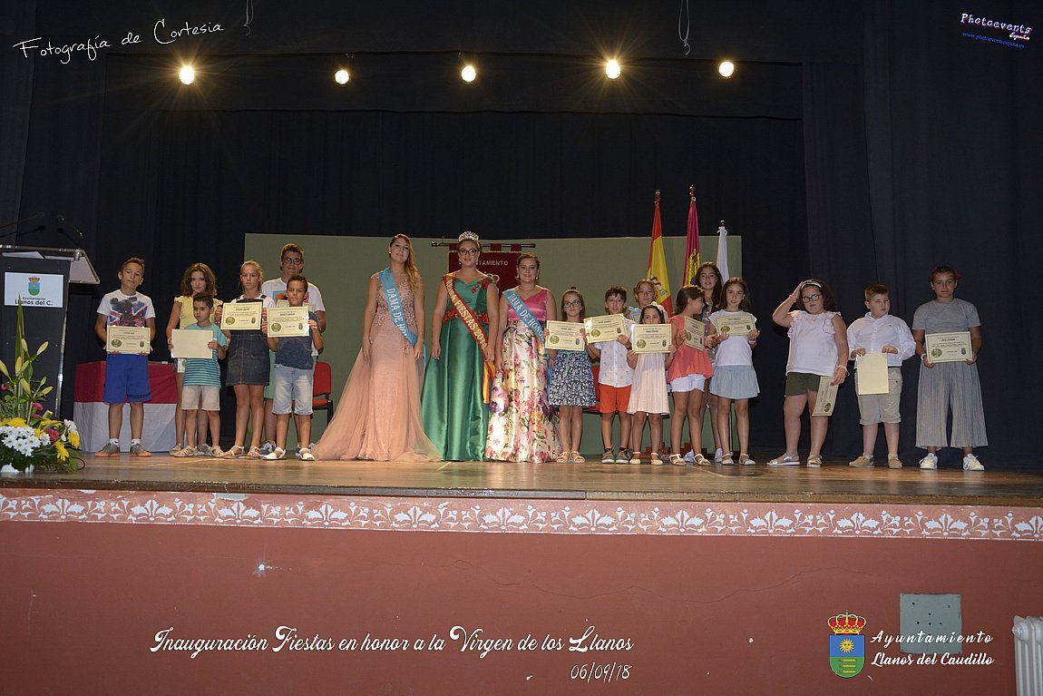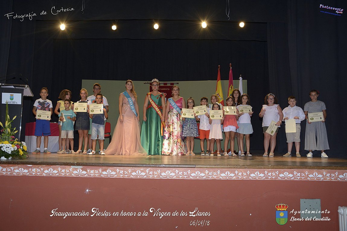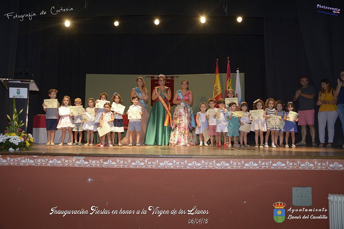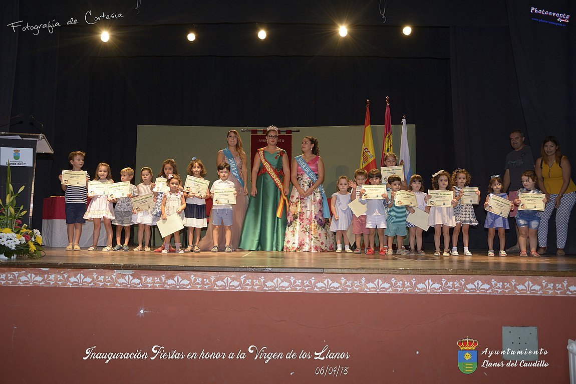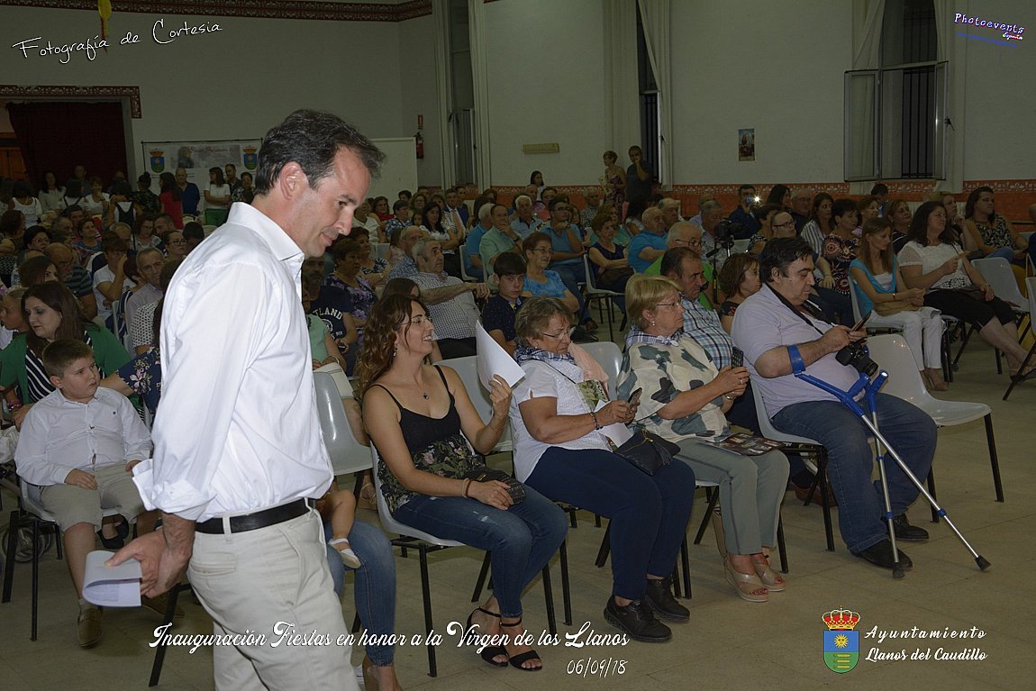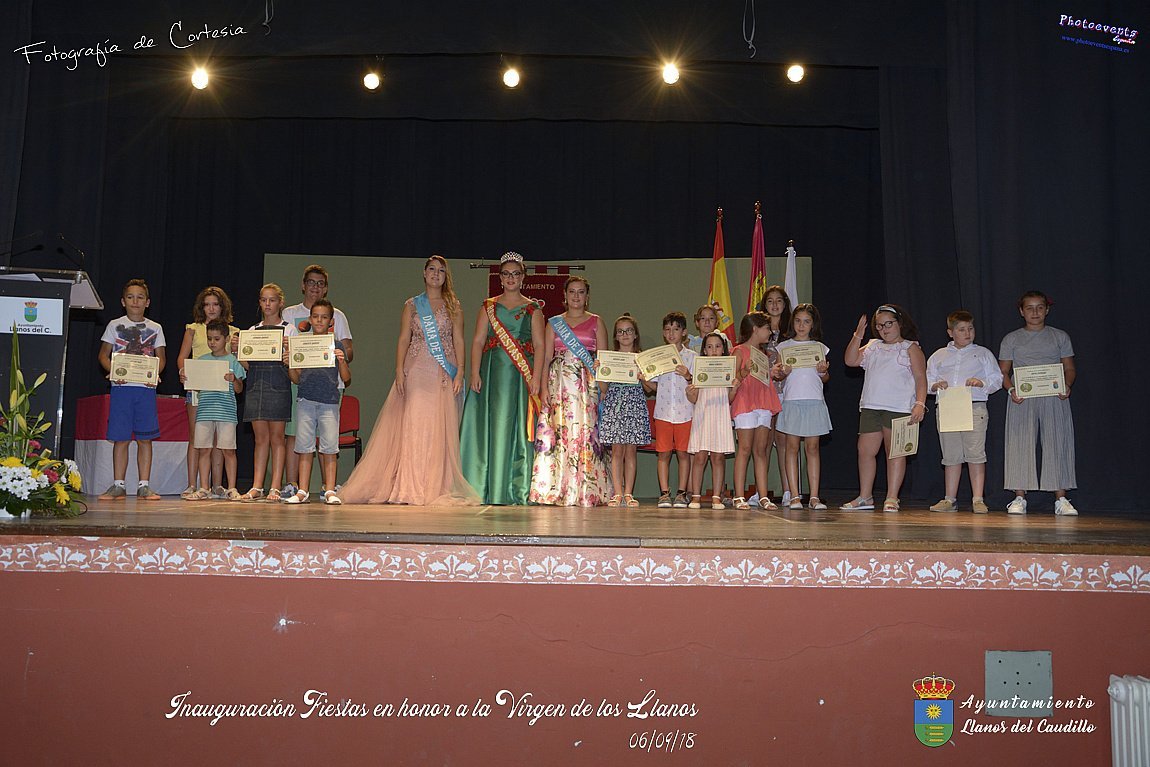 Fotografías realizadas durante el acto de inauguración de las Fiestas en Honor a la Virgen de los Llanos , entregandose los diplomas alos niños de la ludoteca y campamento de verano , para posteriormente realizar el correspondiente pregón que este año corria a cargo de D. Pedro Castañeda Taladriz (nieto de D. Pedro Castañeda Cagigas, arquitecto que diseño el pueblo de Llanos del Caudillo).  Terminando el acto con la correspondiente polvora y un aperitivo para todas las personas. El acto tenia lugar en el Salón Cultural el día 06 de Septiembre de 2018 en la localidad de Llanos del Caudillo, provincia de Ciudad Real .
