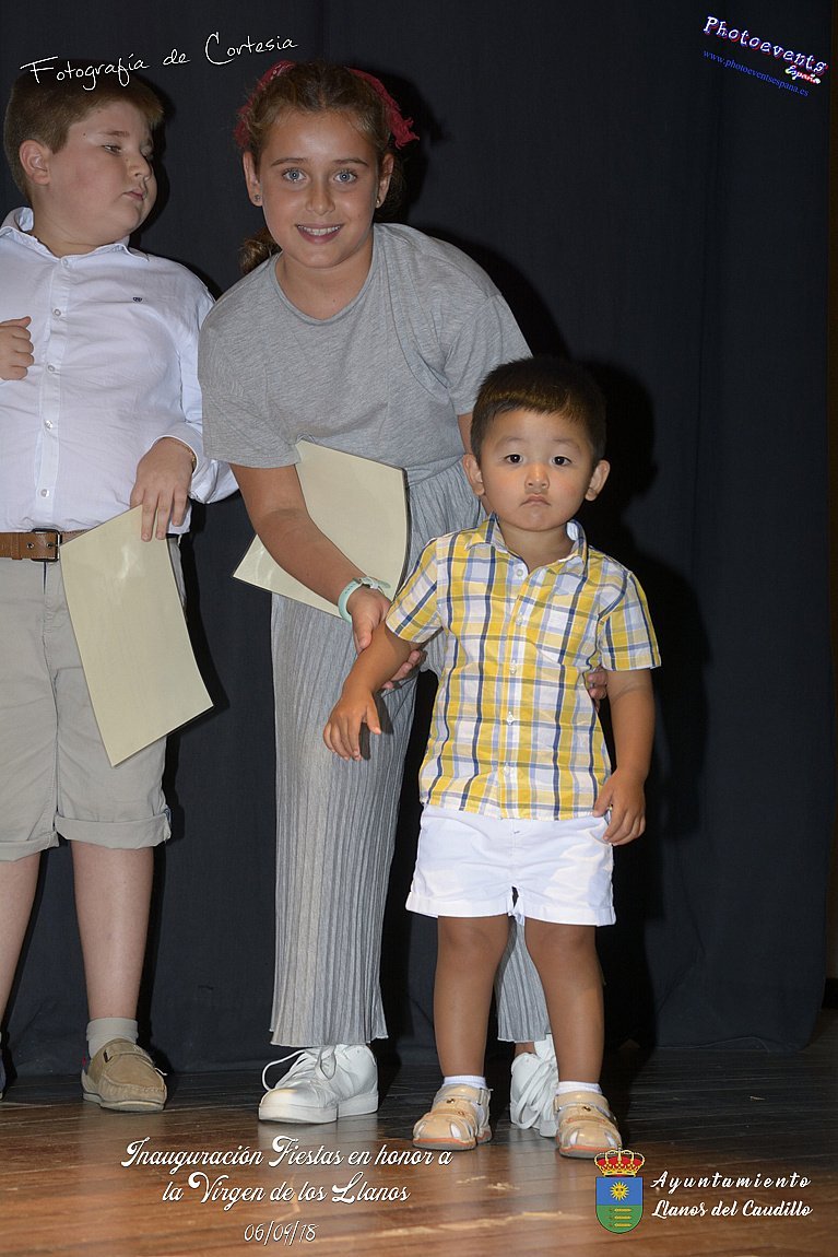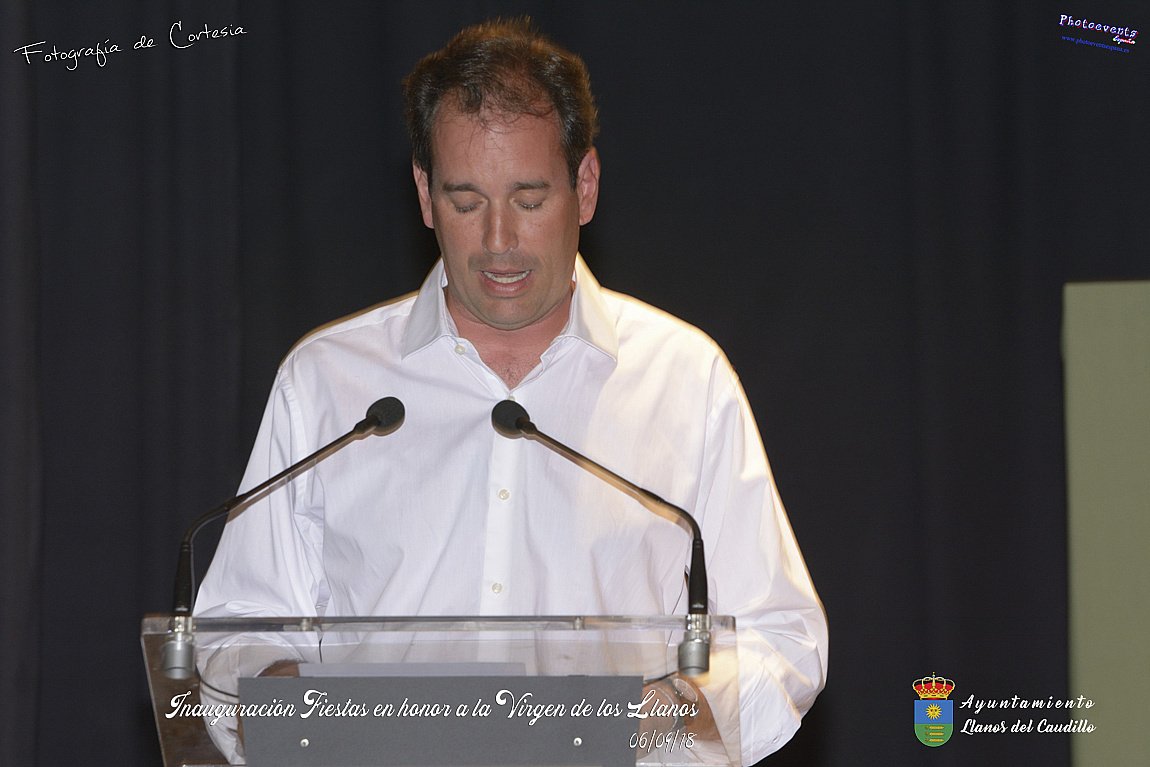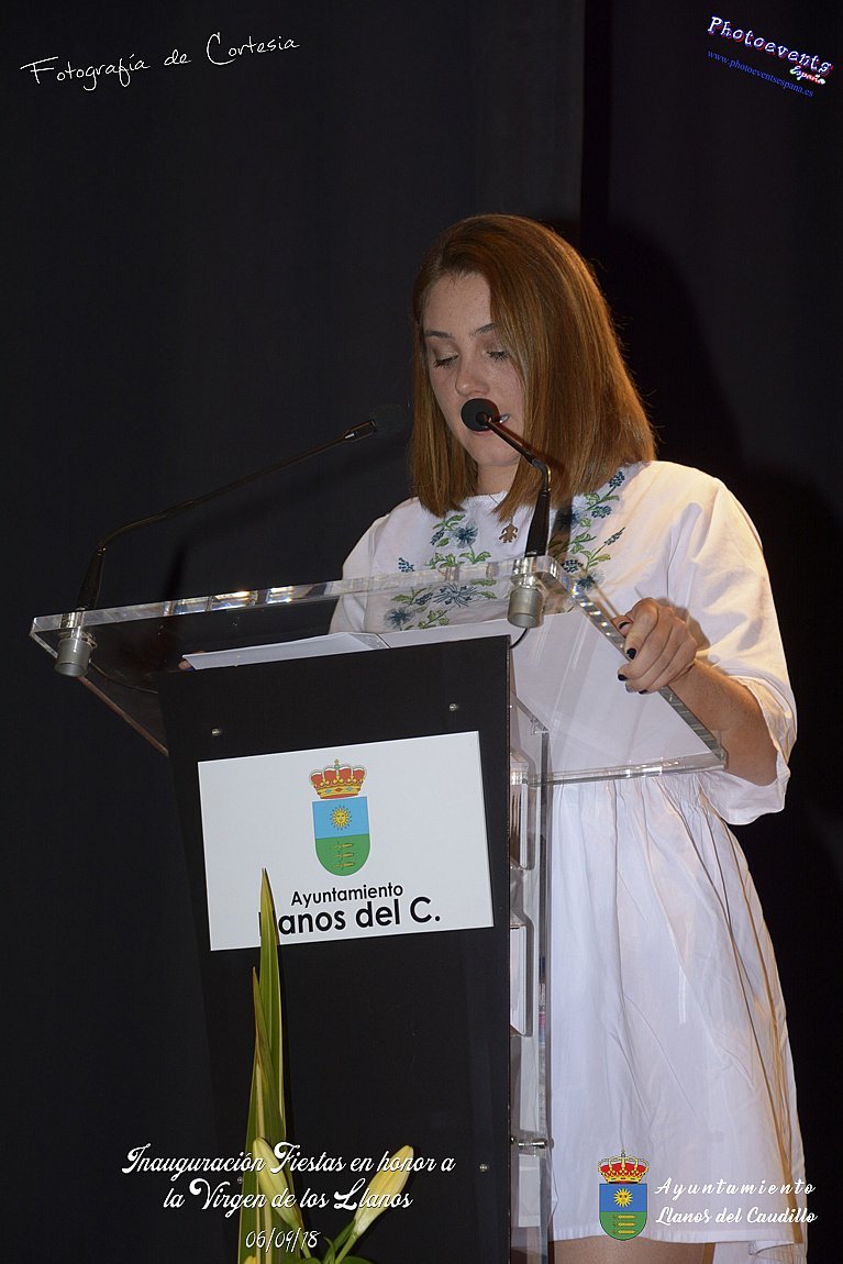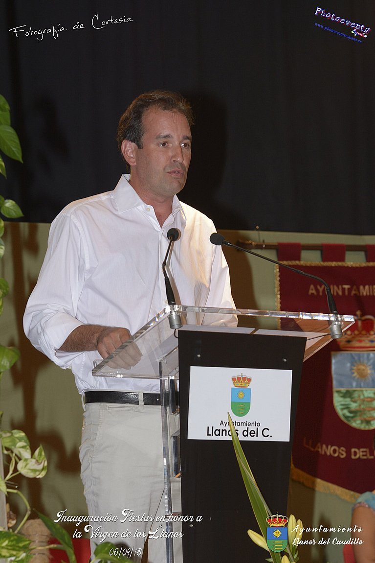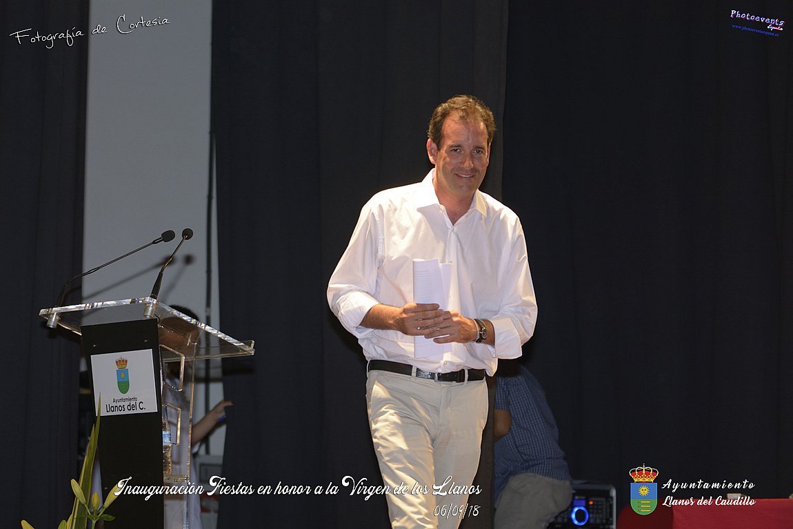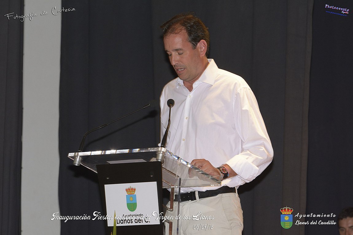 Fotografías realizadas durante el acto de inauguración de las Fiestas en Honor a la Virgen de los Llanos , entregandose los diplomas alos niños de la ludoteca y campamento de verano , para posteriormente realizar el correspondiente pregón que este año corria a cargo de D. Pedro Castañeda Taladriz (nieto de D. Pedro Castañeda Cagigas, arquitecto que diseño el pueblo de Llanos del Caudillo).  Terminando el acto con la correspondiente polvora y un aperitivo para todas las personas. El acto tenia lugar en el Salón Cultural el día 06 de Septiembre de 2018 en la localidad de Llanos del Caudillo, provincia de Ciudad Real .