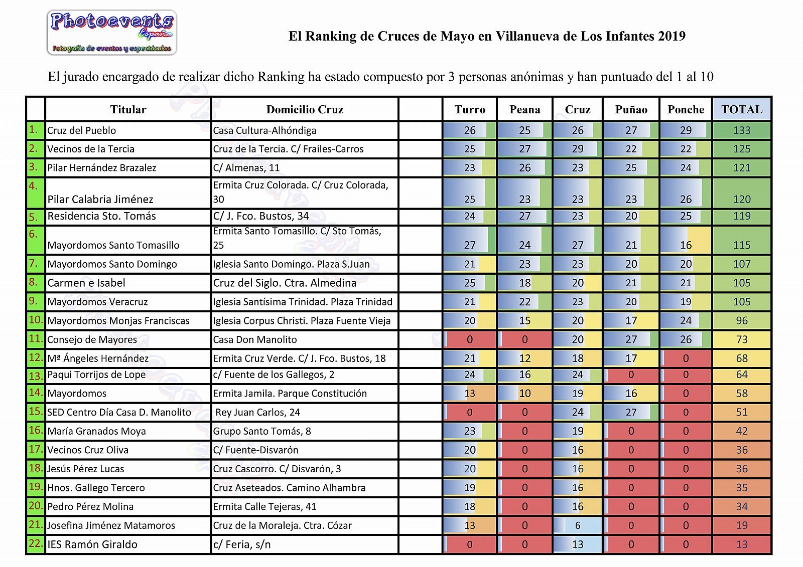 Ranking realizado por Photoeventsespaña que se ha llevado a cabo durante el día de Cruces de Mayo , el cual ha sido posible gracias a la colaboración de 3 personas anónimas que han puntuado con una escala del 1 al 10 en las disitintas cruces inscritas y adornadas con motivo de esta fiesta, valorando el Turro, La Cruz, La Peana, El Puñao y el correspondiente Ponche. Como venimos realizando desde hace varios años dentro de las fiestas de Cruces y Mayos declaradas de interés turístico regional desde 1999 en la localidad de Villanueva de los Infantes , Ciudad Real.