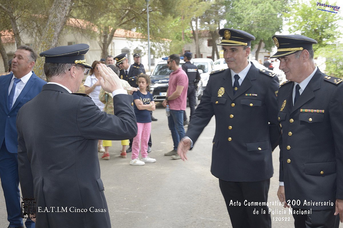 Fotografía realizada con motivo de la conmemoración del 200 aniversario a la Policía Nacional, el evento a contado con la presencia de autoridades como el comisario principal Félix Antolín Diego, jefe superior de Policía de Castilla-La Mancha, la subdelegada del Gobierno en Ciudad Real, María Ángeles Herreros Ramírez, la alcaldesa de Alcázar de San Juan, Rosa Melchor Quiralte, el alcalde de Cinco Casas, Miguel Ángel Rosado Huertas, y el comisario jefe de la Comisaría de Policía de Alcázar, Julián Maroto. Dicho evento tenía lugar el día 120522, en la localidad de Cinco Casas, Ciudad Real.