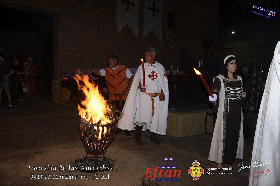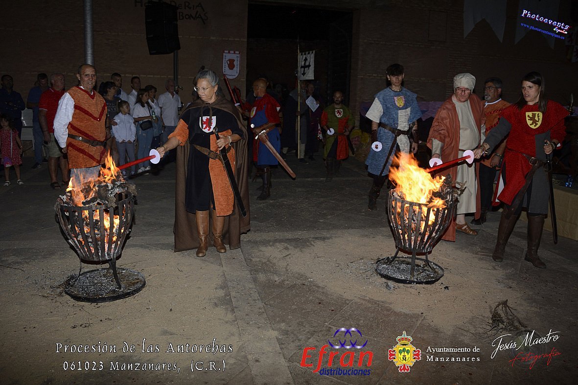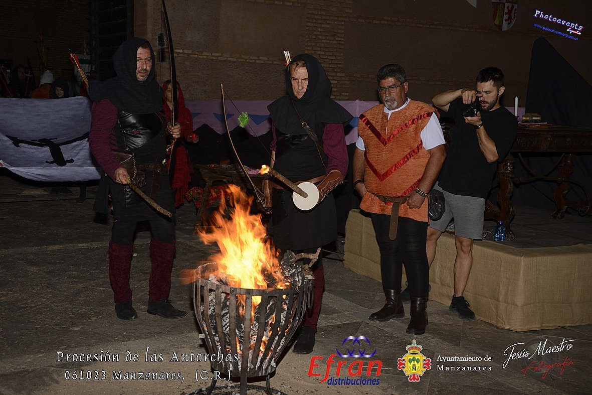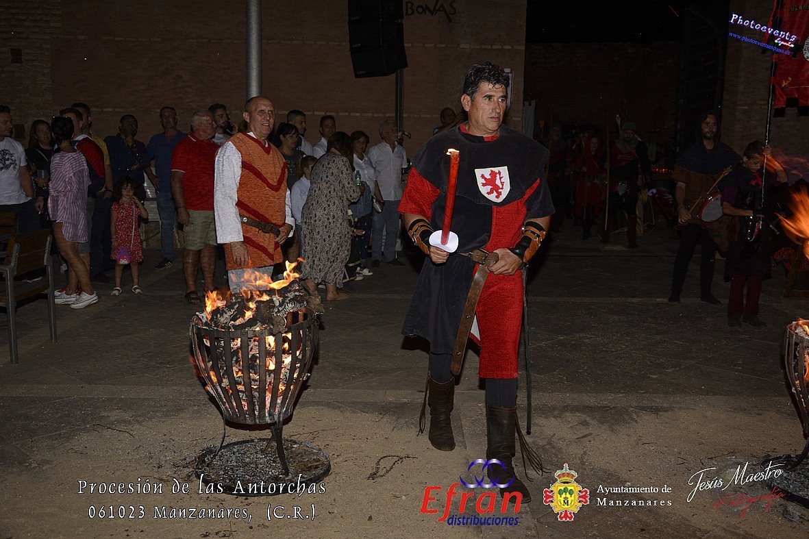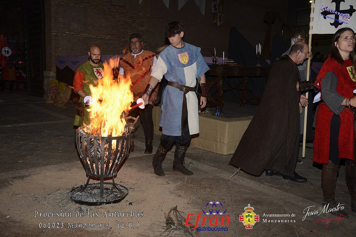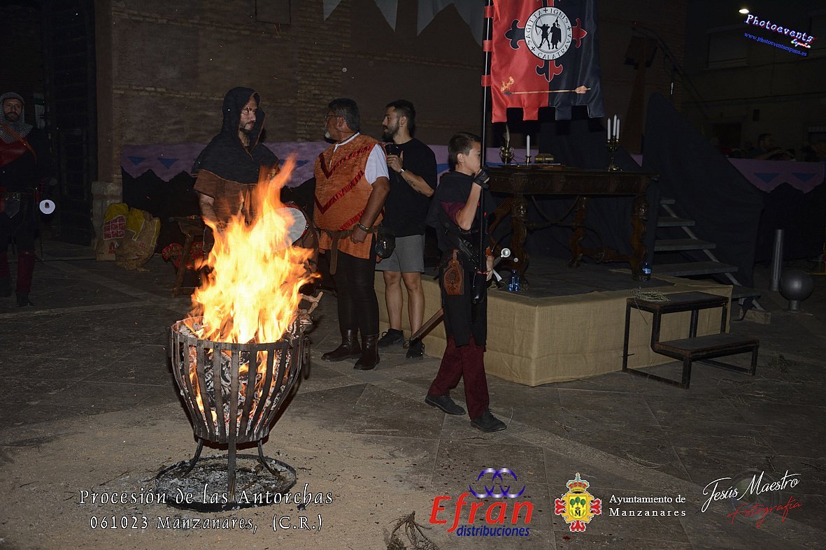 Procesión de las antorchas y nombramientos de Caballeros y Damas de la encomienda, que tenía lugar en la noche del día 061023, enmarcado dentro de los actos organizados con motivo de la realización de las X Jornadas Histórico Turísticas de Manzanares Medieval que se tienen lugar durante los días del 6 al 8 de Octubre en la localidad de Manzanares, Ciudad Real.