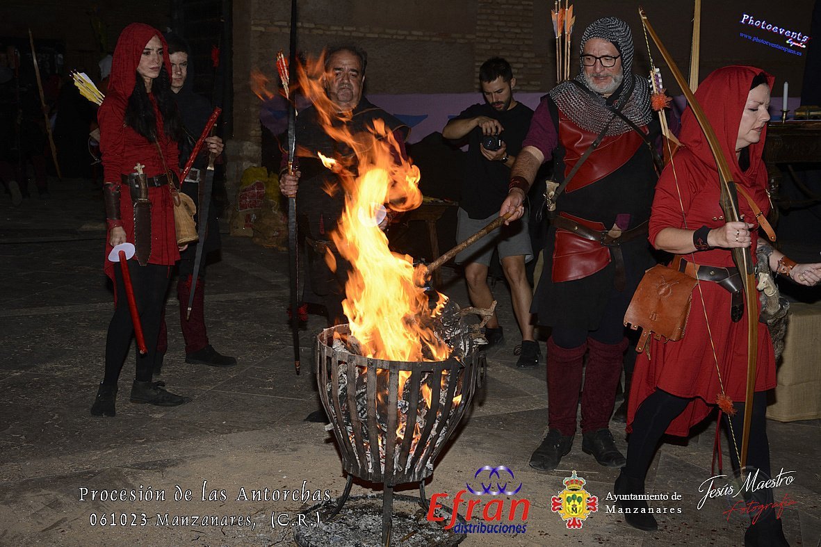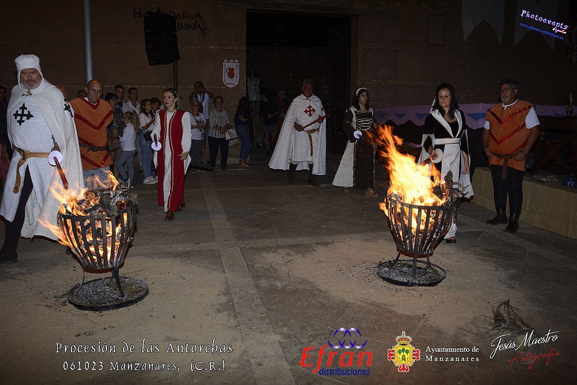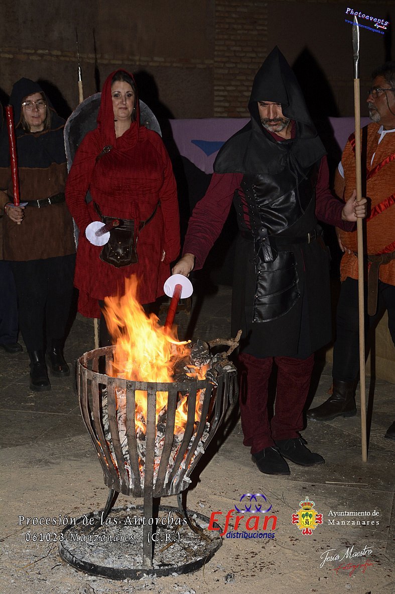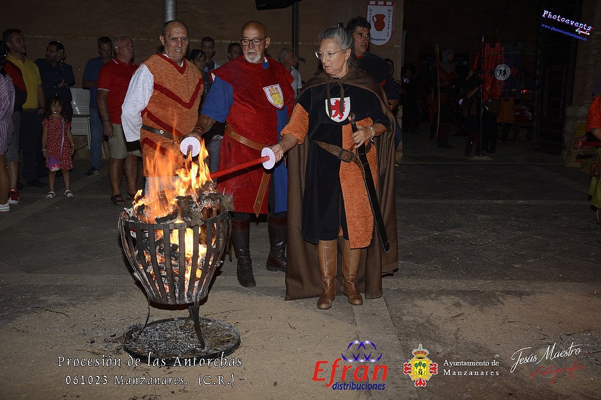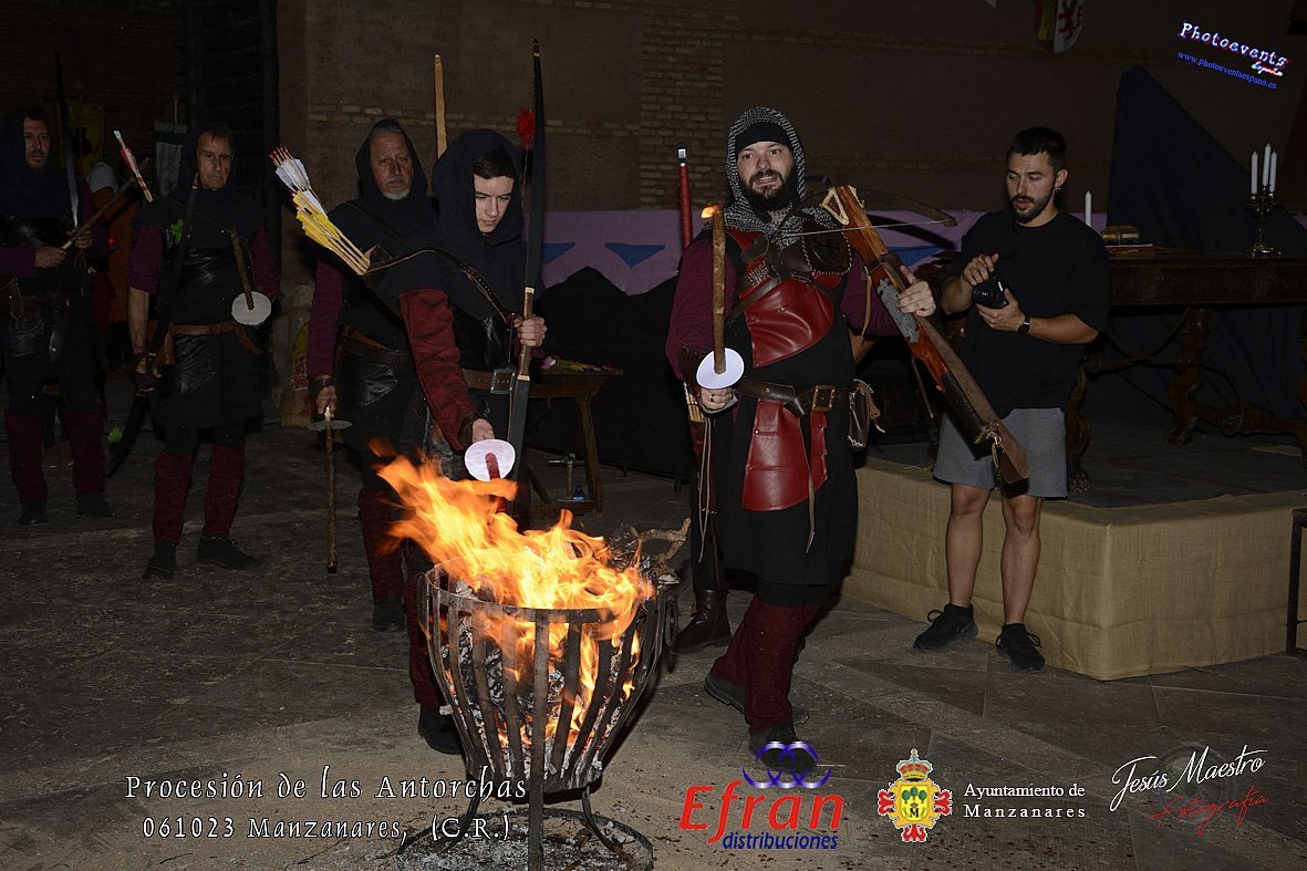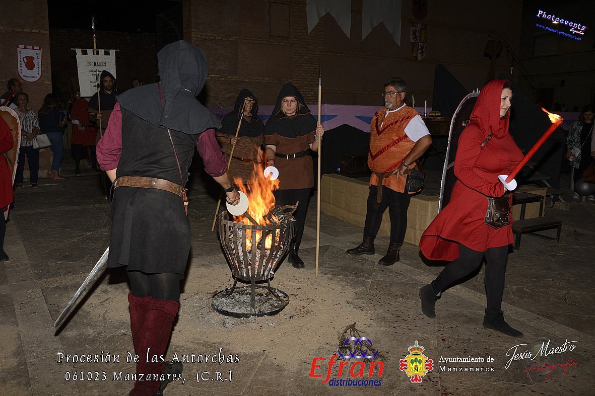 Procesión de las antorchas y nombramientos de Caballeros y Damas de la encomienda, que tenía lugar en la noche del día 061023, enmarcado dentro de los actos organizados con motivo de la realización de las X Jornadas Histórico Turísticas de Manzanares Medieval que se tienen lugar durante los días del 6 al 8 de Octubre en la localidad de Manzanares, Ciudad Real.