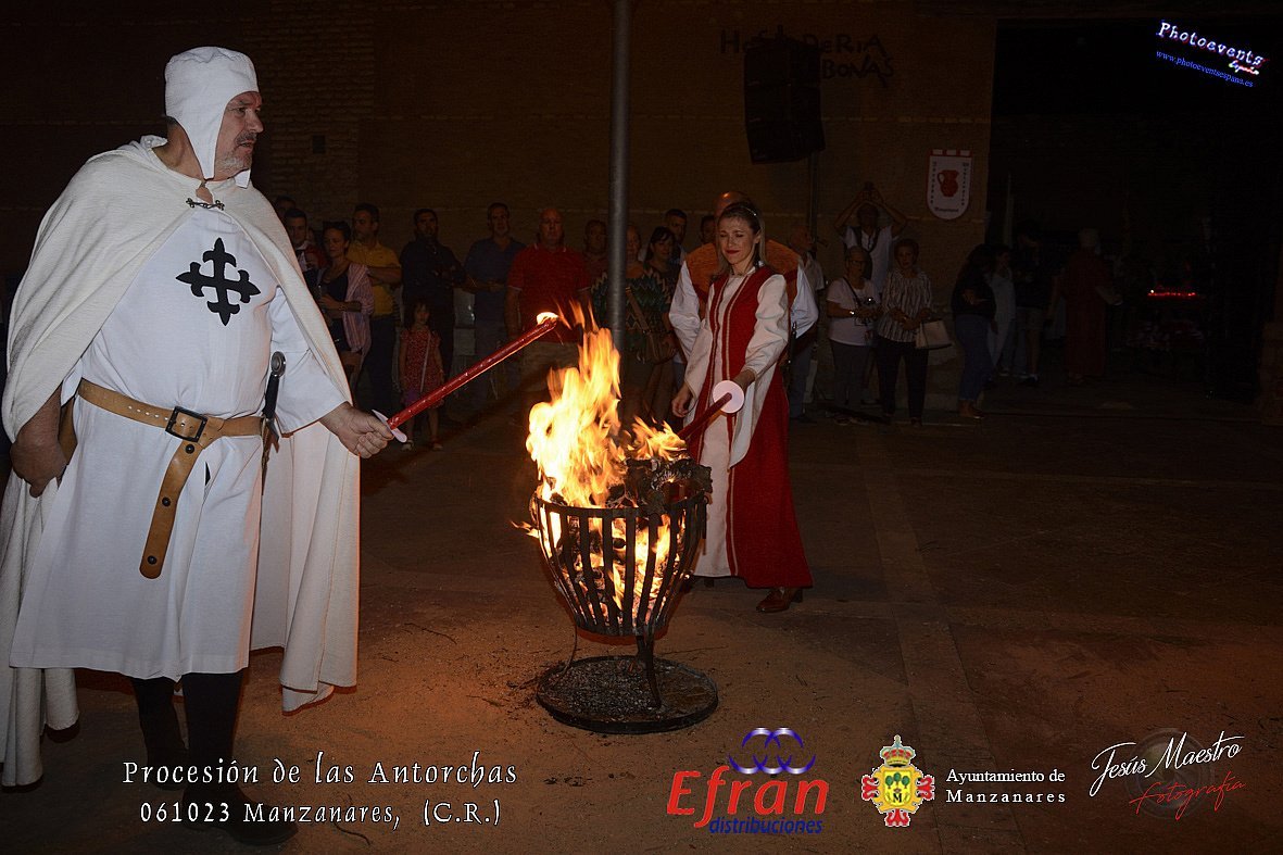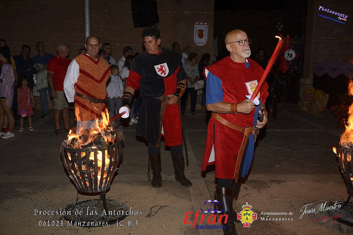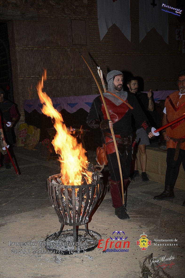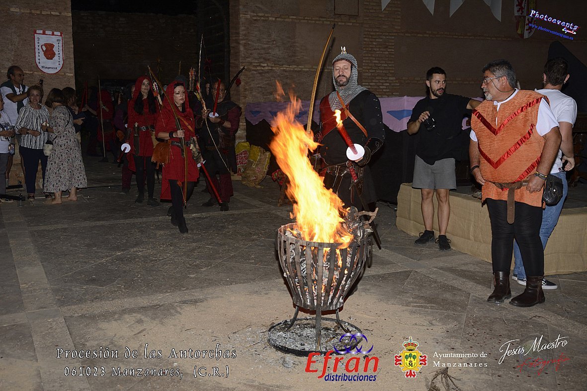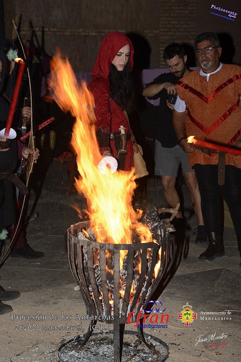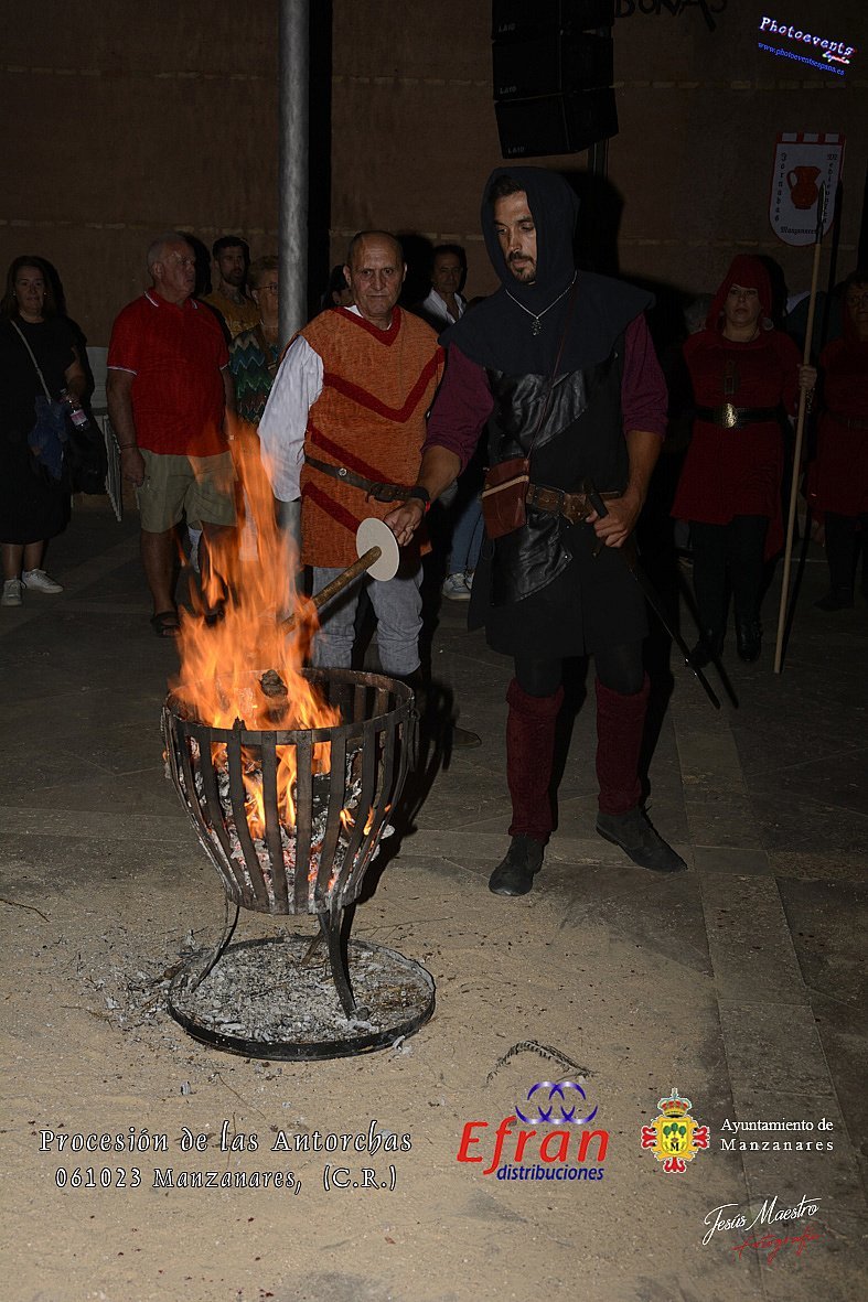 Procesión de las antorchas y nombramientos de Caballeros y Damas de la encomienda, que tenía lugar en la noche del día 061023, enmarcado dentro de los actos organizados con motivo de la realización de las X Jornadas Histórico Turísticas de Manzanares Medieval que se tienen lugar durante los días del 6 al 8 de Octubre en la localidad de Manzanares, Ciudad Real.