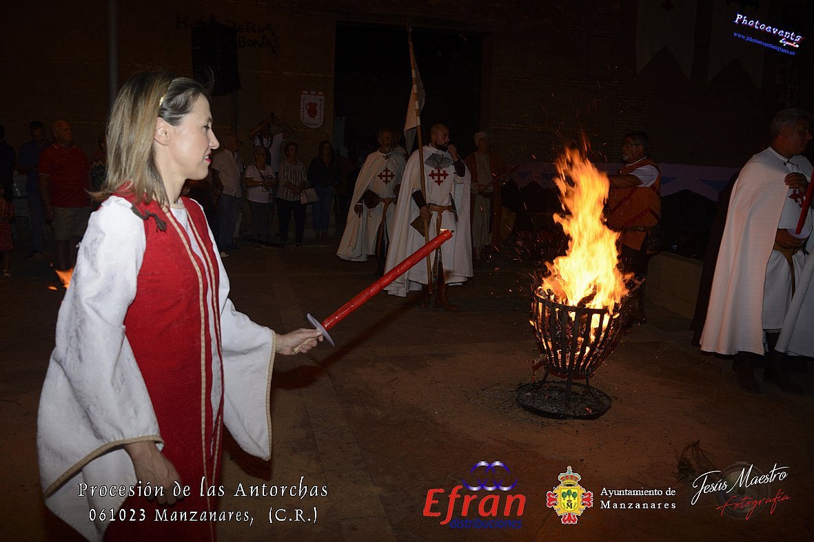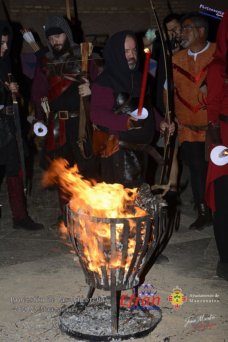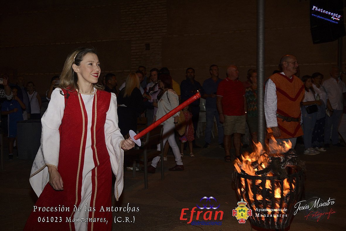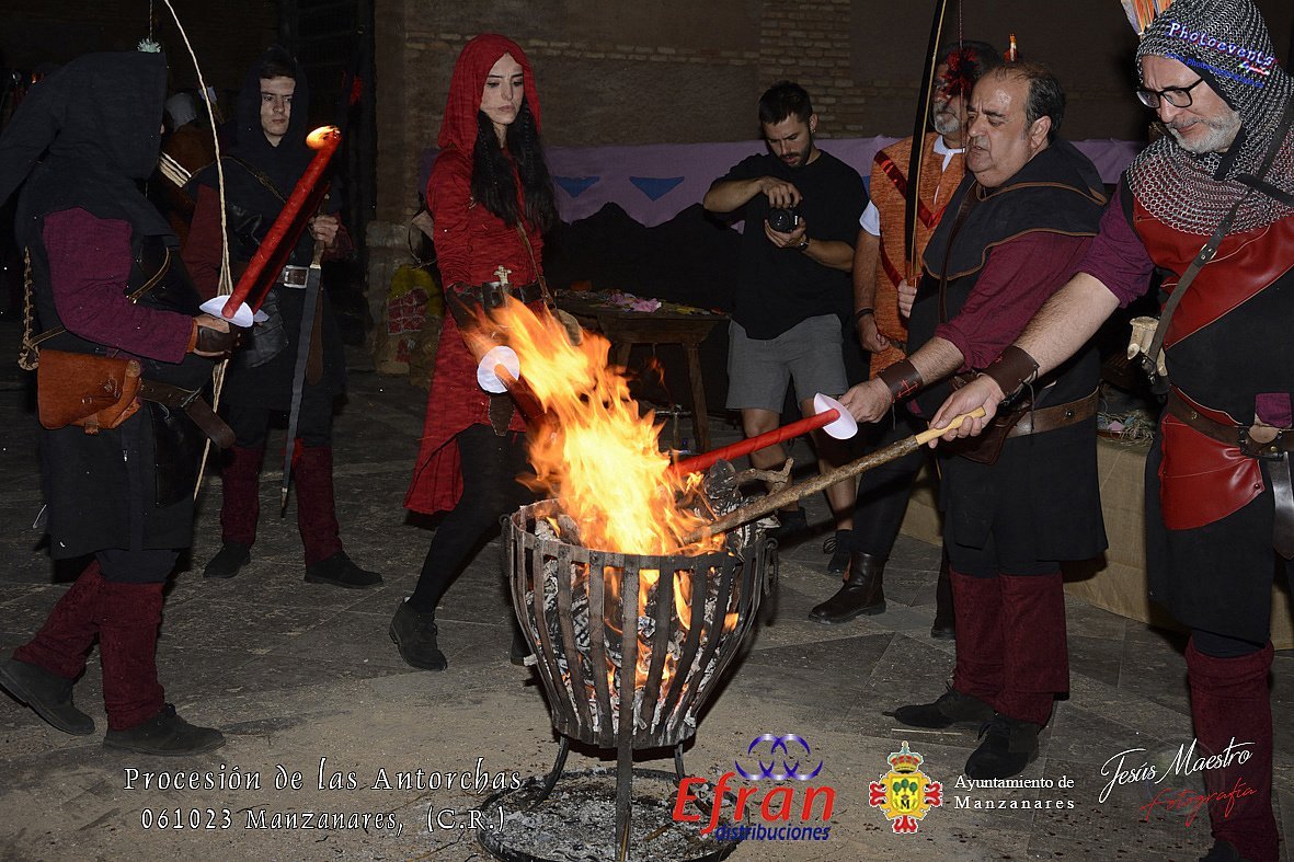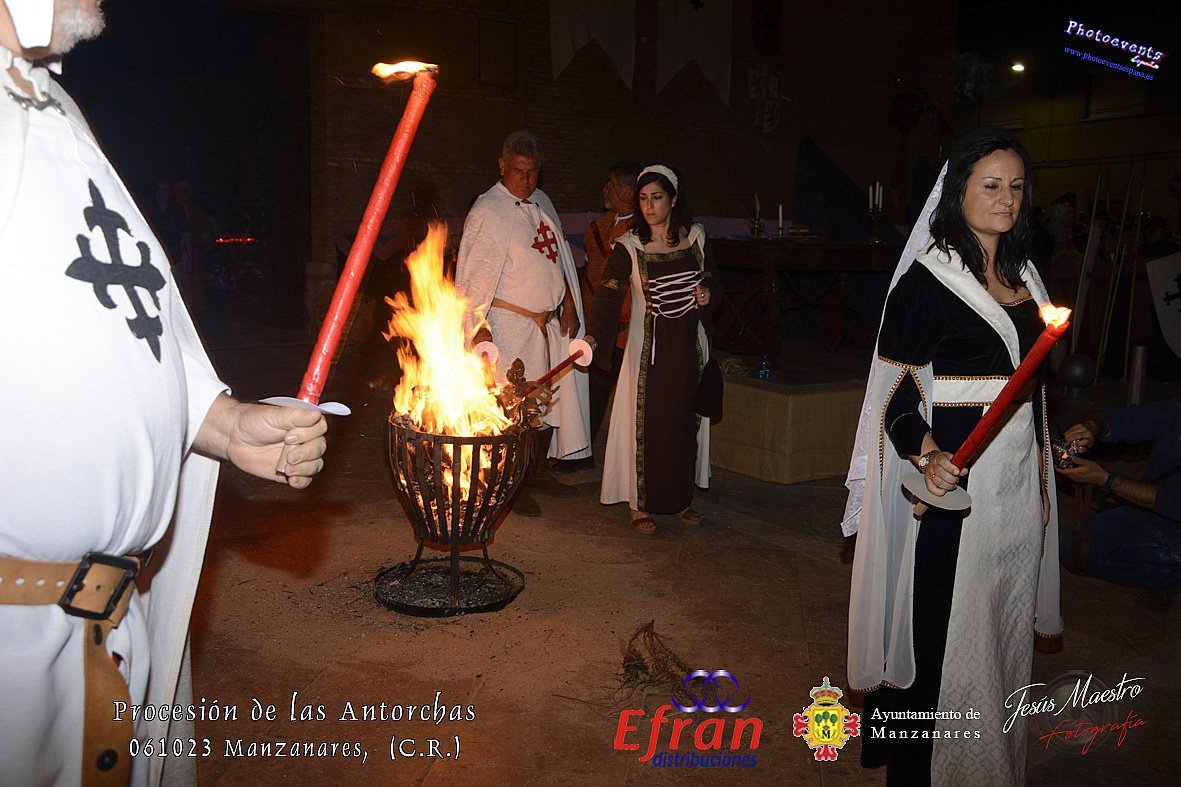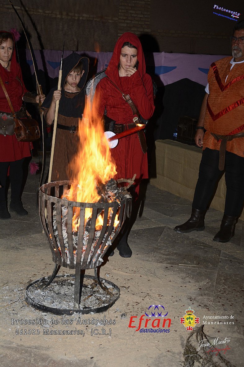 Procesión de las antorchas y nombramientos de Caballeros y Damas de la encomienda, que tenía lugar en la noche del día 061023, enmarcado dentro de los actos organizados con motivo de la realización de las X Jornadas Histórico Turísticas de Manzanares Medieval que se tienen lugar durante los días del 6 al 8 de Octubre en la localidad de Manzanares, Ciudad Real.