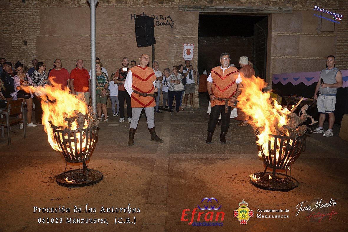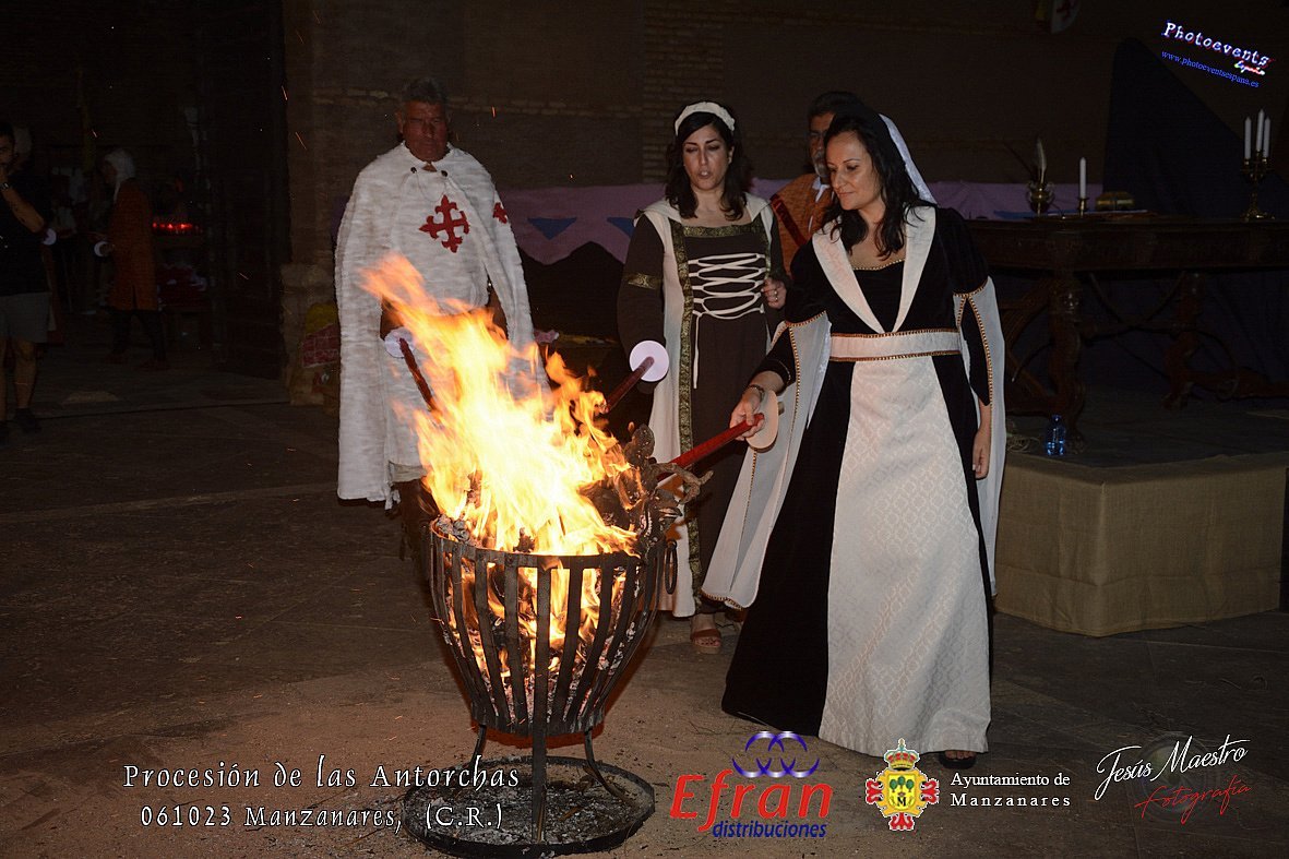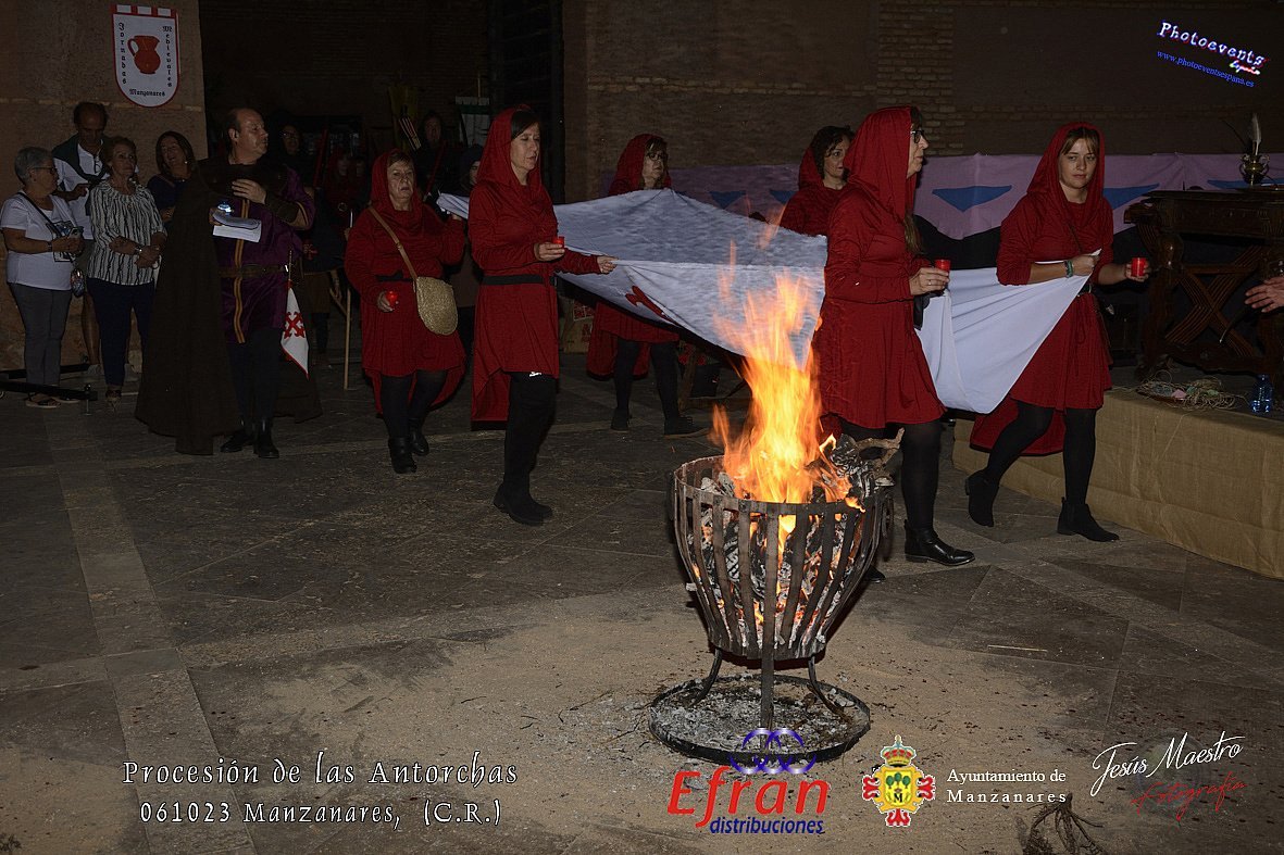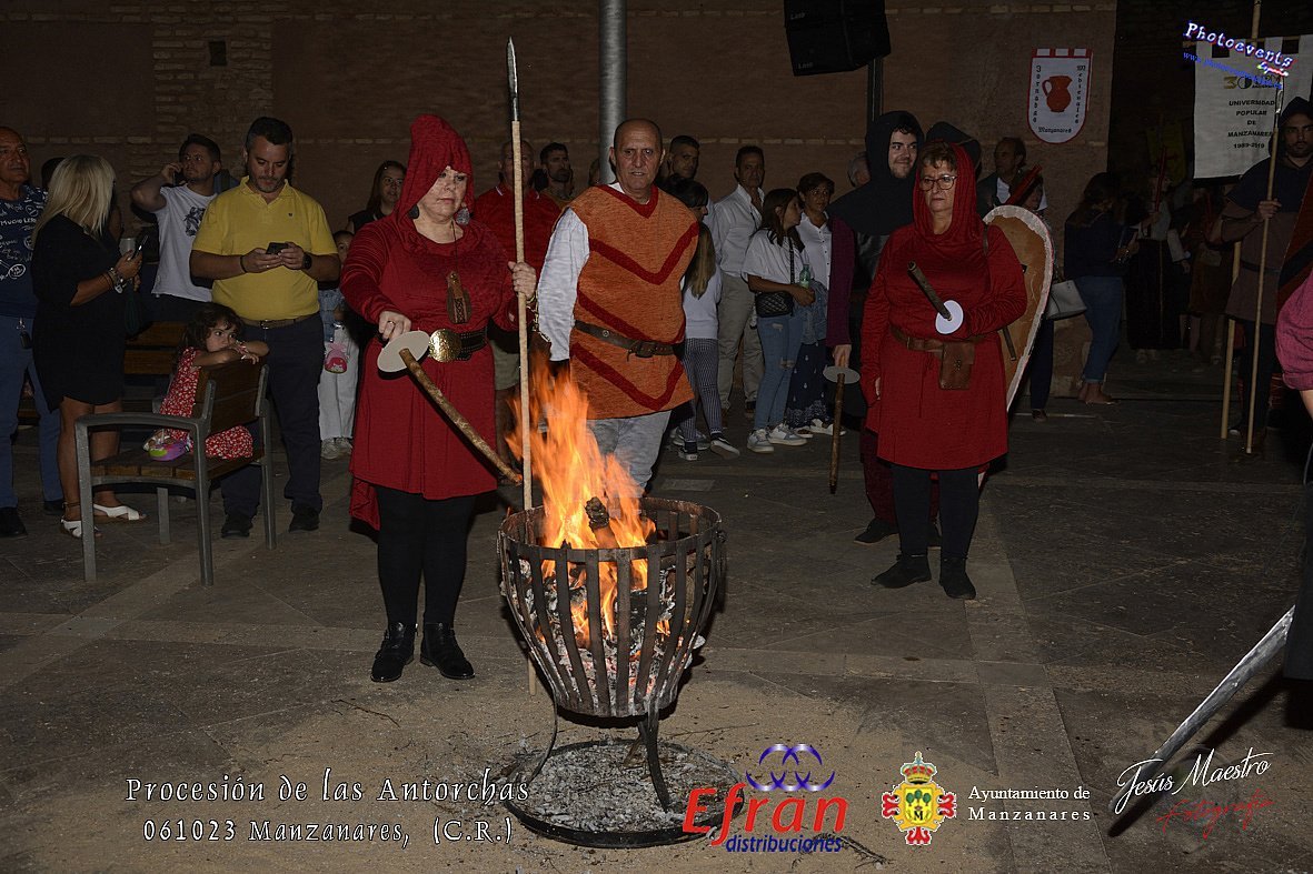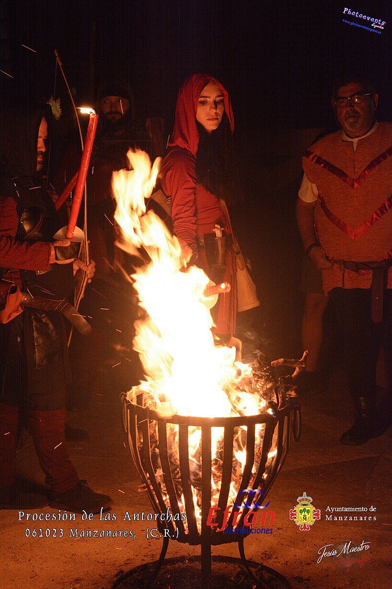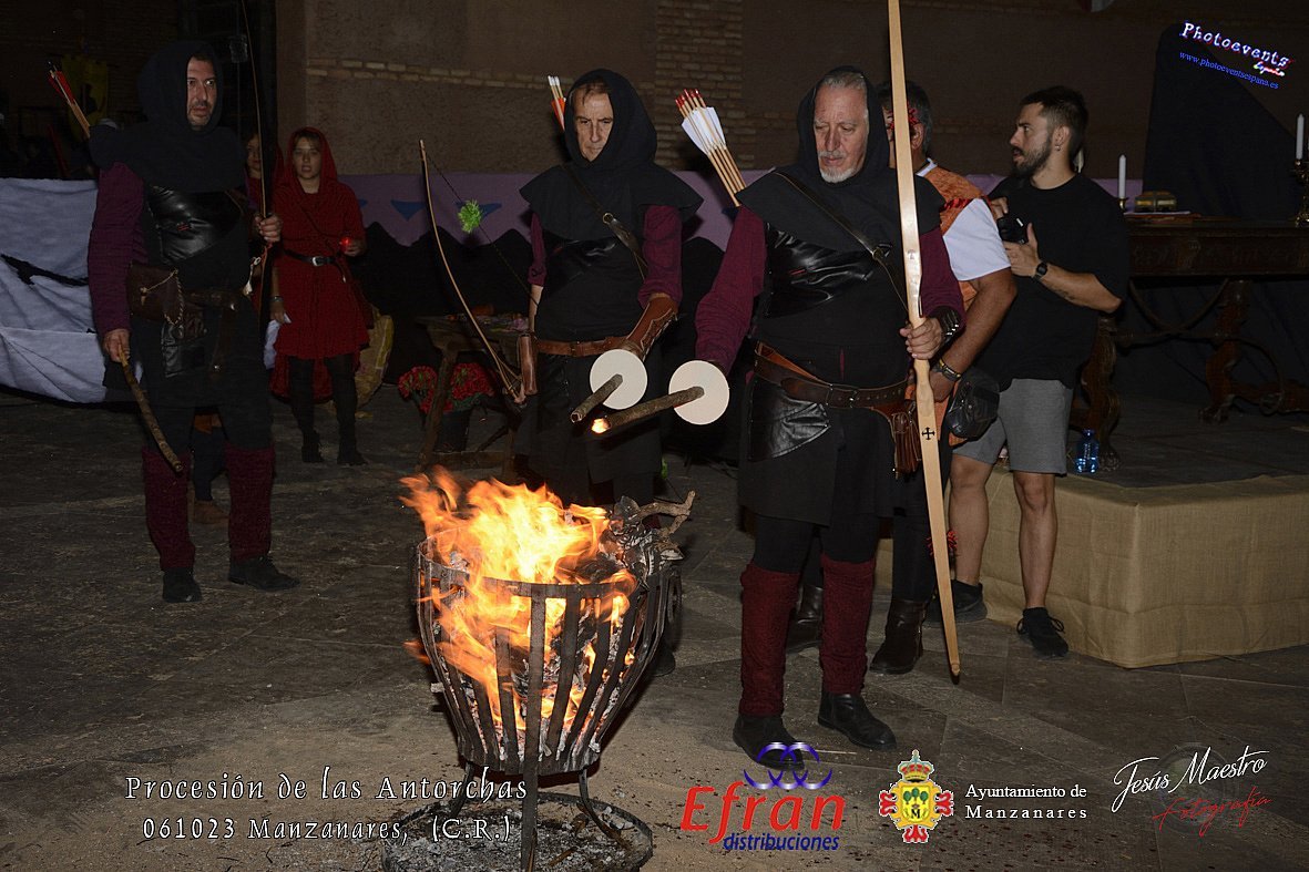 Procesión de las antorchas y nombramientos de Caballeros y Damas de la encomienda, que tenía lugar en la noche del día 061023, enmarcado dentro de los actos organizados con motivo de la realización de las X Jornadas Histórico Turísticas de Manzanares Medieval que se tienen lugar durante los días del 6 al 8 de Octubre en la localidad de Manzanares, Ciudad Real.