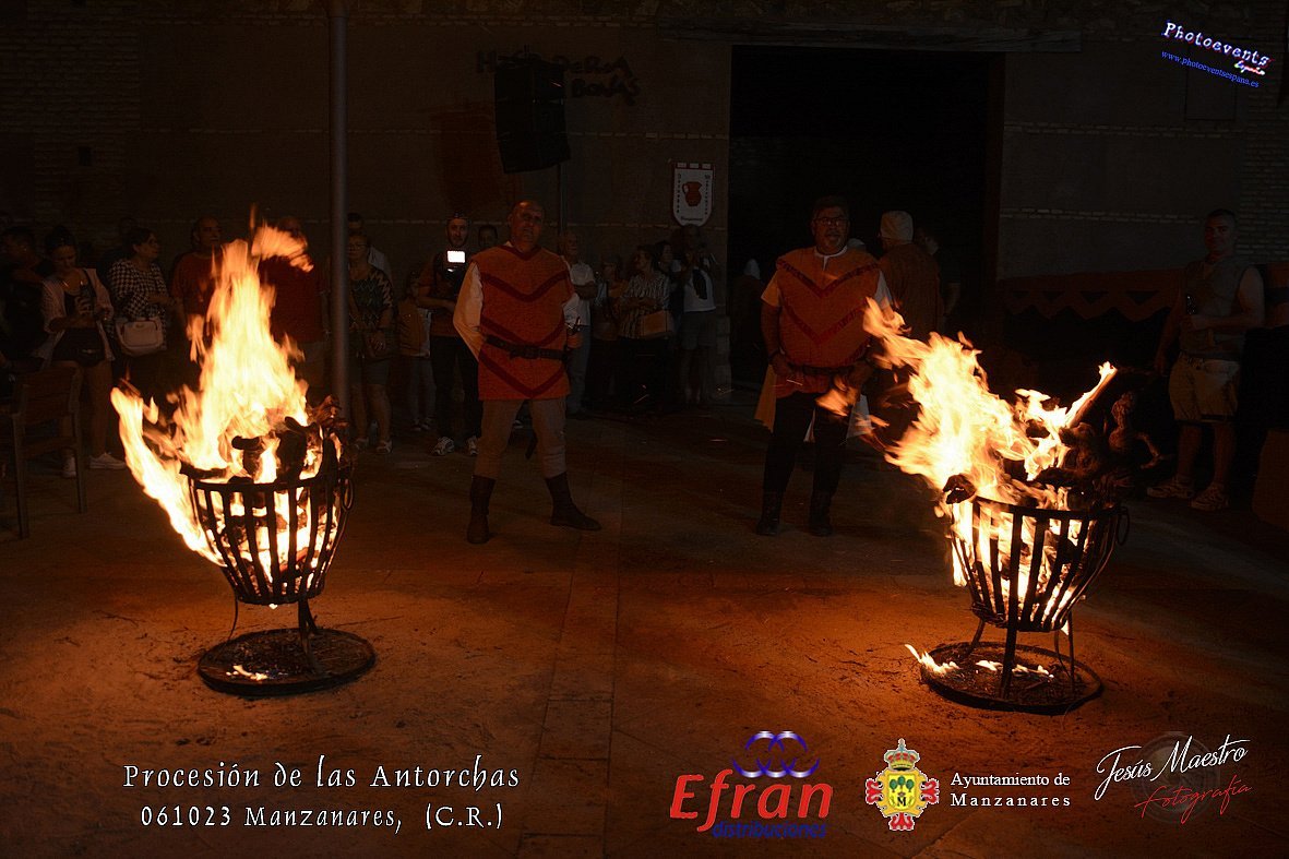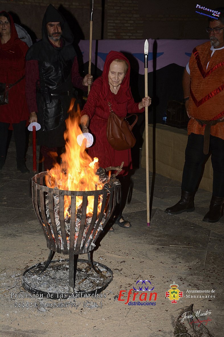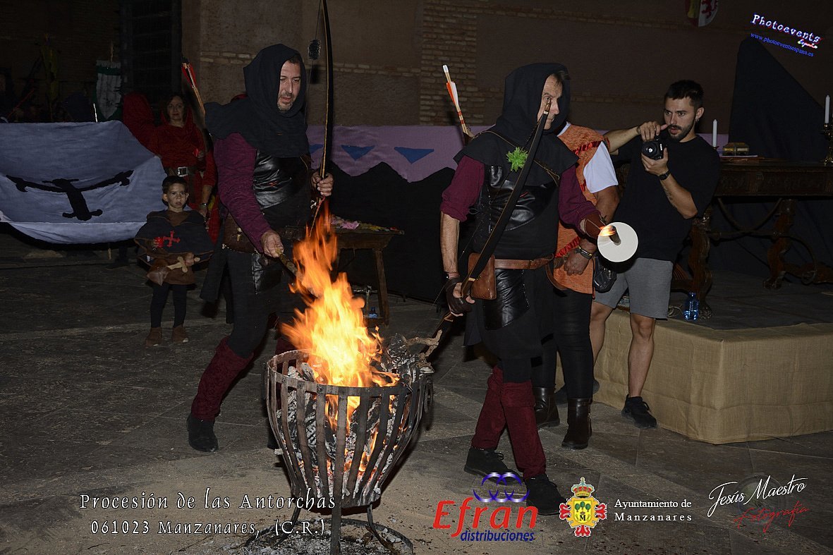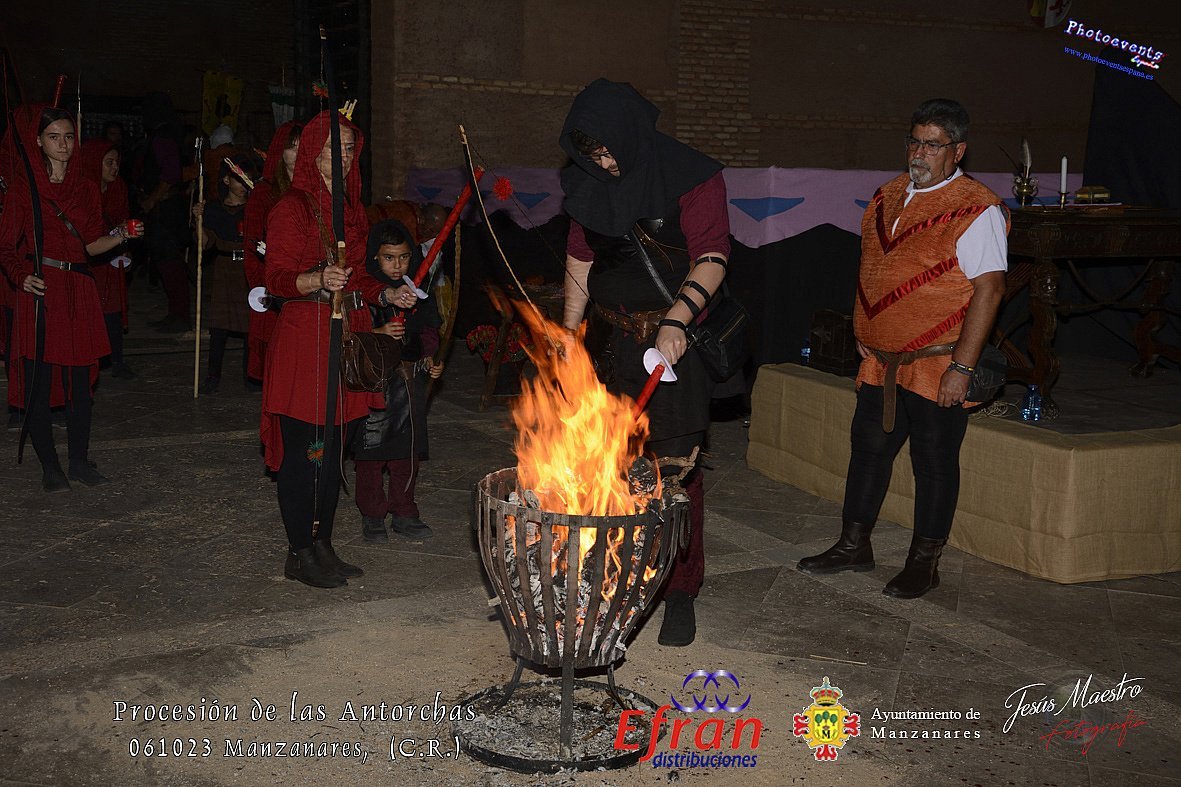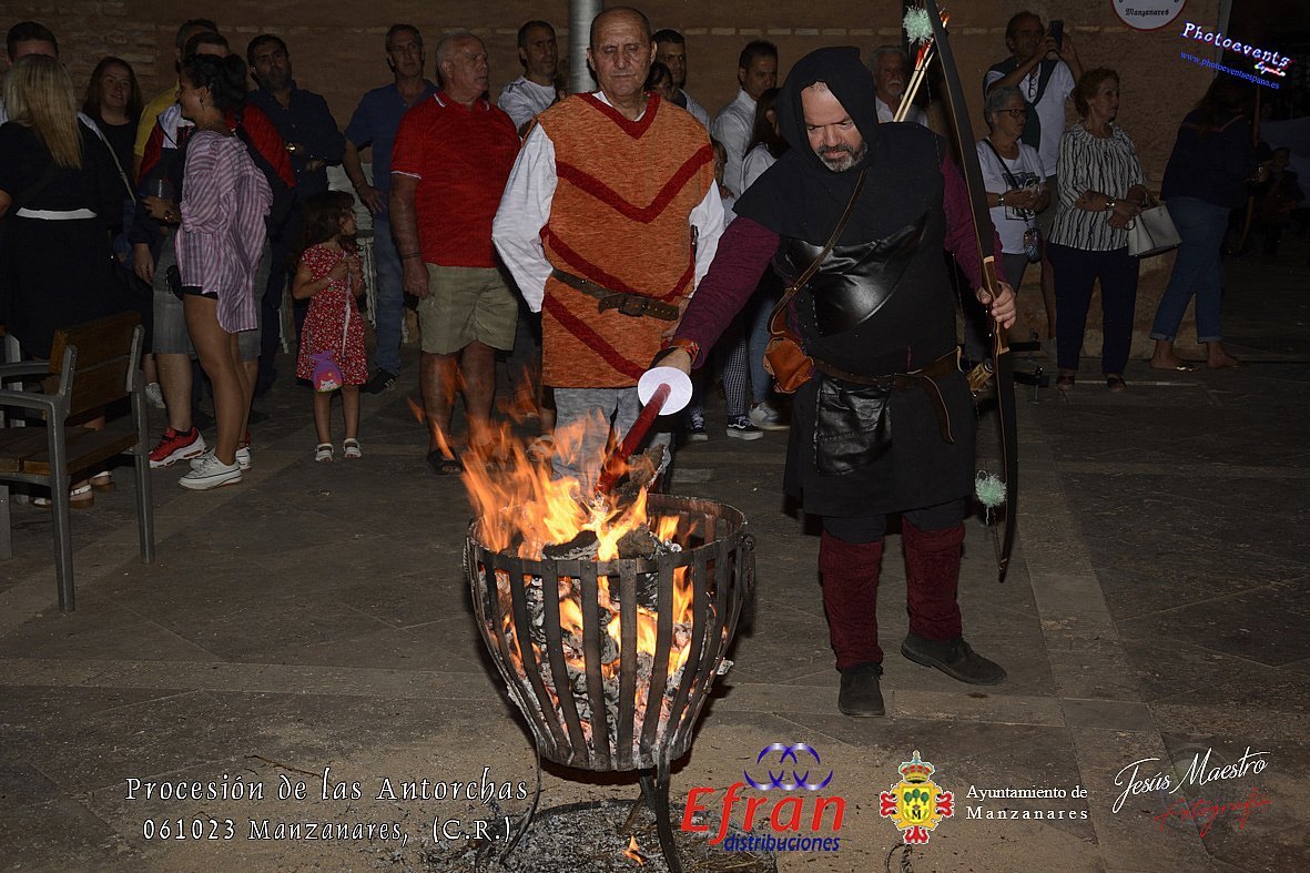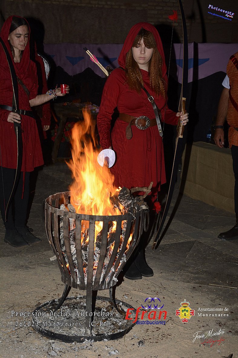 Procesión de las antorchas y nombramientos de Caballeros y Damas de la encomienda, que tenía lugar en la noche del día 061023, enmarcado dentro de los actos organizados con motivo de la realización de las X Jornadas Histórico Turísticas de Manzanares Medieval que se tienen lugar durante los días del 6 al 8 de Octubre en la localidad de Manzanares, Ciudad Real.