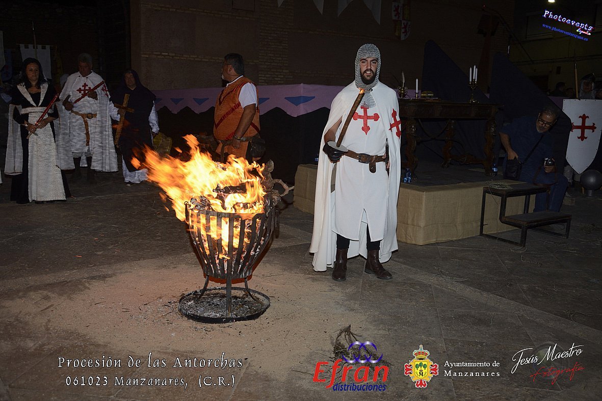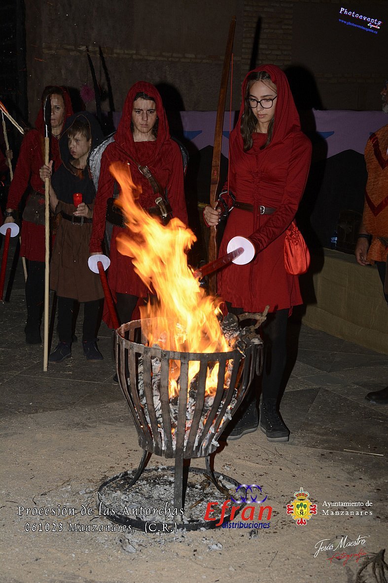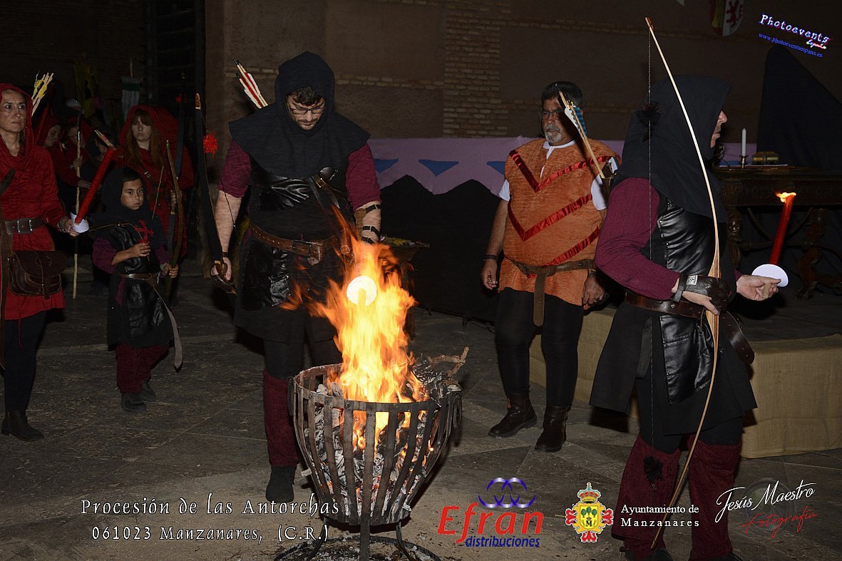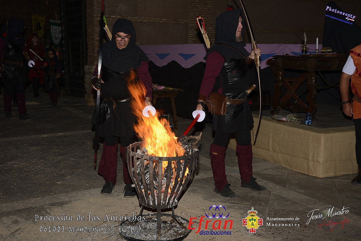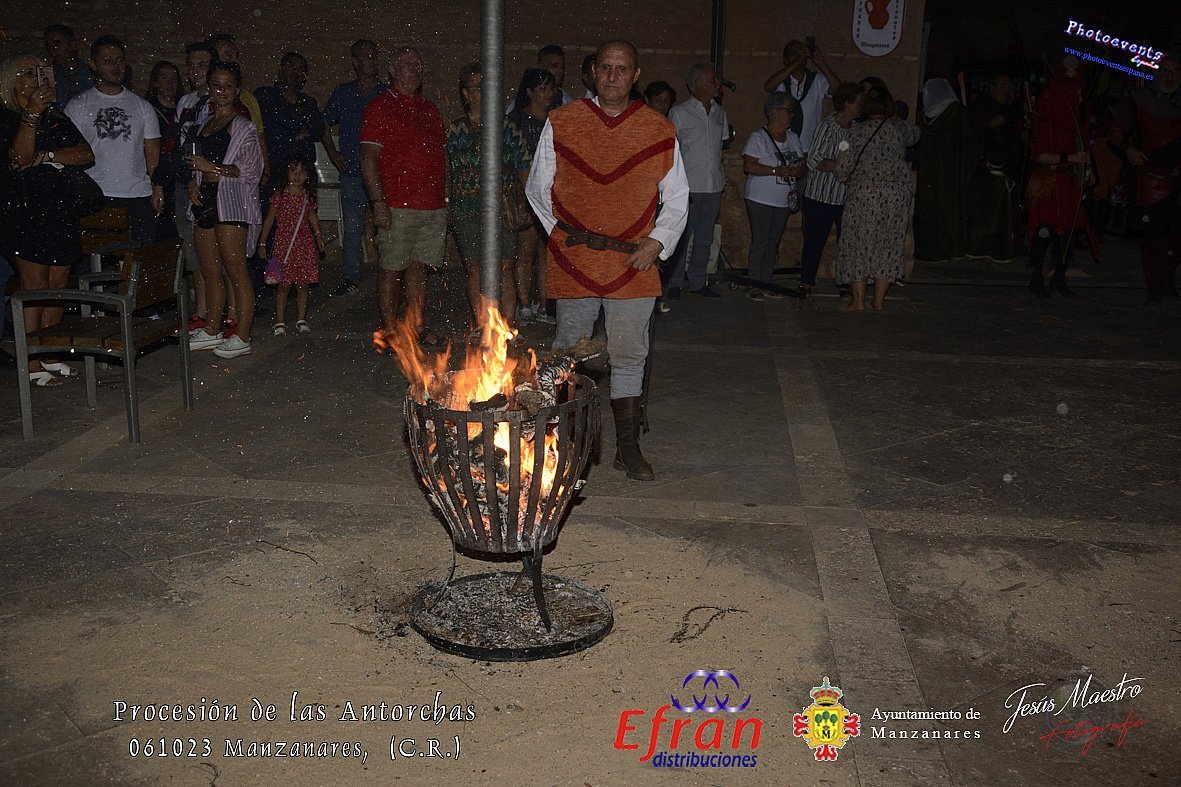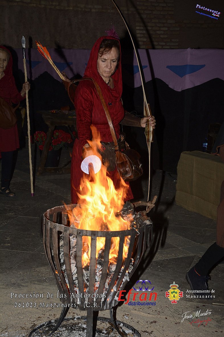 Procesión de las antorchas y nombramientos de Caballeros y Damas de la encomienda, que tenía lugar en la noche del día 061023, enmarcado dentro de los actos organizados con motivo de la realización de las X Jornadas Histórico Turísticas de Manzanares Medieval que se tienen lugar durante los días del 6 al 8 de Octubre en la localidad de Manzanares, Ciudad Real.