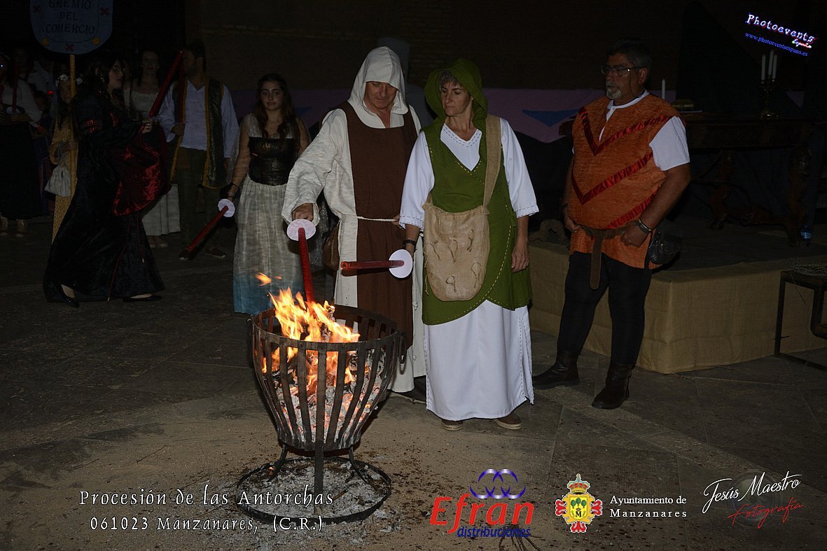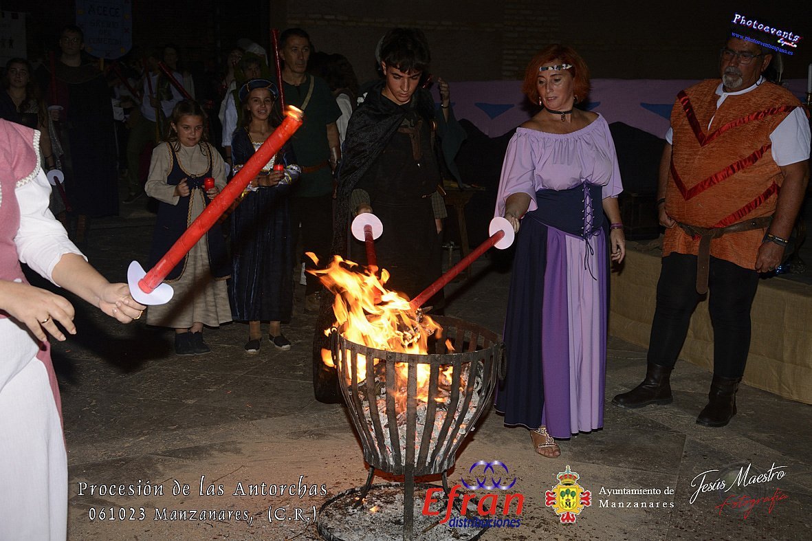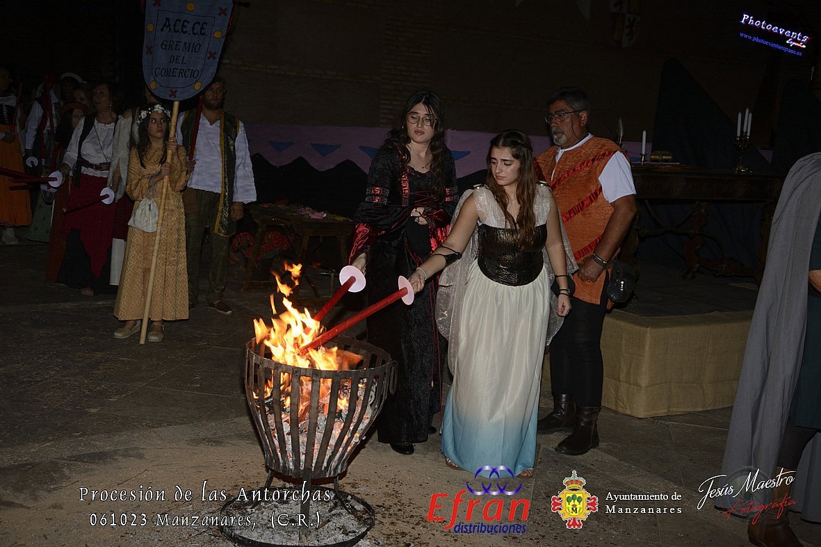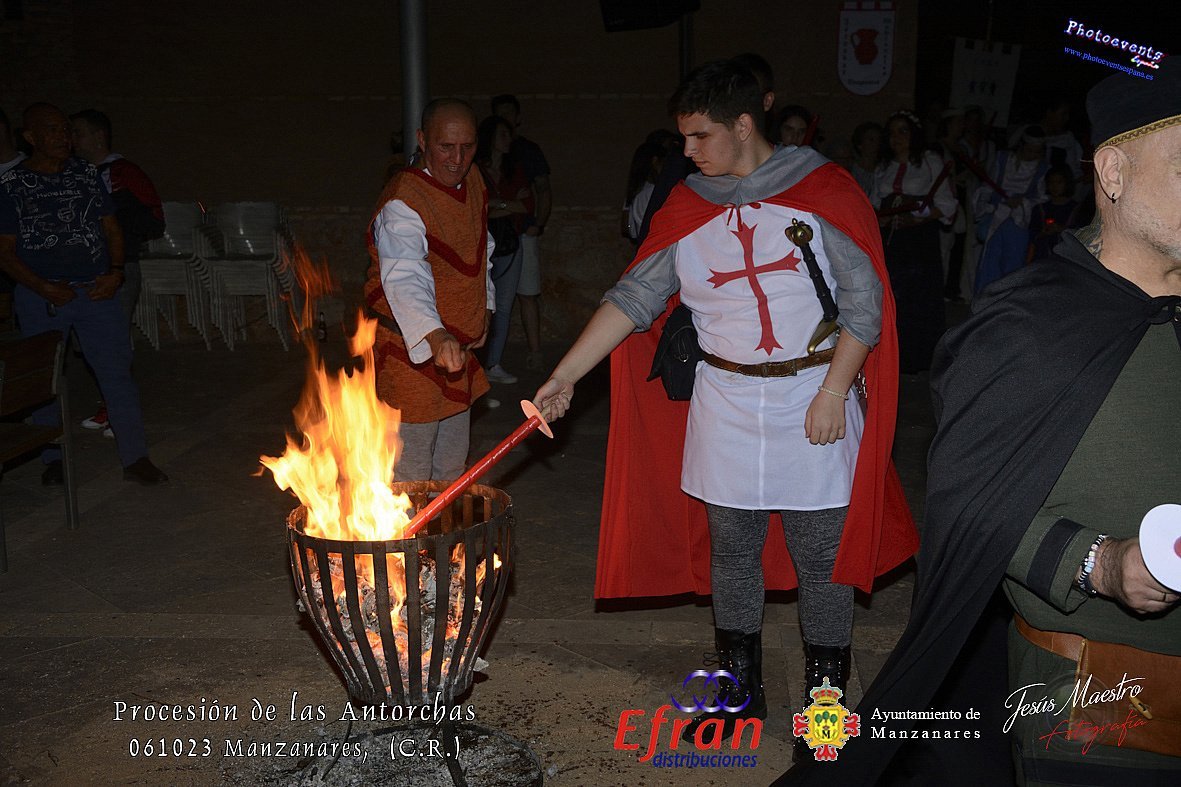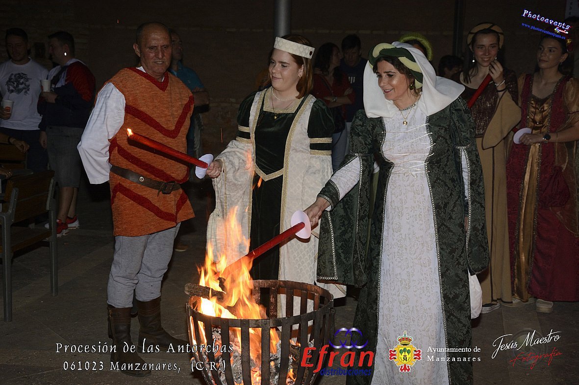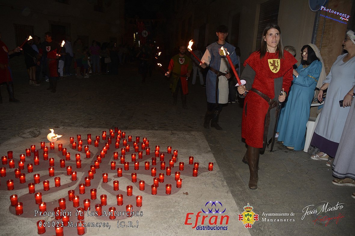 Procesión de las antorchas y nombramientos de Caballeros y Damas de la encomienda, que tenía lugar en la noche del día 061023, enmarcado dentro de los actos organizados con motivo de la realización de las X Jornadas Histórico Turísticas de Manzanares Medieval que se tienen lugar durante los días del 6 al 8 de Octubre en la localidad de Manzanares, Ciudad Real.