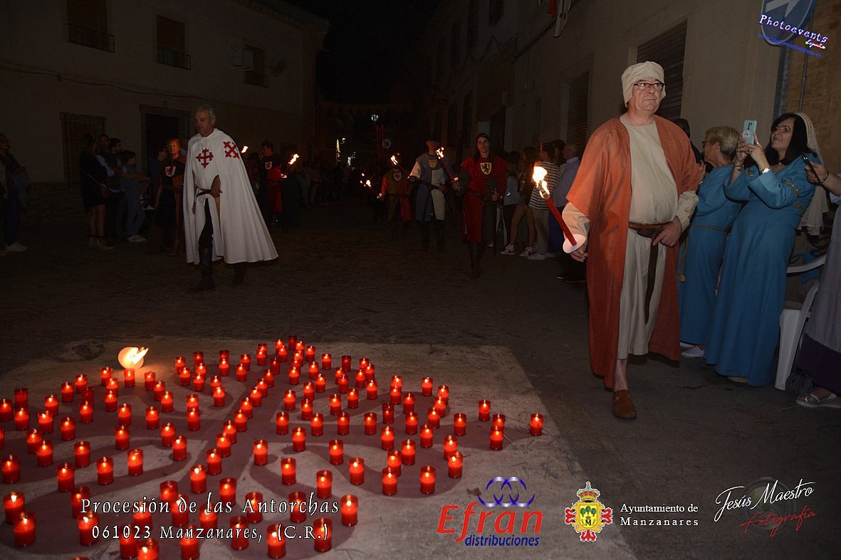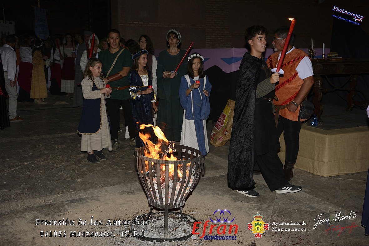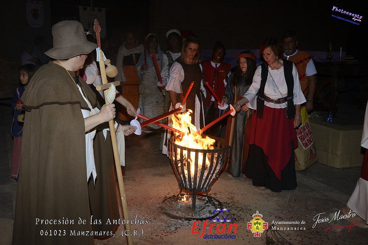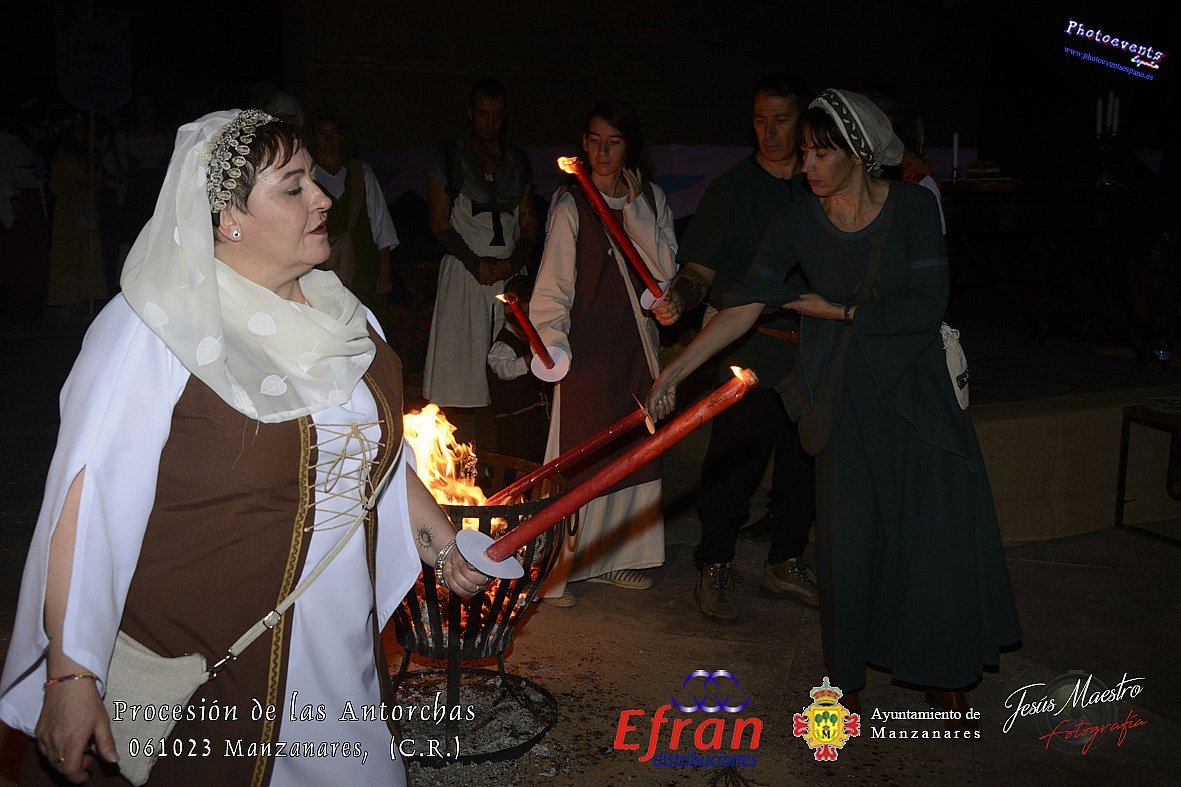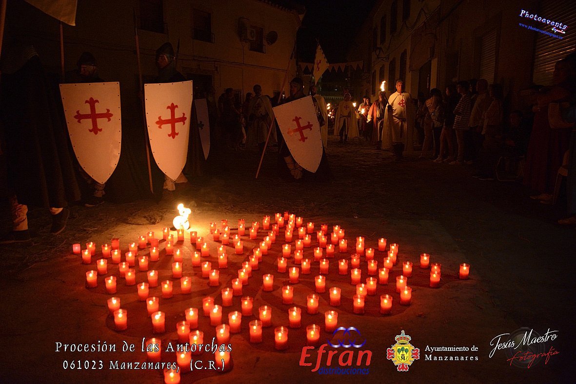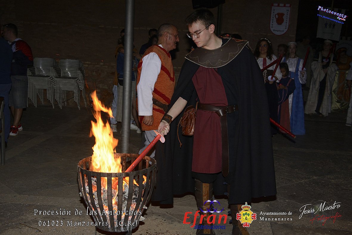 Procesión de las antorchas y nombramientos de Caballeros y Damas de la encomienda, que tenía lugar en la noche del día 061023, enmarcado dentro de los actos organizados con motivo de la realización de las X Jornadas Histórico Turísticas de Manzanares Medieval que se tienen lugar durante los días del 6 al 8 de Octubre en la localidad de Manzanares, Ciudad Real.