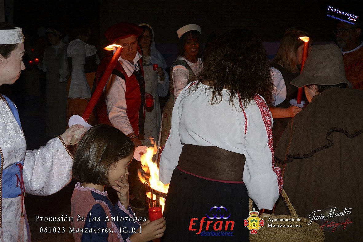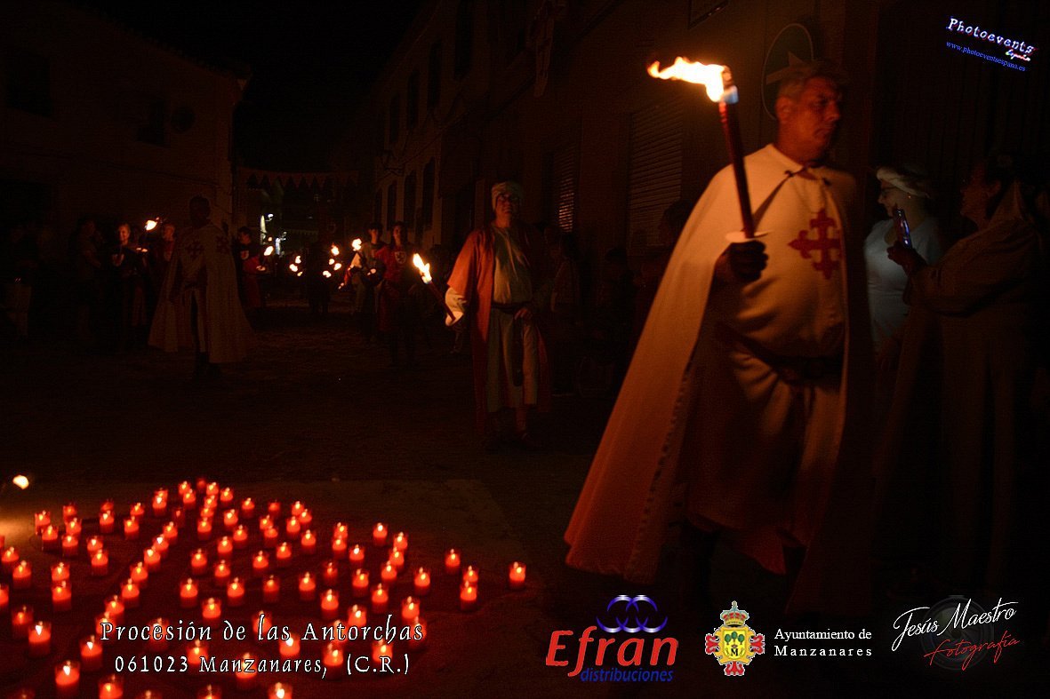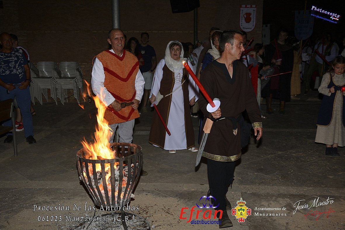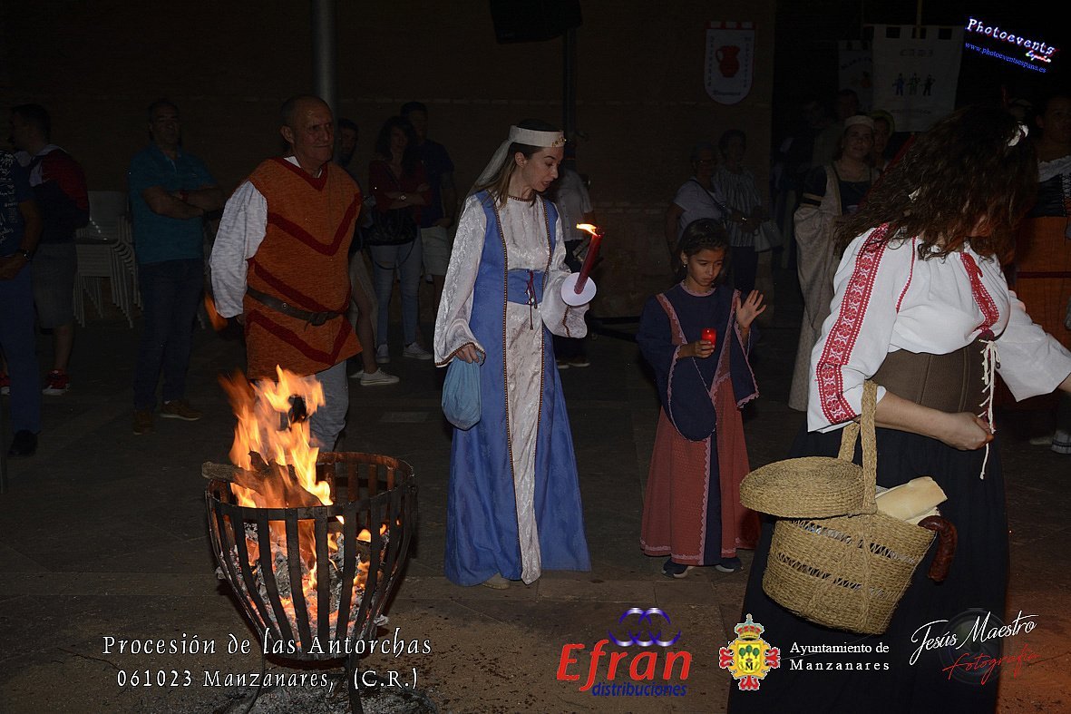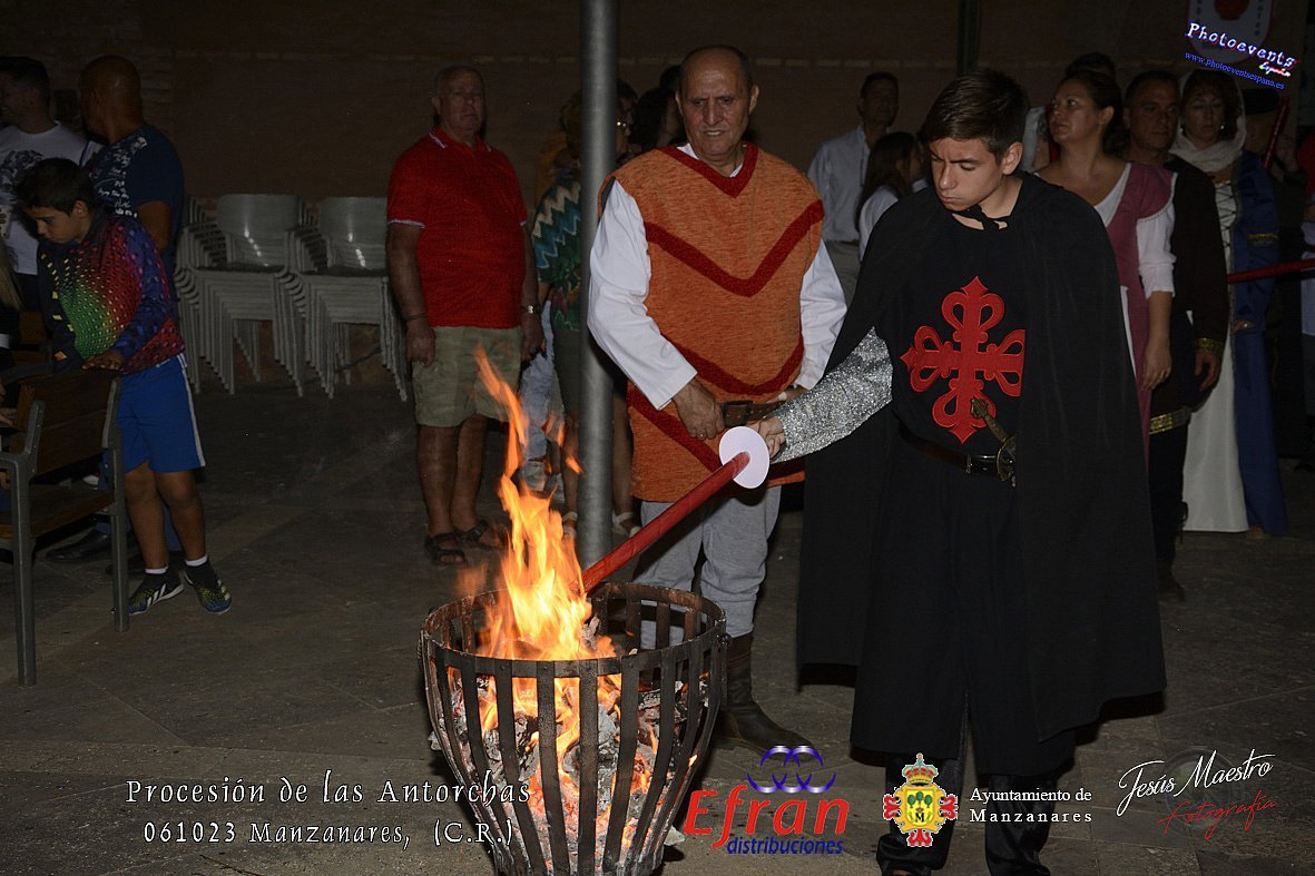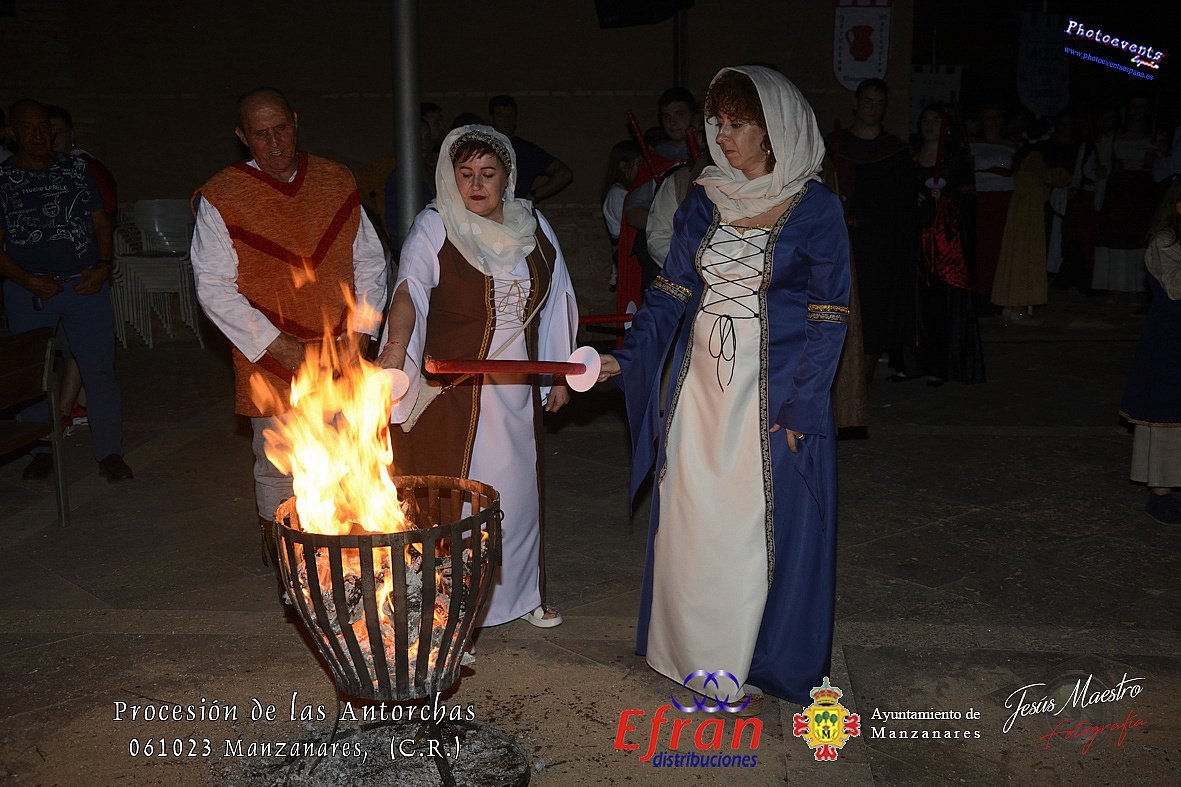 Procesión de las antorchas y nombramientos de Caballeros y Damas de la encomienda, que tenía lugar en la noche del día 061023, enmarcado dentro de los actos organizados con motivo de la realización de las X Jornadas Histórico Turísticas de Manzanares Medieval que se tienen lugar durante los días del 6 al 8 de Octubre en la localidad de Manzanares, Ciudad Real.