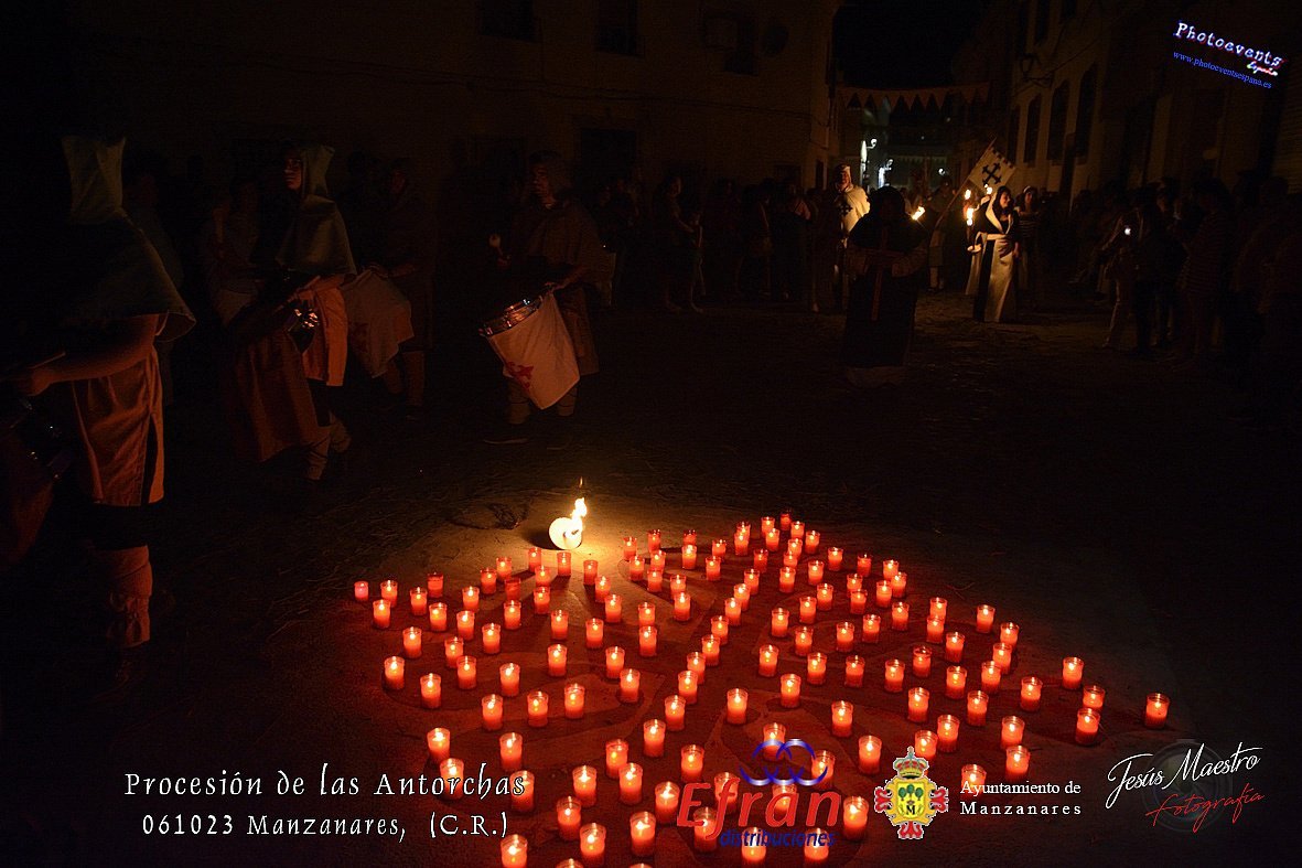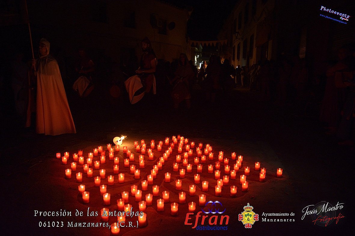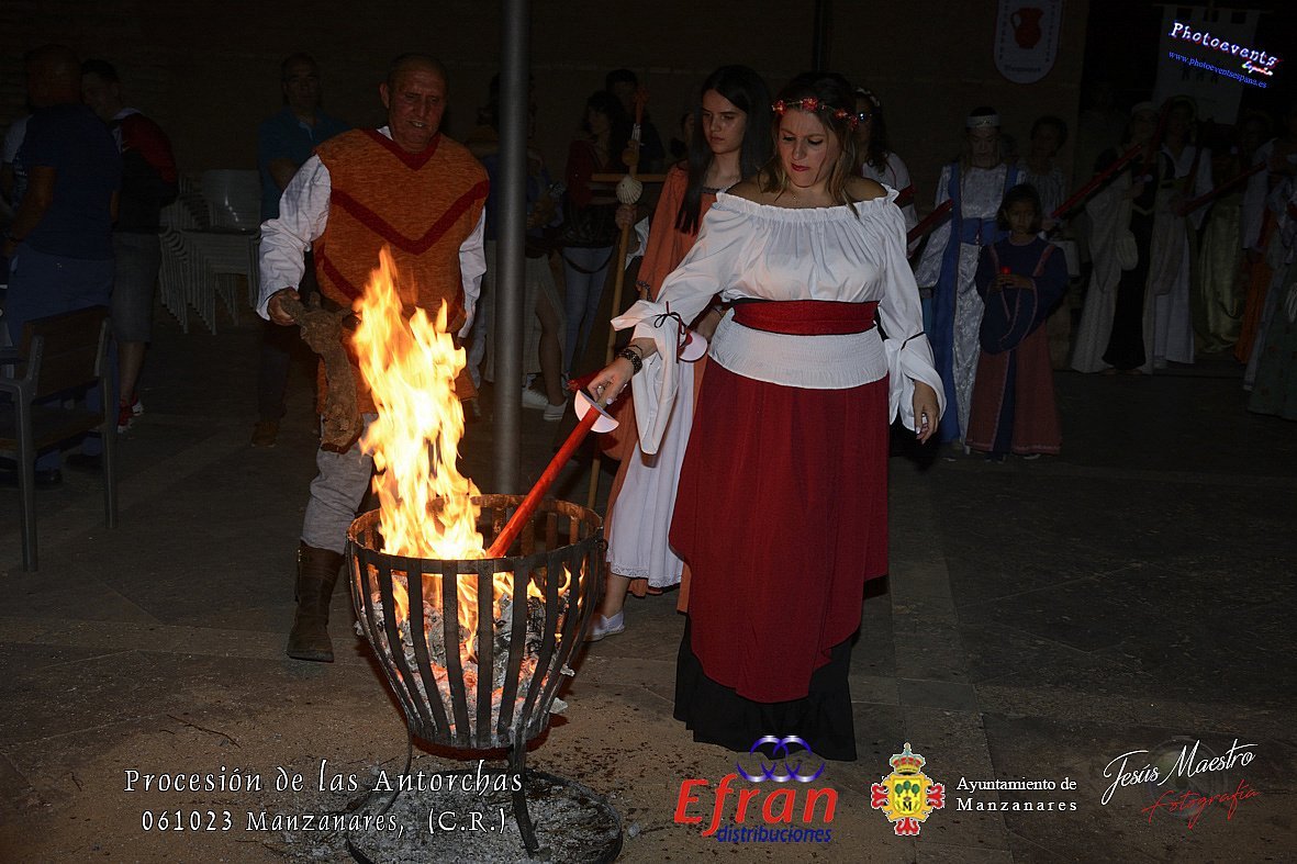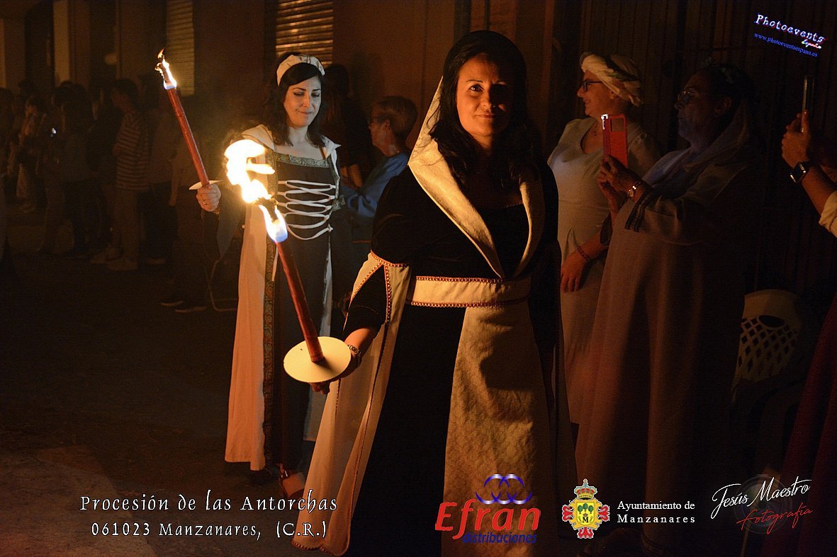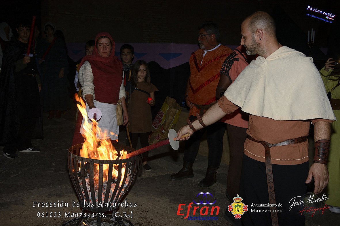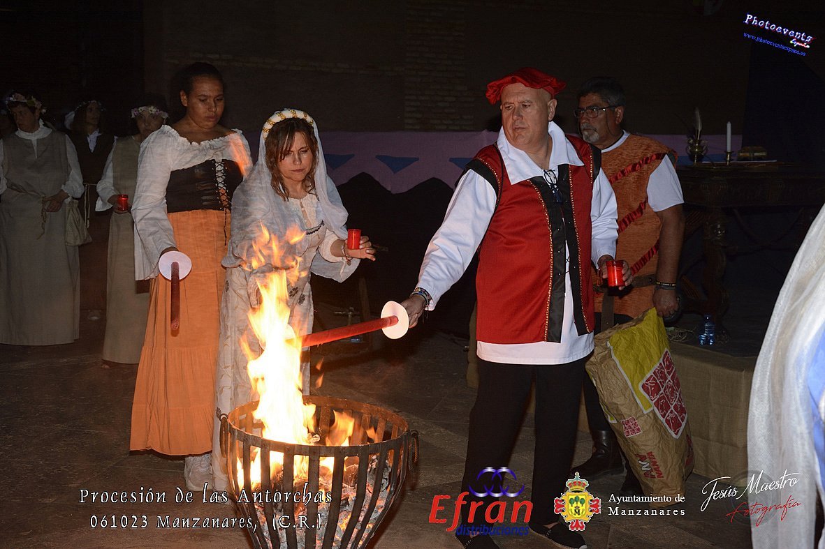 Procesión de las antorchas y nombramientos de Caballeros y Damas de la encomienda, que tenía lugar en la noche del día 061023, enmarcado dentro de los actos organizados con motivo de la realización de las X Jornadas Histórico Turísticas de Manzanares Medieval que se tienen lugar durante los días del 6 al 8 de Octubre en la localidad de Manzanares, Ciudad Real.